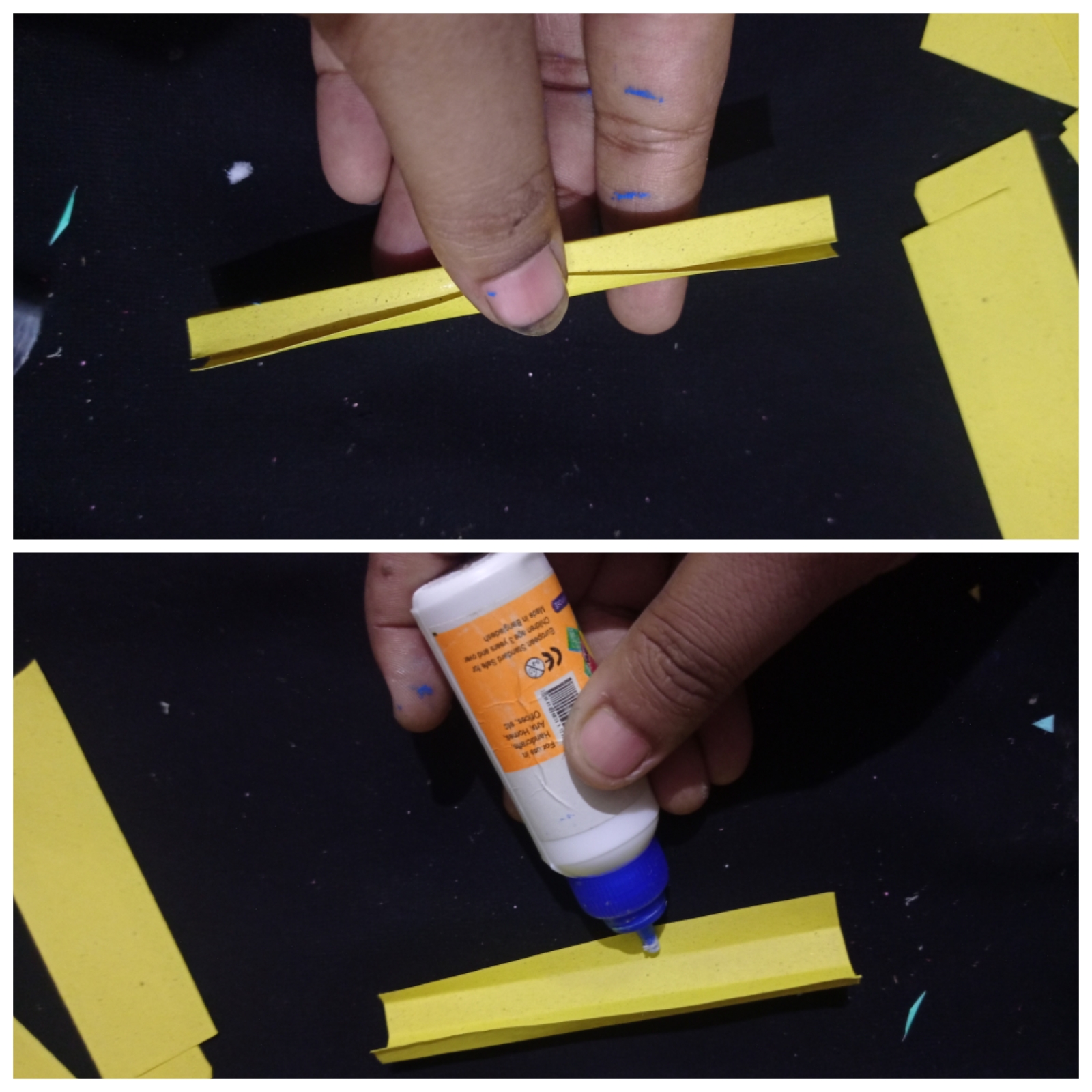 এরপর আমি চিকন করে কেটে নেওয়া কাগজটাকে চিকন চিকন করে চার ভাঁজ করি। এরপর ভাজঁগুলো খুলে একটা পাশে গাম দিয়ে জোড়া লাগিয়ে নিলাম।