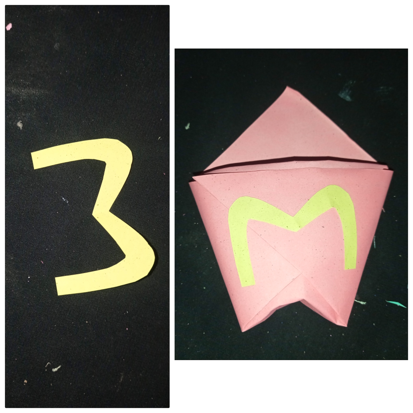 এরপর হলুদ কালার দিয়ে একটা এম এর মত করে কাগজ কেটে ওই প্যাকেটের উপরে জোড়া লাগিয়ে দিলাম।