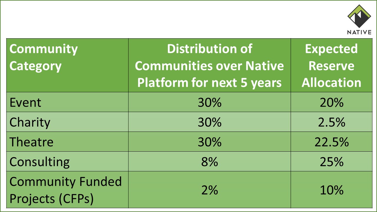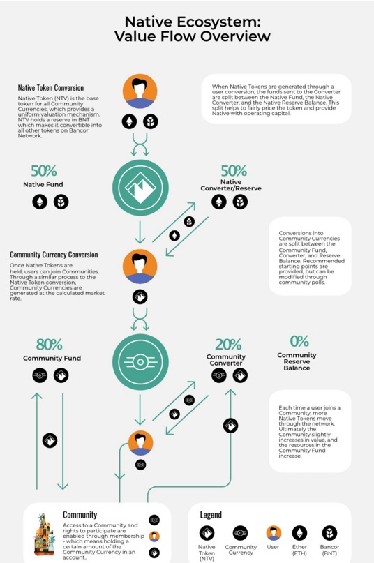 Native (NTV) will be the base token and it holds a reserve denominated in Bancor Network Token (BNT) initially. Native holds the right to change the reserve breakdown subject to the agreement of the members through a community poll. The break-up would be 50% community fund, 50% smart token converter and Native will maintain a 10% converter weight to ensure liquidity.