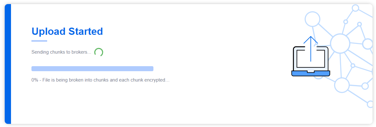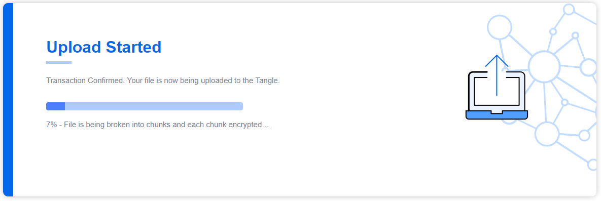 Once the transaction is confirmed, the upload process will beginn. The upload takes several minutes for a smaller file, e.g. a photo, respectively longer for a larger file (= 5 MB).