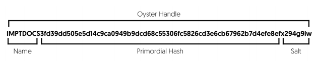 The first 8 characters of the Oyster Handle represents the name of the file. This is usually copied from the filename that was uploaded to the browser, but can also be customized by the Storage User for their own references. The Primordial Hash is a 64 character long SHA256 hash of random input that is generated from within the Storage User's browser with as much entropy as possible. The last 8 characters of the Handle is the cryptographic salt that differentiates the Primordial Hash from the overall encryption key. The salt is used to further protect the data in case the Primordial Hash is found because of a future weakness in a hash function or a rainbow table attack on the Genesis Hash. Therefore the entire 80 character long Handle is the entire encryption key used to encrypt and decrypt the split parts of the data.