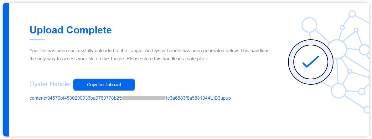 When to upload is completed, the following message will show: "Your file has been successfully uploaded to the Tangle. An Oyster handle has been generated below. This handle is the only way to access your file on the Tangle. Please store this handle in a safe place."