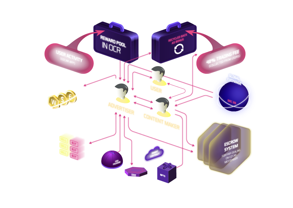 The Ozcar app is based on a decentralized social network that connects the gap between influential people, artists, content creators, movie makers, advertisers and users to promote creativity. It has a decentralized structure that uses blockchain technology for marketing, remuneration, participation, contribution, payment clearing and rollover. It simply means that Ozcar members will be directly rewarded and paid to OCR for their contributions.