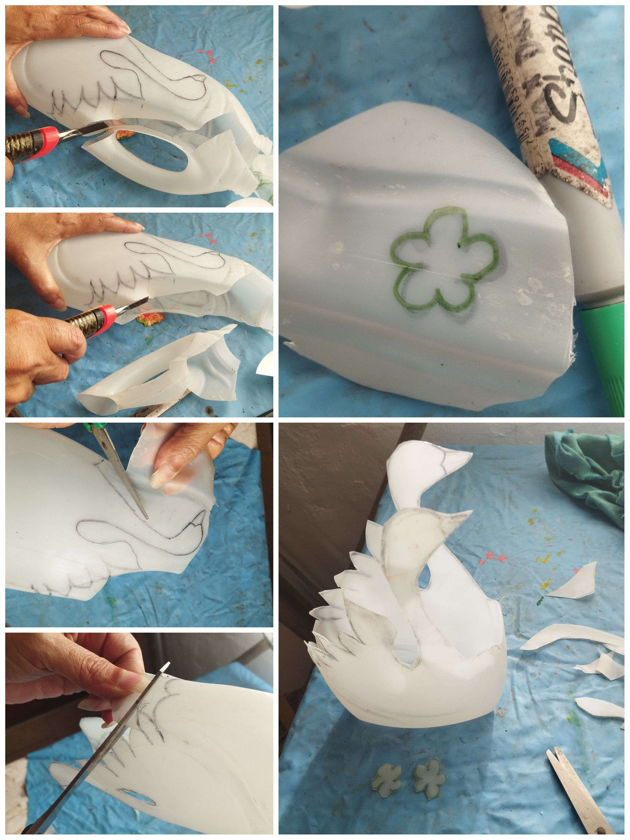 Con ayuda del cutter fuí desechando plástico que no necesitaba para luego rematar con las tijeras, necesité de ambas y así obtener una bonita forma, dibujé unas florecitas y las corté.