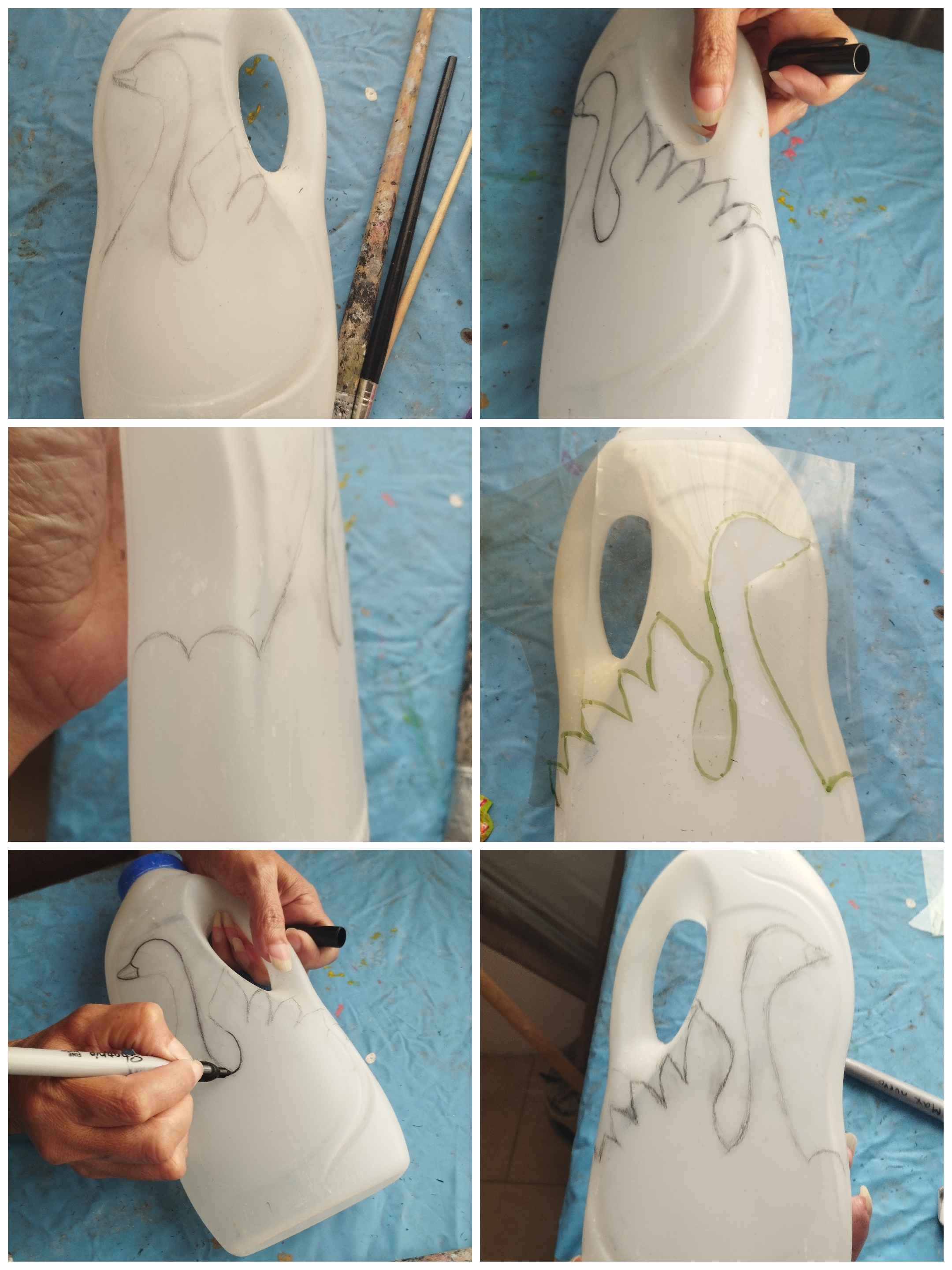 Inicié organizando los materiales, dibujé el primer cisne de un lado de la botella, remarqué con marcador negro y calqué con la hoja transparente para luego marcar del otro lado de la botella.