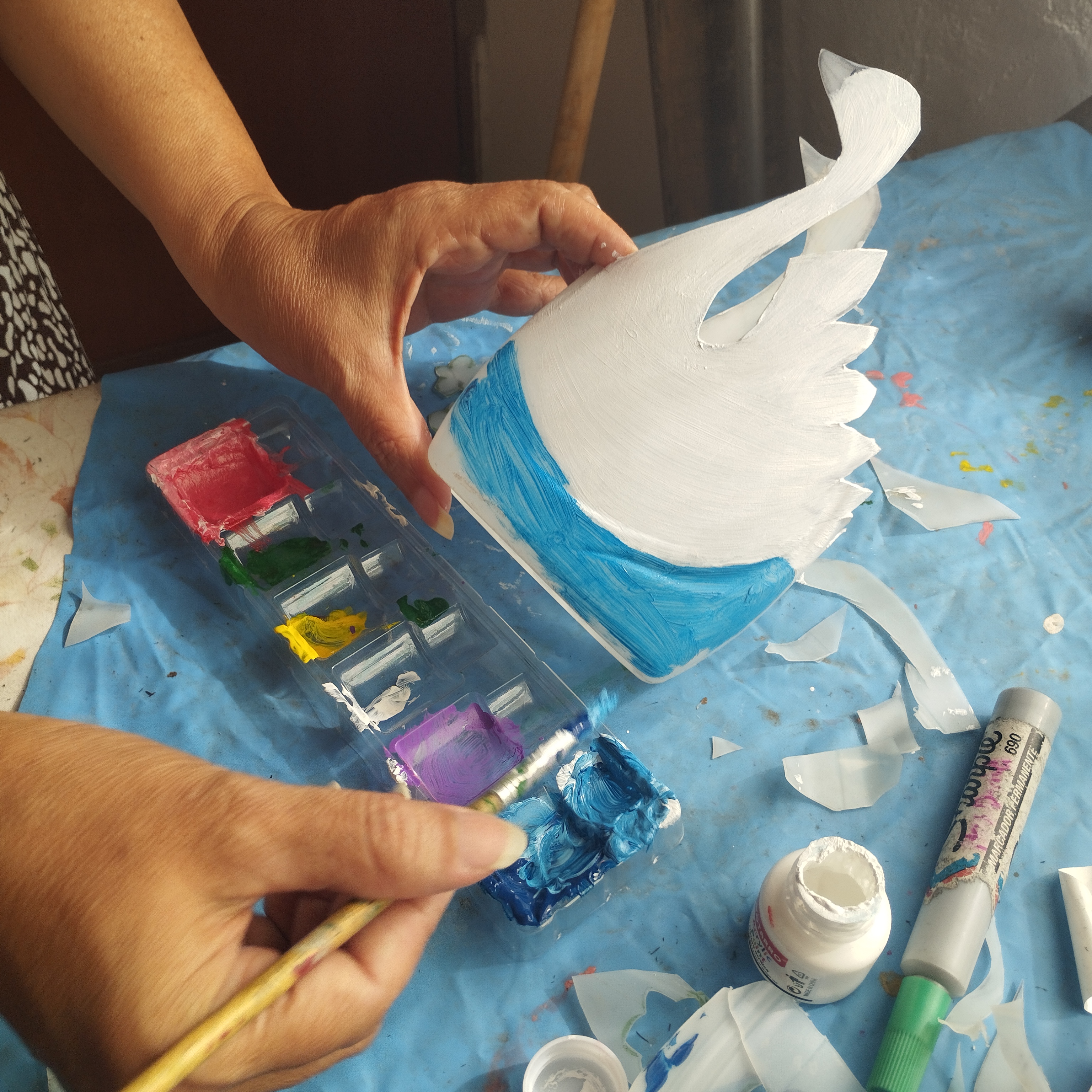 Finalmente le llegó el turno a las pinturas, apliqué el color blanco con pinceles medio y fino, en las figura de cada cisne, procurando secar un lado para iniciar con el otro, apliqué segunda capa.