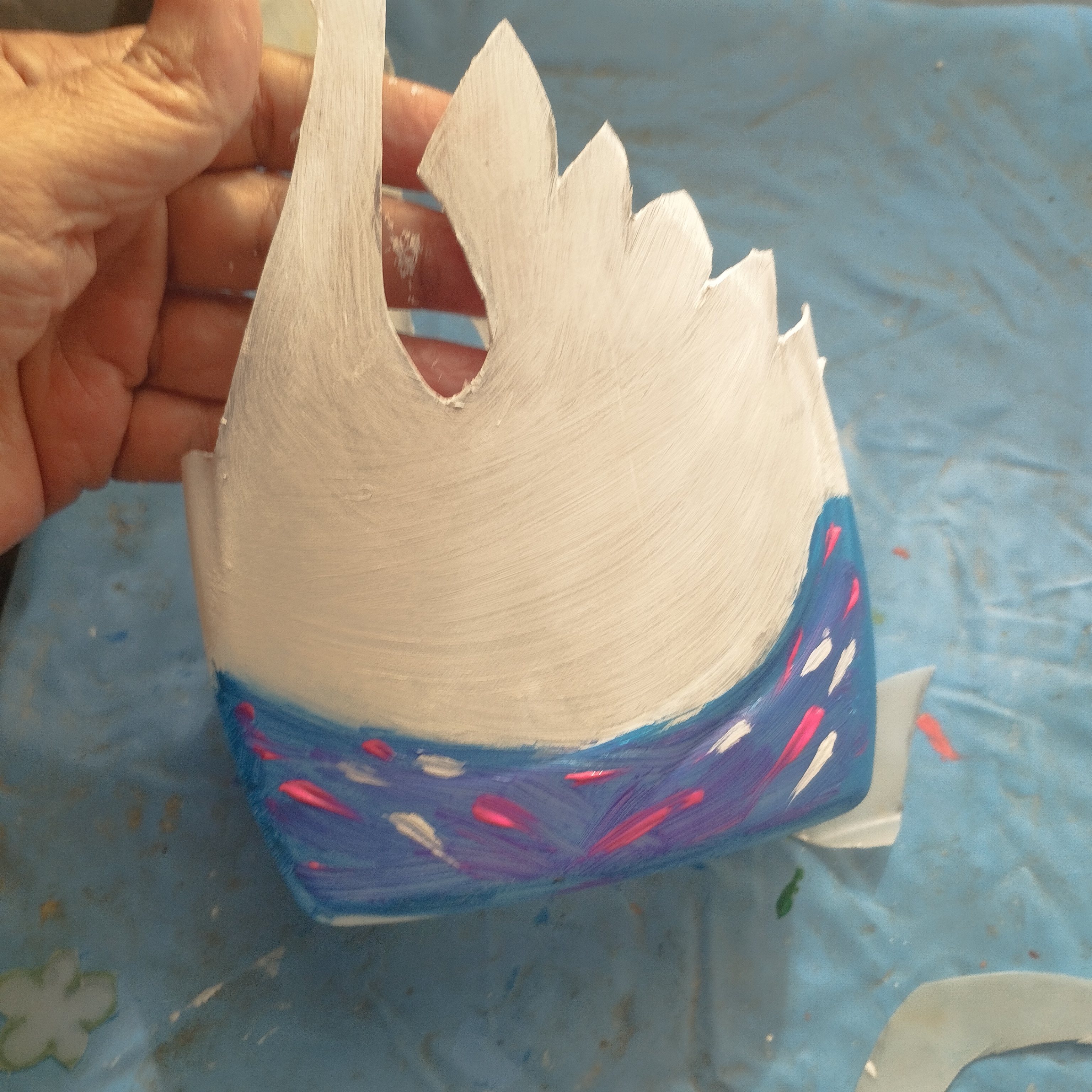 Seguidamente apliqué una mezcla de azul con blanco para lograr un azul menos oscuro, pequeñas pinceladas de rosado fuerte y morado, traté de esparcir un poco esta última, unas pinceladas de blanco, sinceramente me estaba divirtiendo y jugando con mi imaginación.