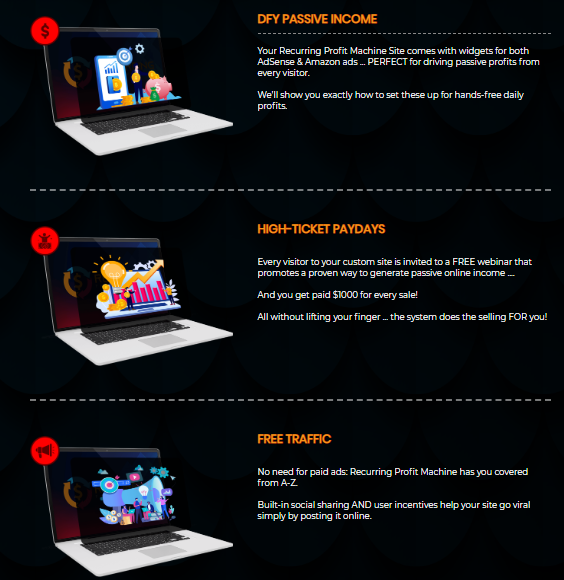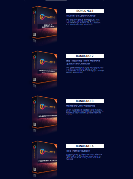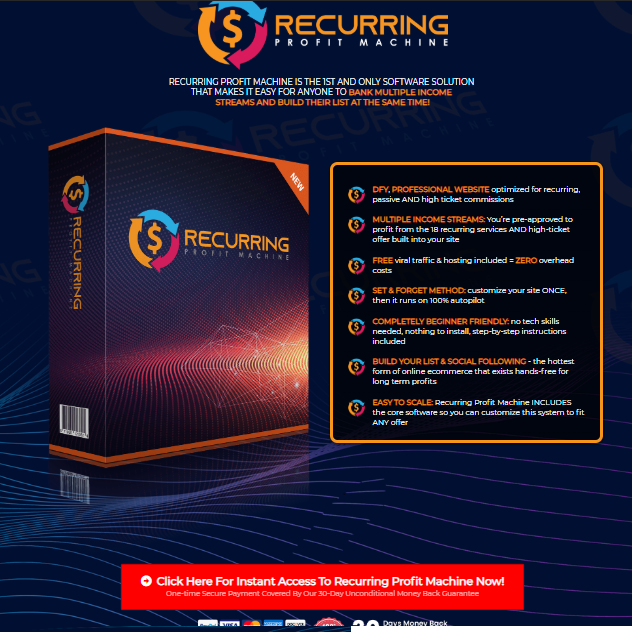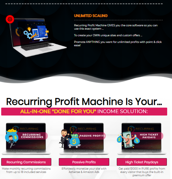 Recurring Profit Machine is a 100% DONE FOR YOU website, software & system that includes multiple monetization methods … where you can earn simply by sharing valuable information & offers with prospects.