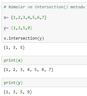 Örneğimizde x ve y adında iki küme oluşturup benzer ve farklı elemanlar yerleştirdik. intersection() metodunu kullandığımızda bize iki kümenin de ortak olan elemanlarını getirdi.