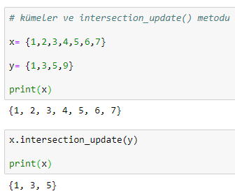 Ancak intersection_update() metodu bu durumu değiştirmektedir. Uygulamasını görelim :