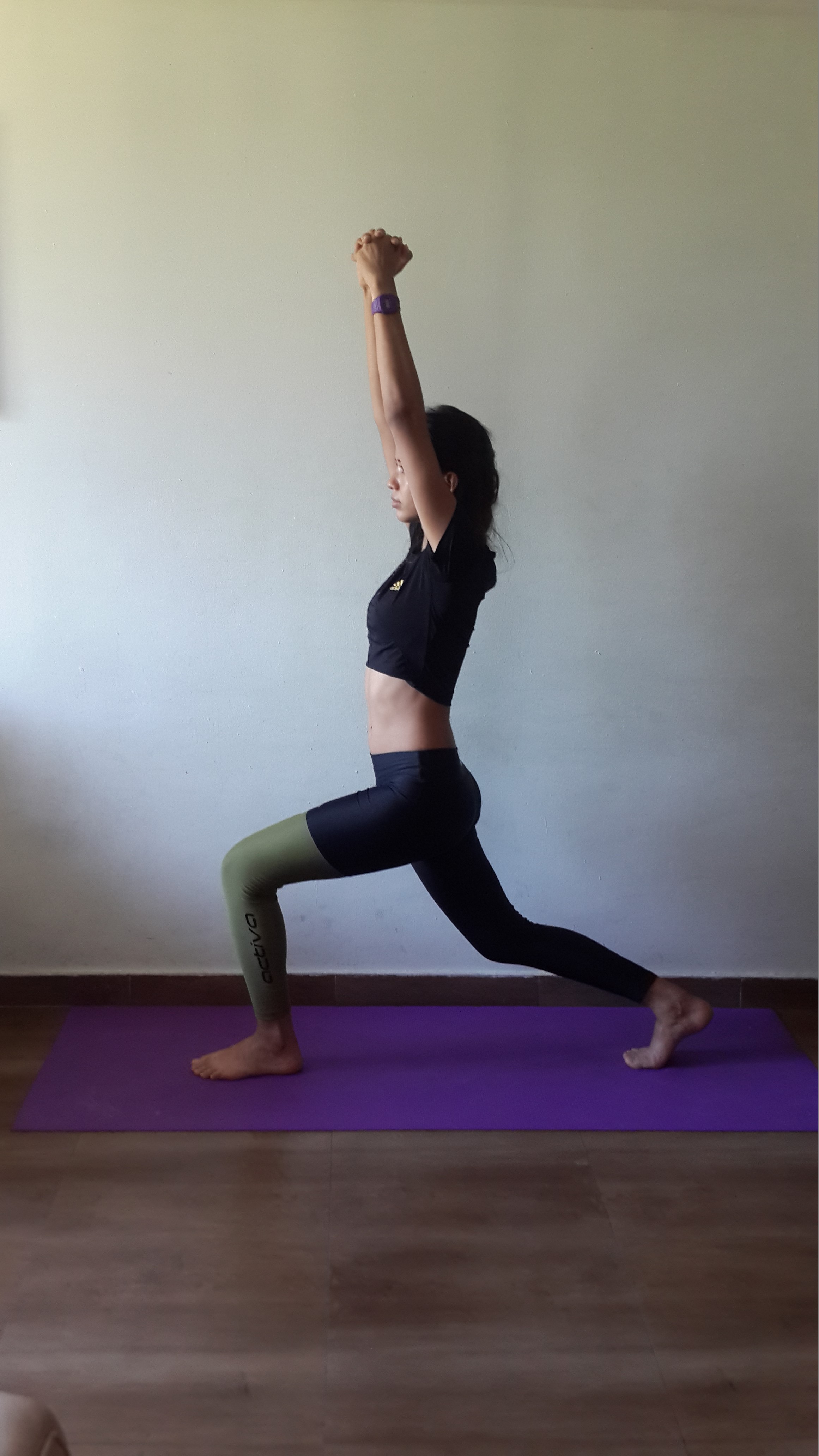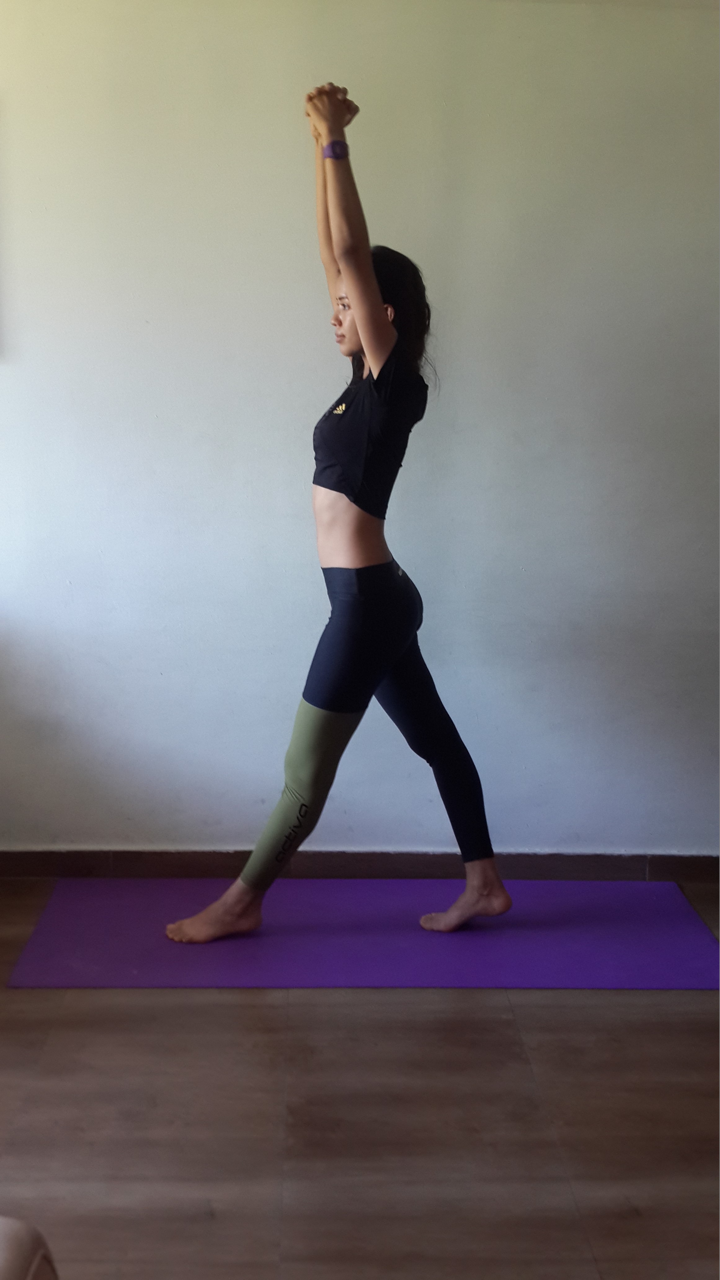 You stretch your hands over your head for this exercise. Then you make a medium sized - big step forward.