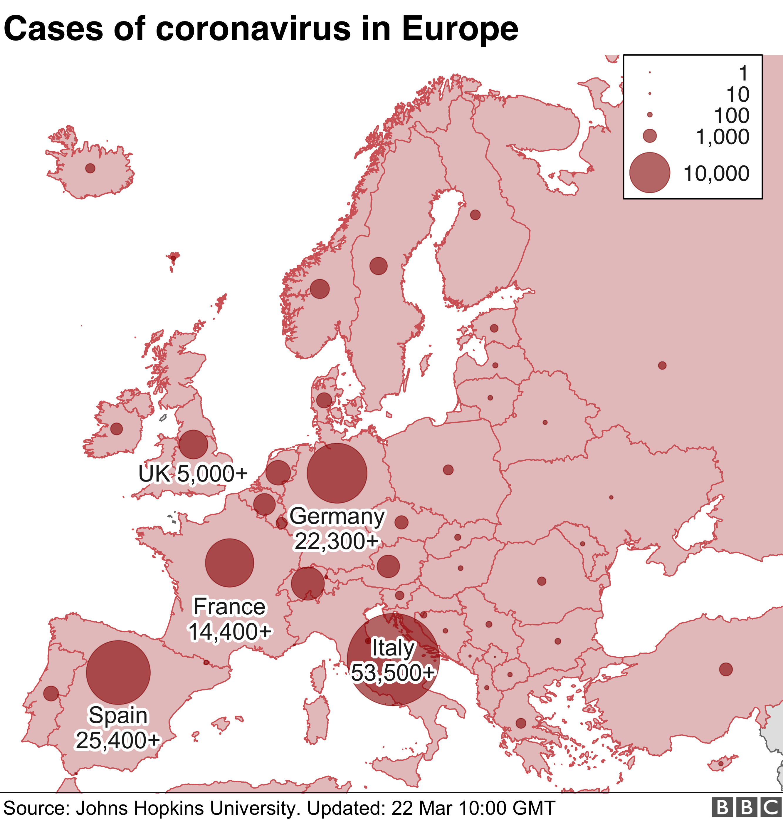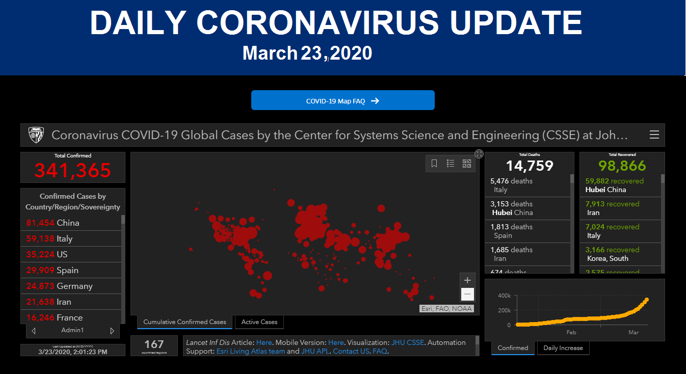 As of March 23, 2020 there exist 341,329 coronavirus cases among which 14,746 people have died. The total number of around the world was 13,686 yesterday which mean the number of death has increased by 13% since yesterday. Romania, Bulgaria, Guam, Dominican Republic and Palestine have confirmed first death caused by the Coronavirus.