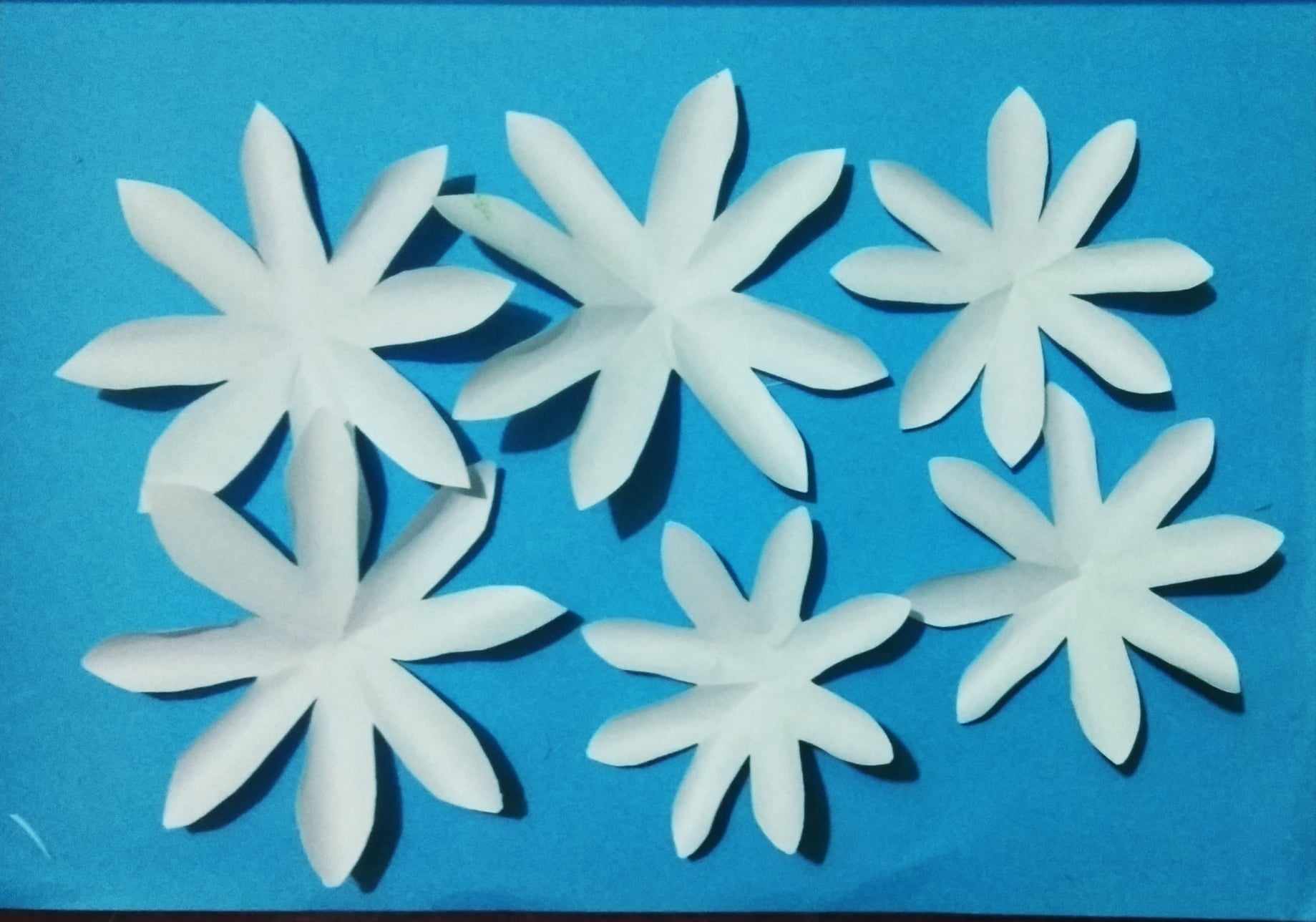 কেটে নেয়া কাগজের টুকরোগুলোকে ভাঁজ করে নিয়ে পাপড়ির মতো এঁকে নিয়েছি। এবং দাগ বরাবর কেটে নিয়েছি। একইভাবে সবগুলো কাগজ ফুলের মতো করে কেটে নিয়েছি।