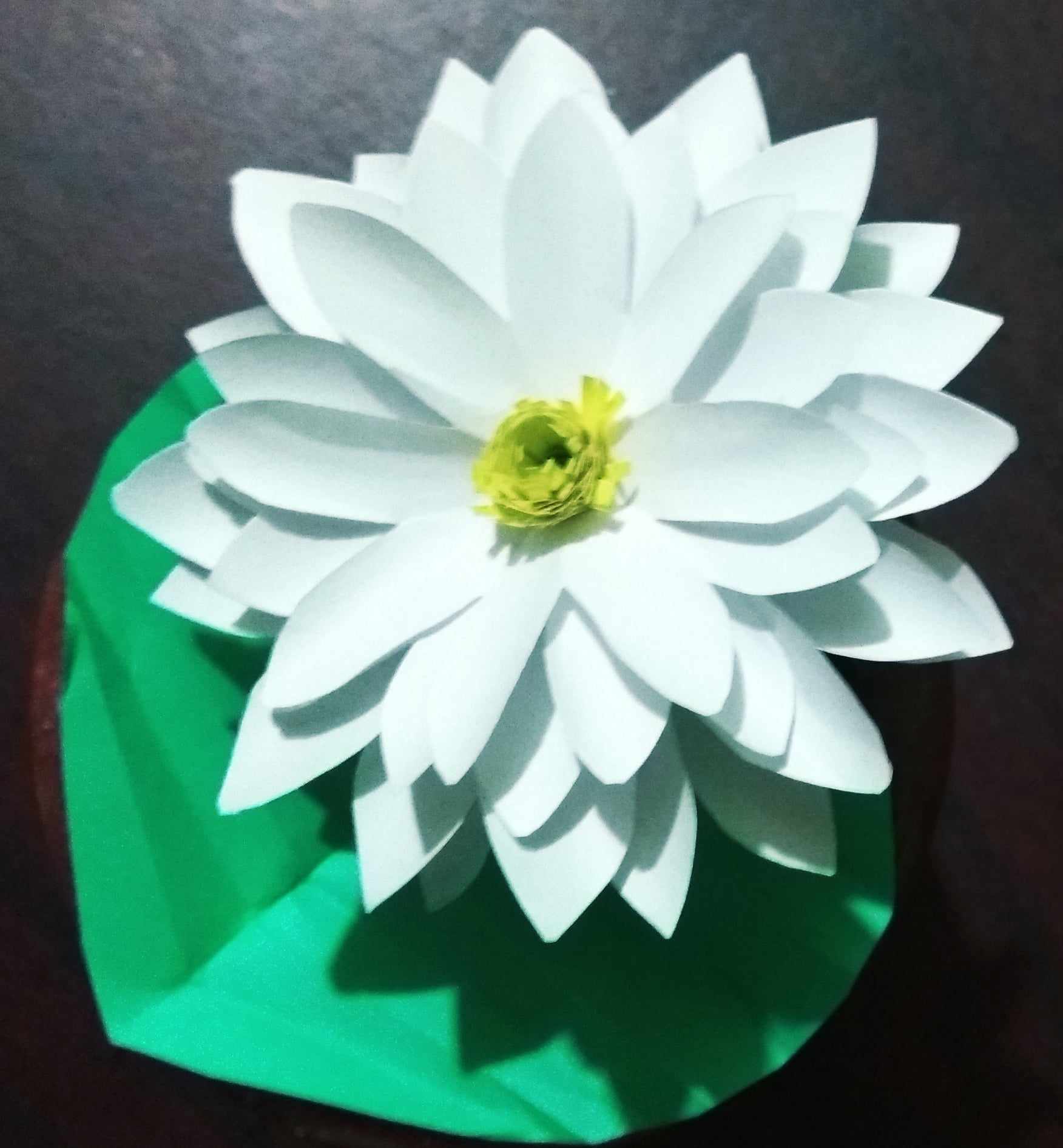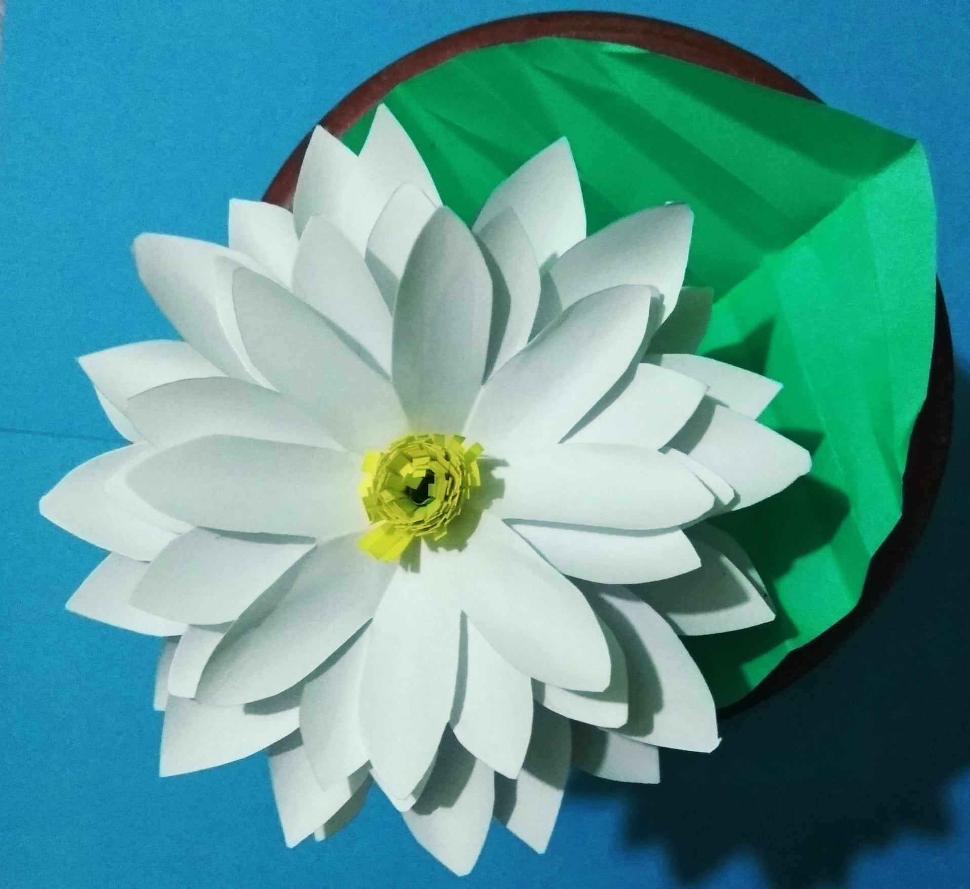 এবার পাতাটি গাম দিয়ে ফুলের ডালের সাথে লাগিয়ে নিয়েছি। ব্যস তৈরি হয়ে গেল পাতা সহ শাপলা ফুল।