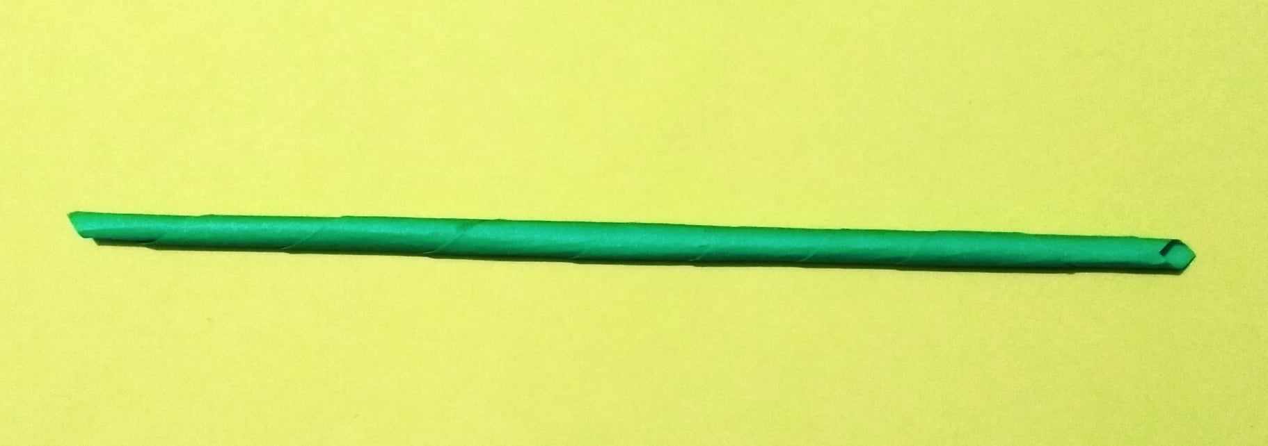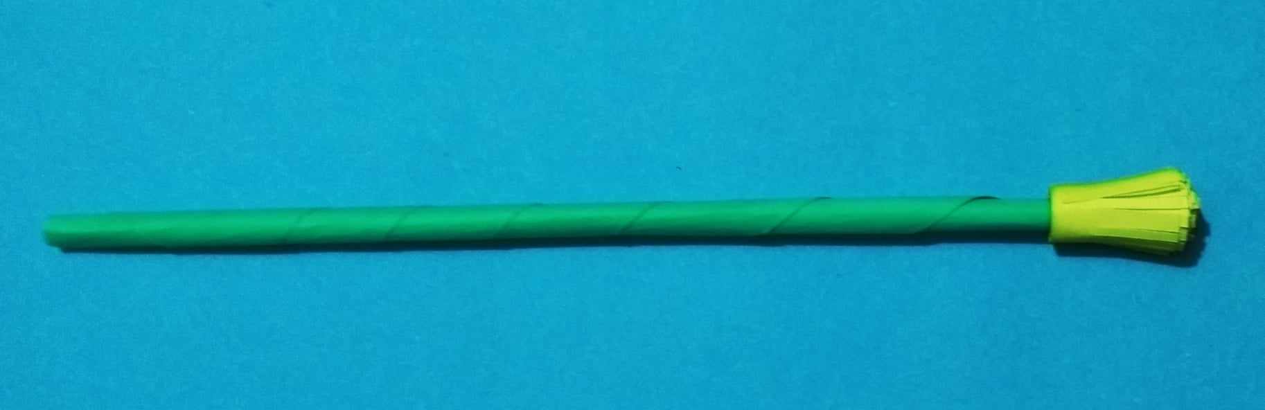 সবুজ রং এর কাগজ চিকন করে কেটে নিয়েছি ফুলের ডাল তৈরি করার জন্য। কেটে নেয়া কাগজটি প্যাচিয়ে ডাল বানিয়ে নিয়েছি।