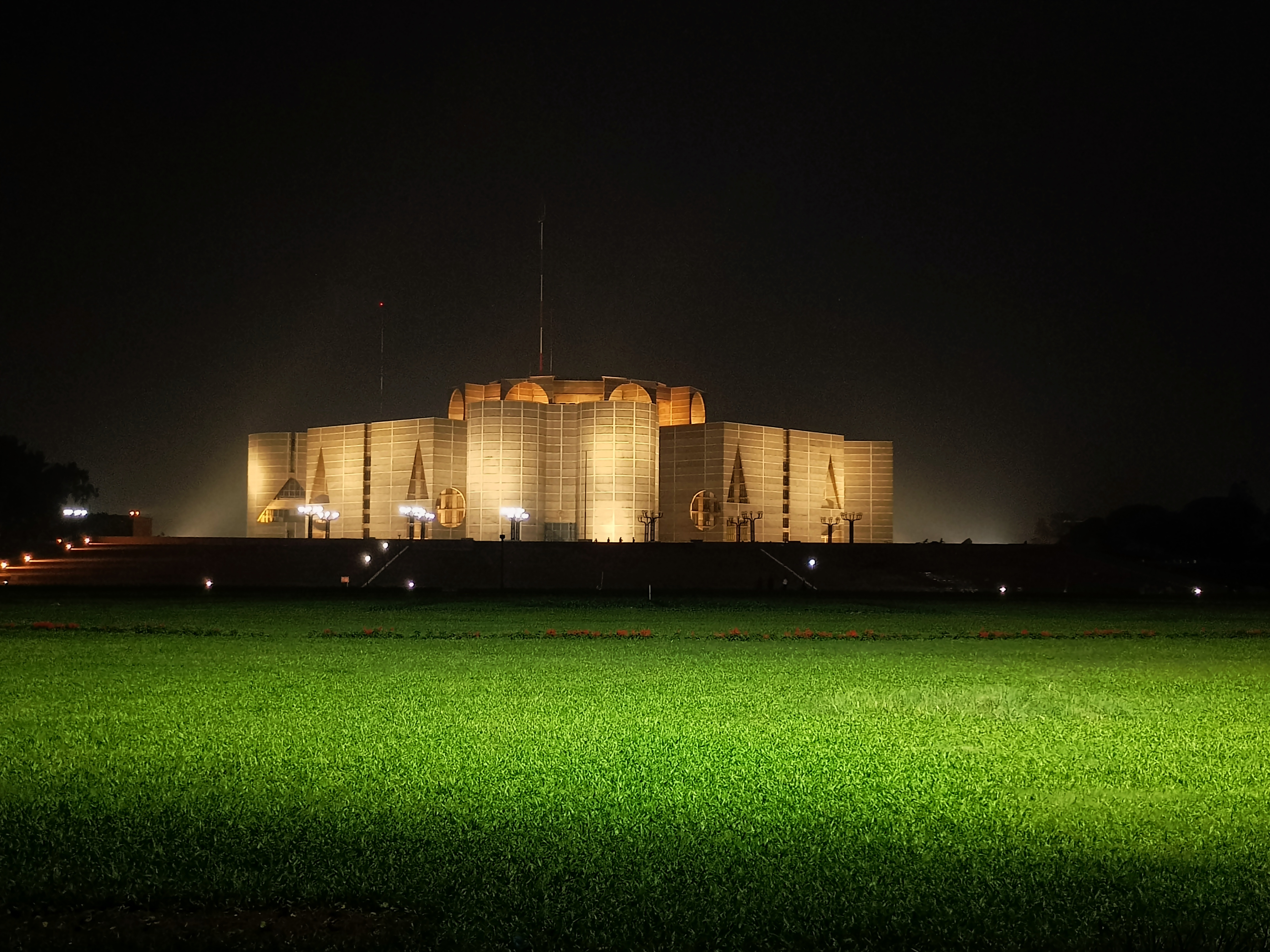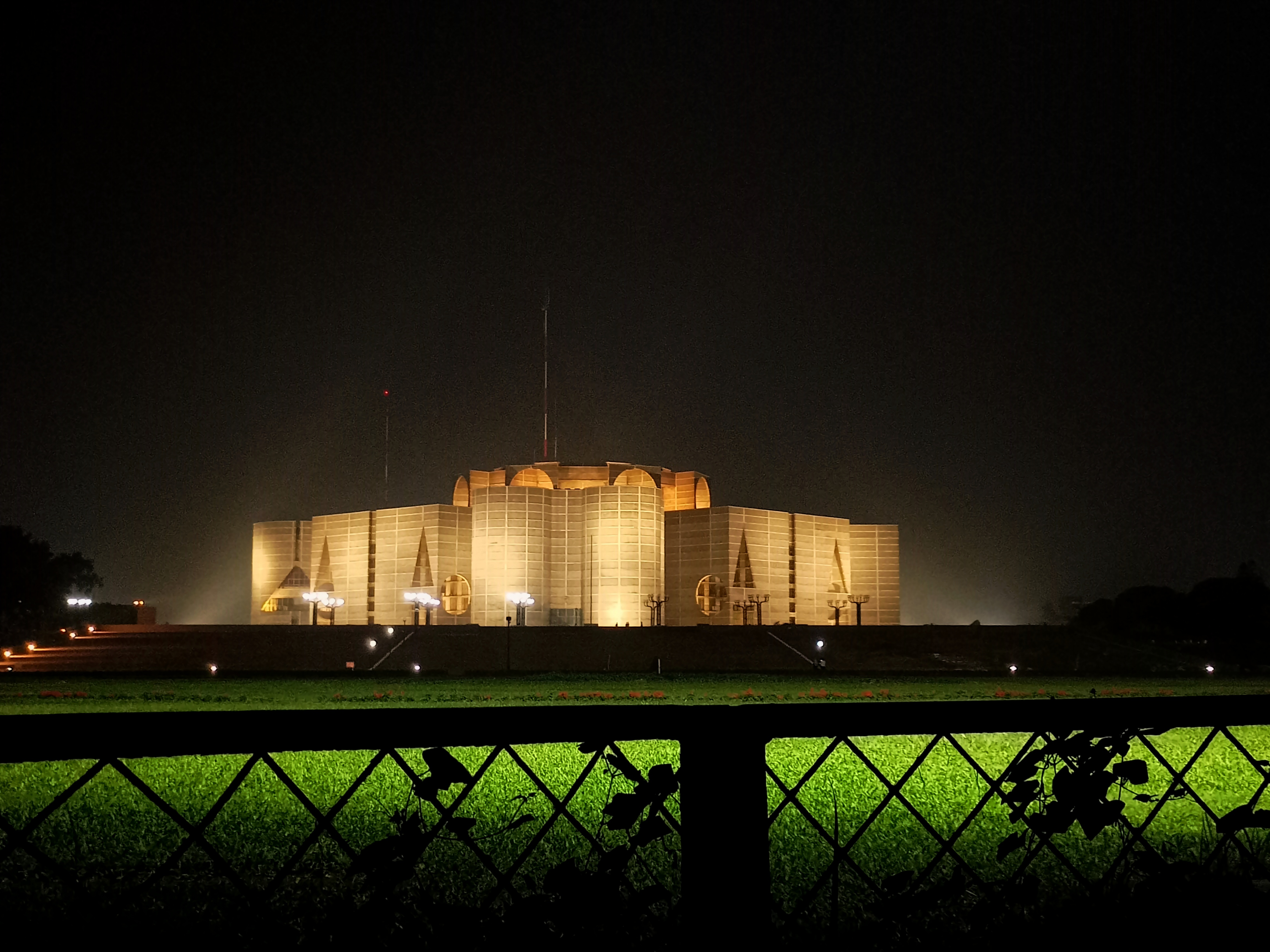 আমারা ৫০০ মিটার হাঁটলে সংসদ ভবন পেয়ে যাব। রাস্তার অন্য লাইনে দেখলাম প্রচুর গাড়ির চাপ সবগুলো দাঁড়িয়ে আছে তা বাস থেকে নেমে ভালোই করেছি। পাঁচ মিনিট হাঁটার পরই সংসদ ভবনের এরিয়াতে চলে আসি। রাতের বেলা সংসদ ভবনটার আশেপাশের পরিবেশটাও বেশ সুন্দর । চারিদিকে লাইট এবং রাতের বেলার যে আলাদা সৌন্দর্য আছে সেটা বেশ ভালই বোঝা যাচ্ছিল। একটি গাছের উপর ল্যাম্পপোস্টের আলো পড়েছে কৃষ্ণচূড়া সবুজ পাতা মোড়ানো গাছটি দেখতে অসম্ভব ভালো লাগছিল। এই যদি কৃষ্ণচূড়া ফুল থাকতো তাহলে আরো বেশি ভালো লাগতো।