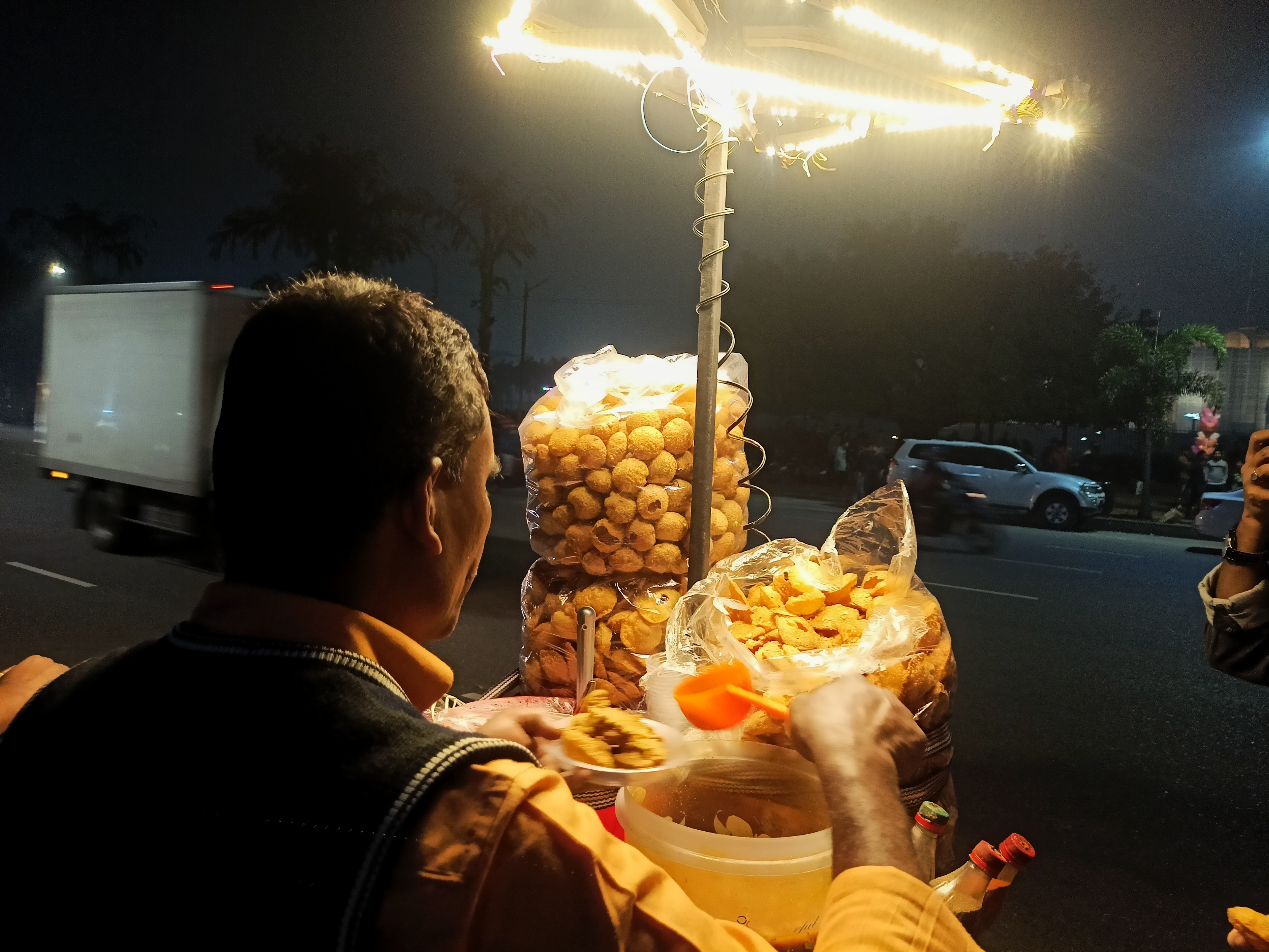 এখানে দাঁড়িয়ে অনেক কিছু খেয়েছিলাম তো সবকিছু ছবি তোলা হয়নি। চলে আসার ঠিক আগ মুহূর্তে ফুচকার দোকানে গিয়ে ভেলপুরি খাইলাম। এর আগে কখনো ভেলপুরি খাওয়া হয়নি তাই একটু ট্রাই করাই যায়। তবে খেয়ে অভিজ্ঞতা বেশ ভালই ছিল টেস্টটা মোটামুটি ভালোই লেগেছে। আস্তে আস্তে রাত গভীর হচ্ছে আমরা আর বেশি সময় এখানে থাকবো না। আমাদের সাথে যে ছোট ভাই দেখা করতে এসেছিল তাকে বললাম চলো যাই আমাদের বাসায় সেও রাজি হয়ে গেল। আজকে রাতে প্রচুর আড্ডা দিতে হবে যে আমরা বাসার দিকে হাঁটা শুরু করি।