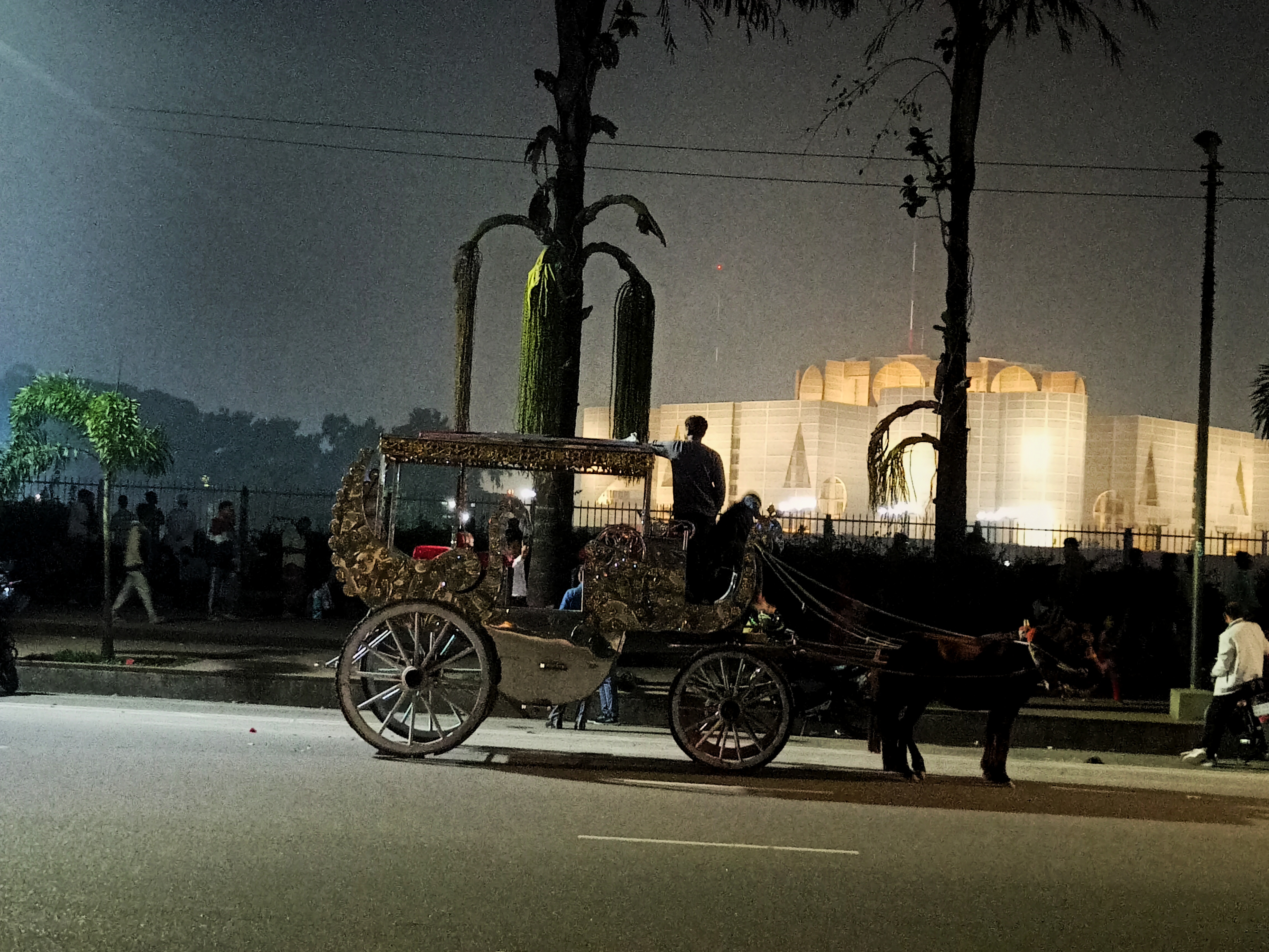 হঠাৎ চোখে পরে রাজকীয় স্টাইলের ঘোড়ার গাড়ি দাঁড়িয়ে আছে সংসদ ভবনের সামনে। আর আমি যদি রাজা হতাম তাহলে এই ঘোড়ার গাড়িতে উঠে একটু ঘোরাঘুরি করতাম। দূর থেকে দেখতে বেশ ভালো লাগছিল গাড়িটি তবে আলোর স্বল্পতা থাকার কারণে ভালো ছবি উঠাতে পারিনি। তারপর আমরা বাসার দিকে রওনা করি অনেক তো ঘুরাঘুরি হলো এখন তো বাসায় যেতেই হবে। মাঝেমধ্যে এমন ঘোরাঘুরি করতে আসলেই বেশ মজা লাগে ।তবে এই ব্যস্ততম নগরীতে বের হতেও ভয় হয়। অল্প পথ যেতে অনেকটা সময় লেগে যায় আর আমার জ্যাম জটে বসে থাকতে অনেক বেশি বিরক্ত লাগে। তবে আজকের সময়টা বেশ ভালো ছিল অনেক মজা করেছি। আজ এই পর্যন্তই দেখা হবে অন্য কোন পোস্টে ভিন্ন কোন গল্প নিয়ে ধন্যবাদ সবাইকে।