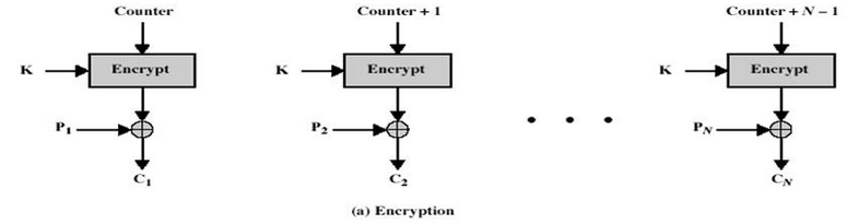 计算器模式不常见,在CTR模式中, 有一个自增的算子,这个算子用密钥加密之后的输出和明文异或的结果得到密文,相当于一次一密。