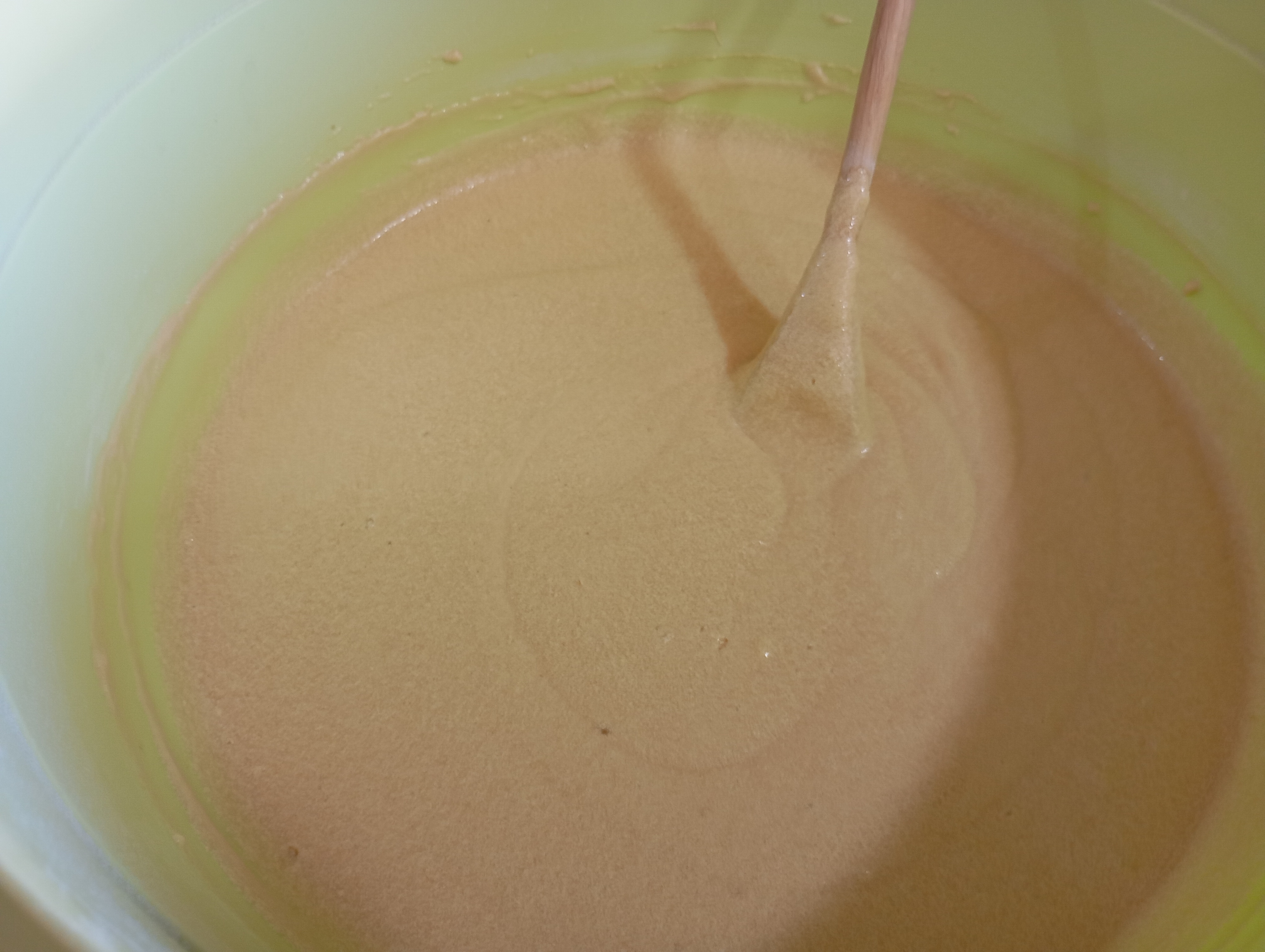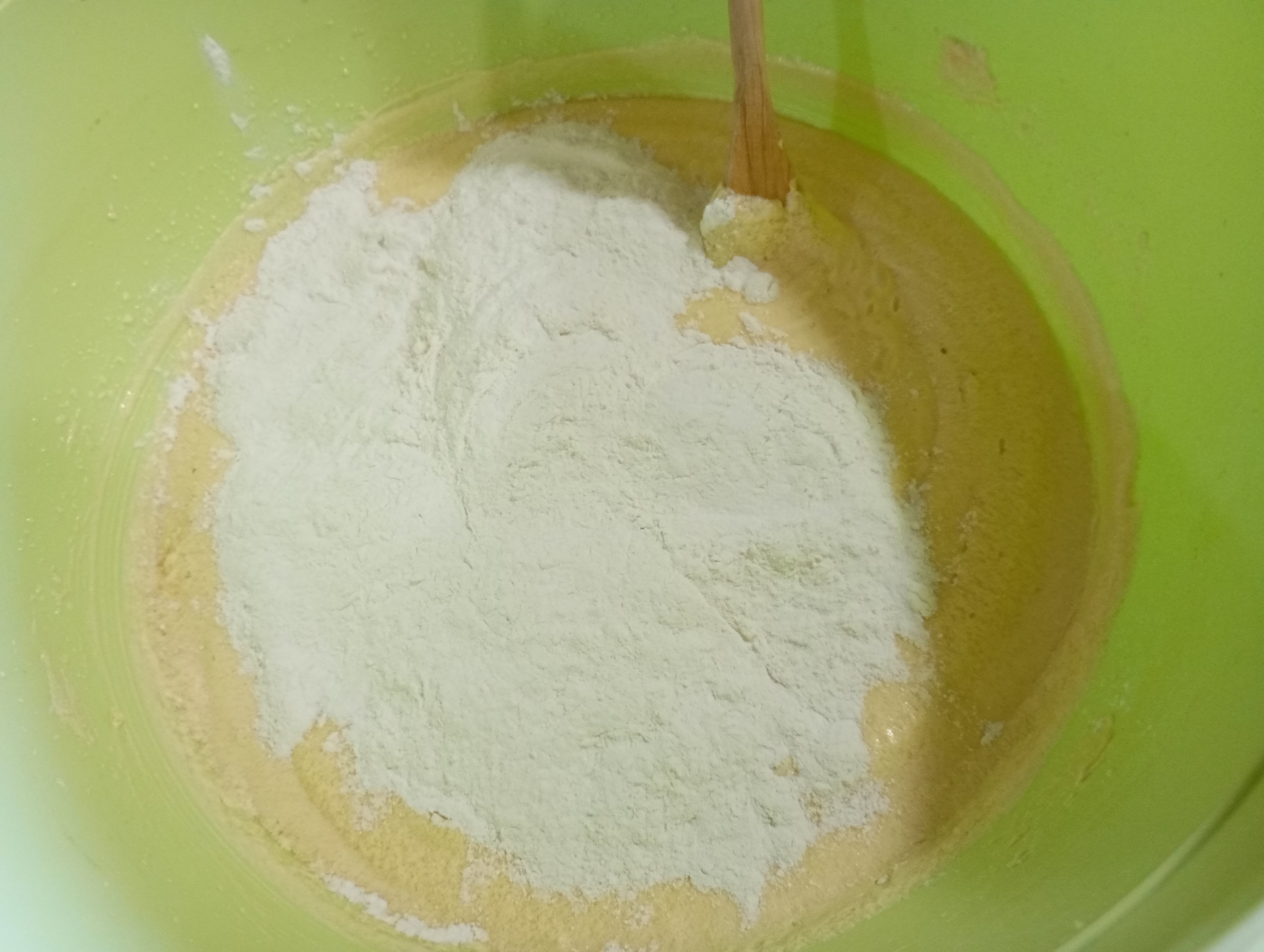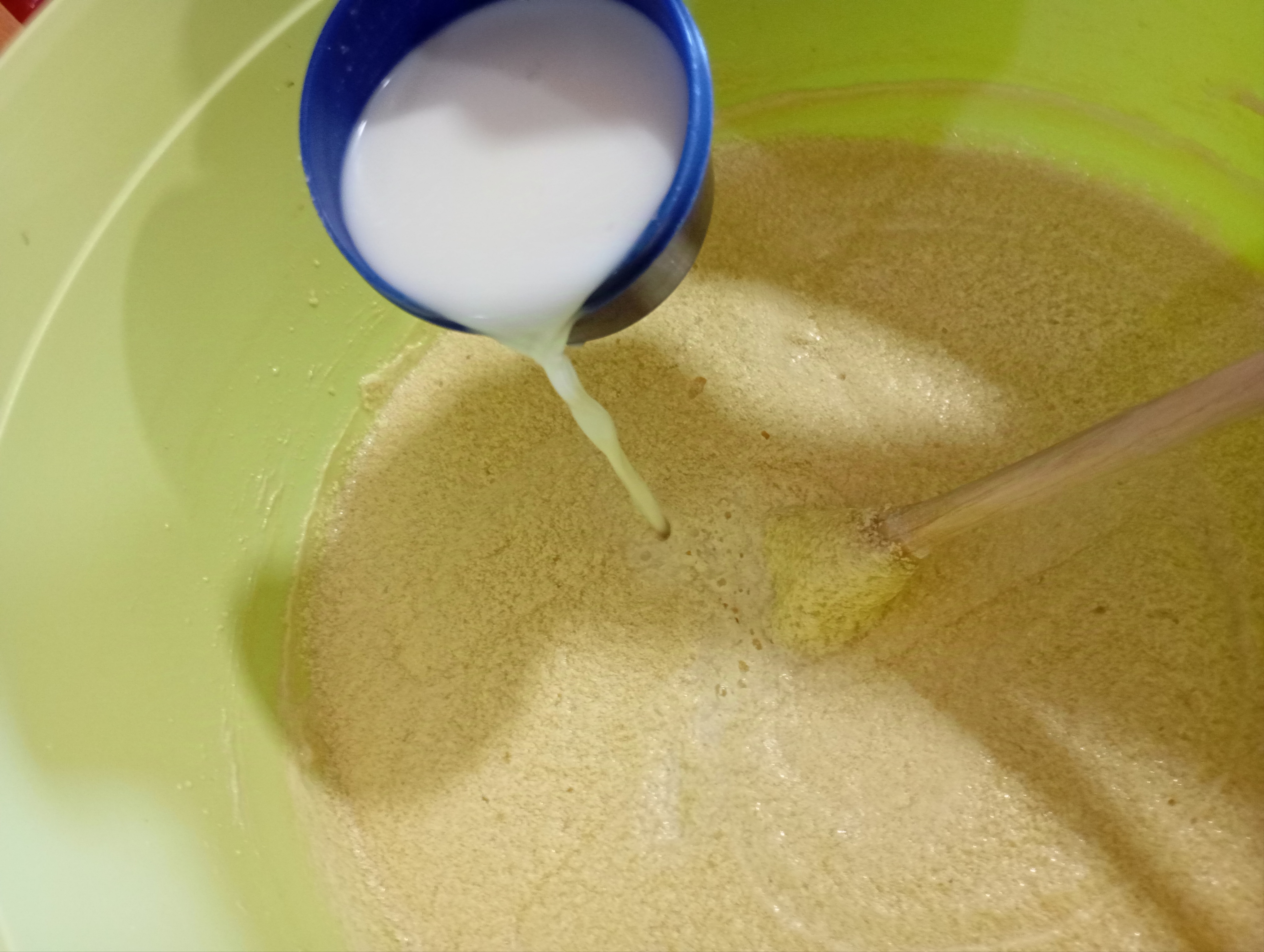 Luego agregué los huevos, cuando ya todo está bien integrado y bien aireada mi mezcla, voy agregando la harina (ya teniendo colocado el polvo de hornear y bicarbonato), intercalando con la leche, esto lo mezclo en forma envolvente con una paleta de madera, ya que no se debe batir, sino mezclar de manera envolvente.