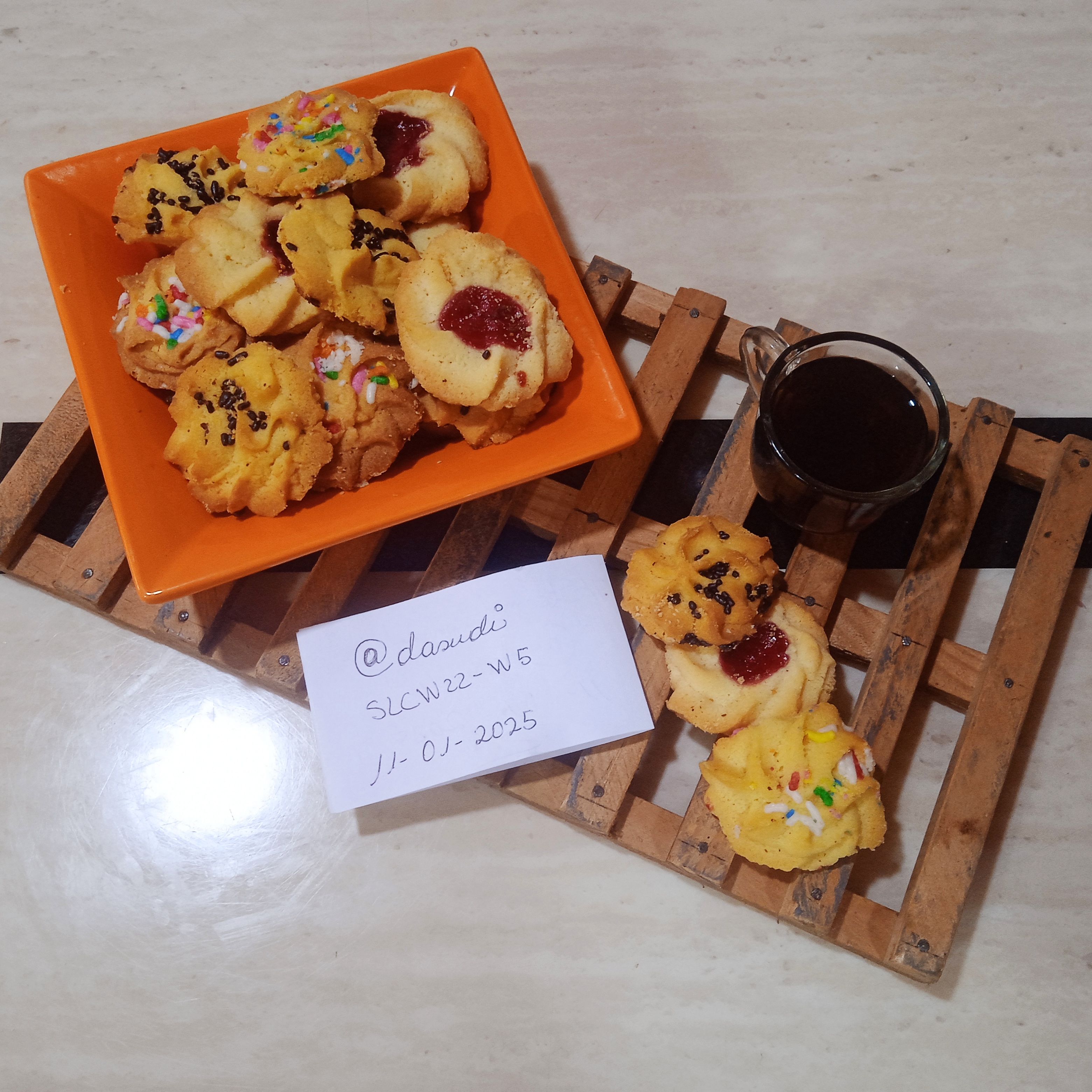 Incluir un cartel de identificación manuscrito, junto a sus galletas tipo "Pasta Seca", que contenga nombre de usuario y fecha.