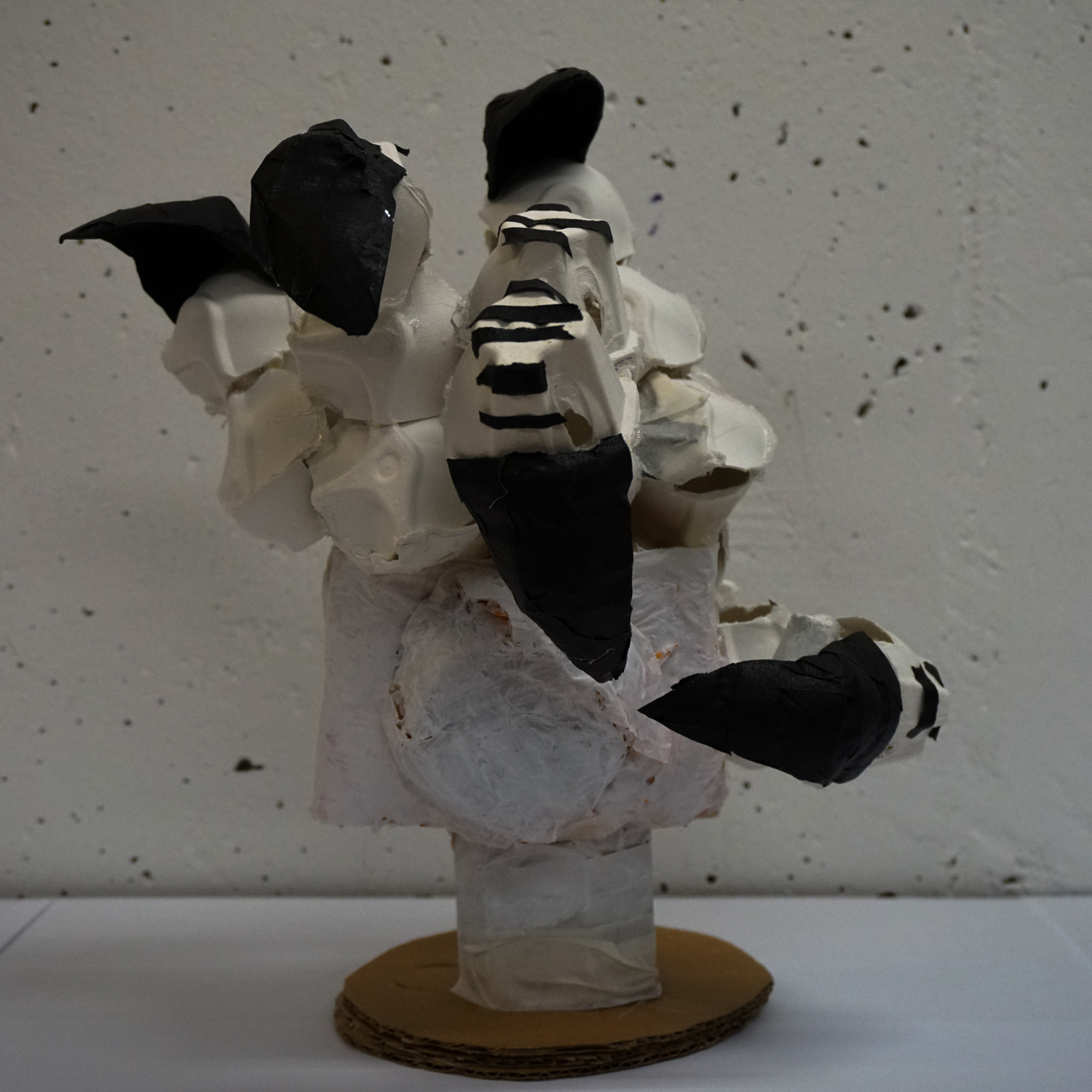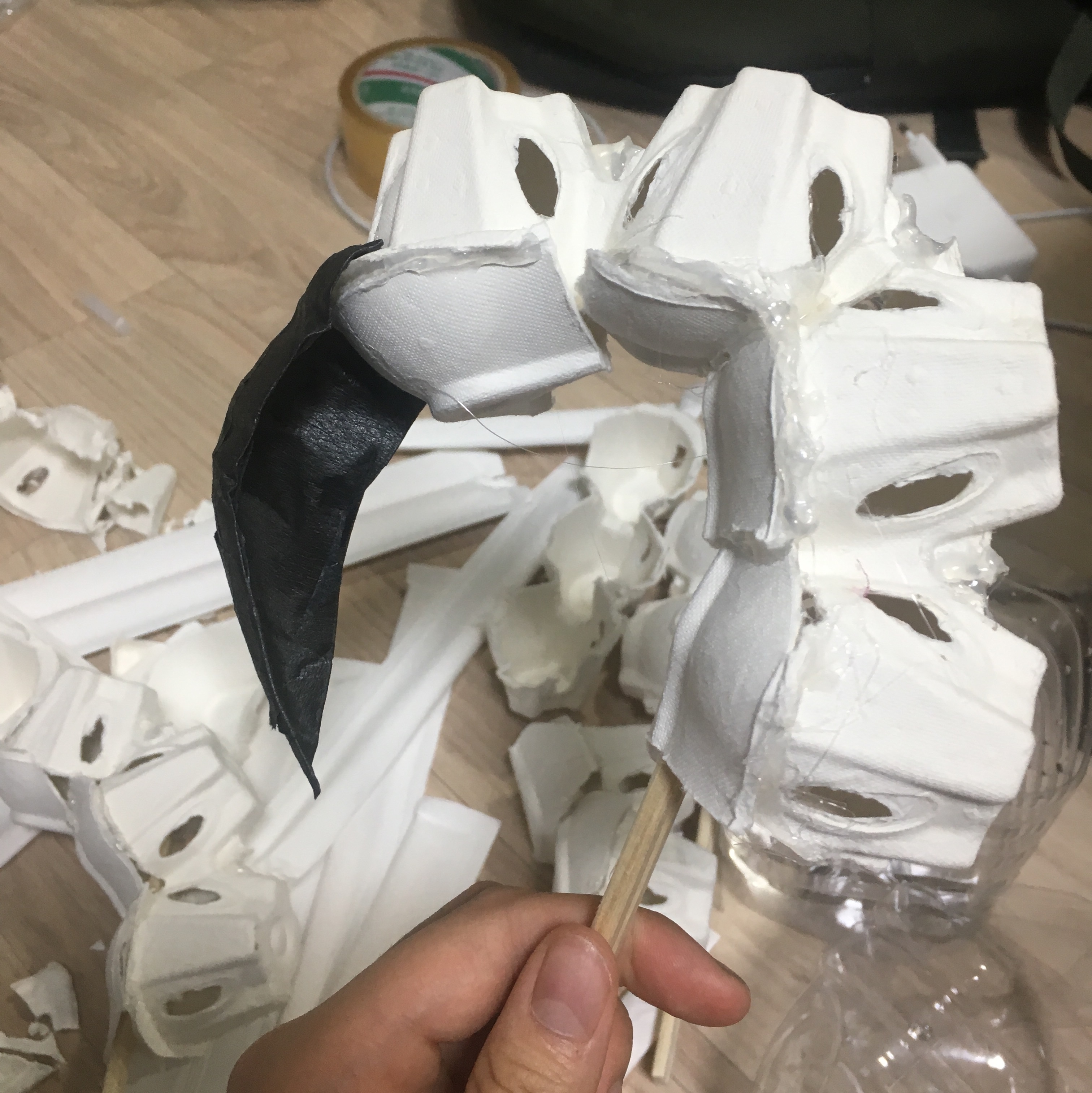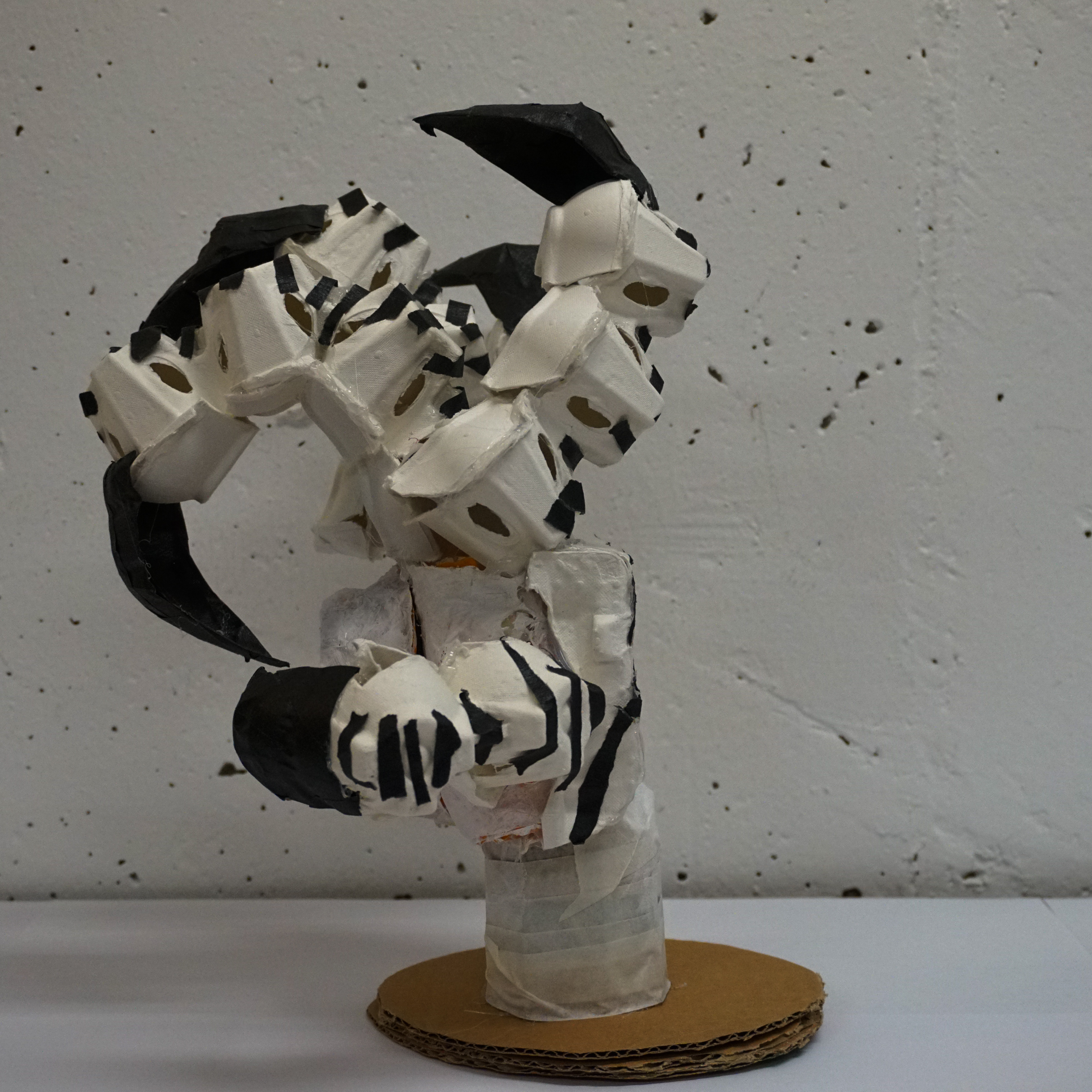 나는 나의 손가락을 튀기려고 하는 바로 직전의 찰나를 사진으로 찍었다. 힘이 잔뜩 들어가있는 발가락을 원했다. 집에서 계란을 먹고 남은 텅 빈 계란판 2개를 가지고 발가락을 만들었다. 용의 발은 새와 비슷한 발가락에 매의 발톱, 호랑이의 주먹을 가지고 있다. 새의 발을 잘 흉내낼 수 있는 재활용품은 계란판이라고 생각됐다. 사실 전부터 계란판을 가지고 무언가를 만들고 싶어하긴 했다. 재활용품을 택한 건, 그저 새로운 무언가를 사서 만드는 것보단 집에 보이는 것들을 가지고 작업물을 만들어보는 게 더 재미있어서 선택했다. 이번에 그림말고 조형물로 만드는 것도 같은 이유다.