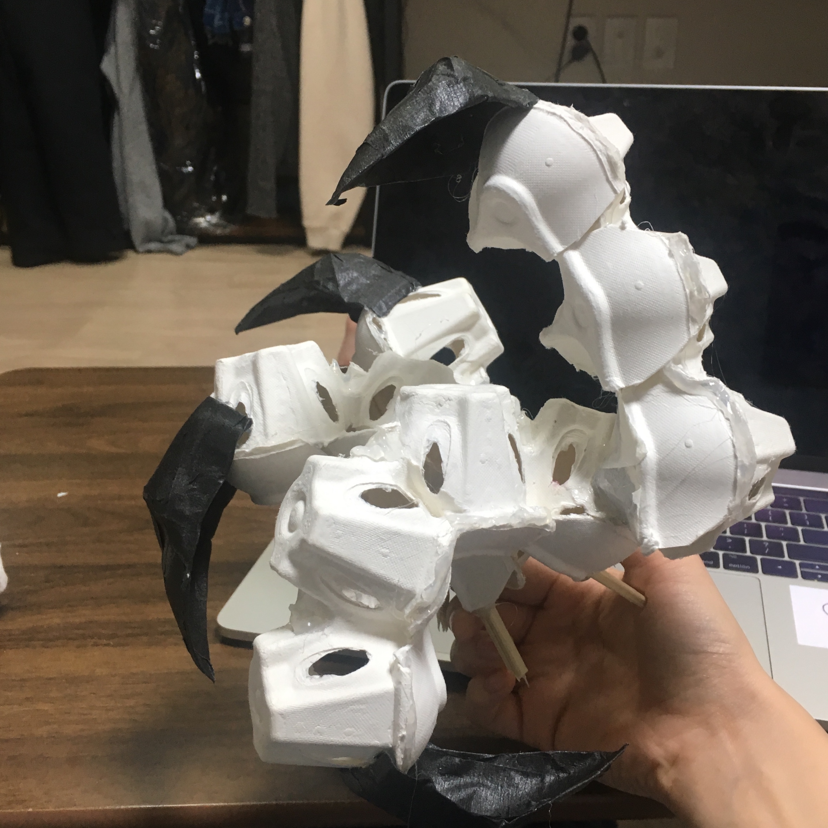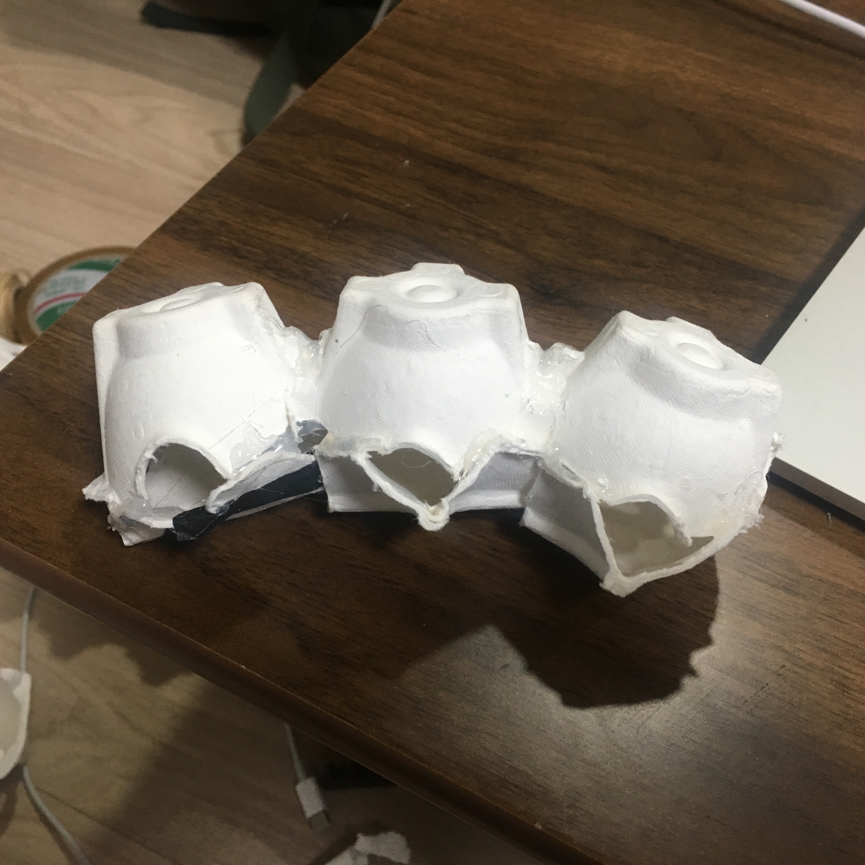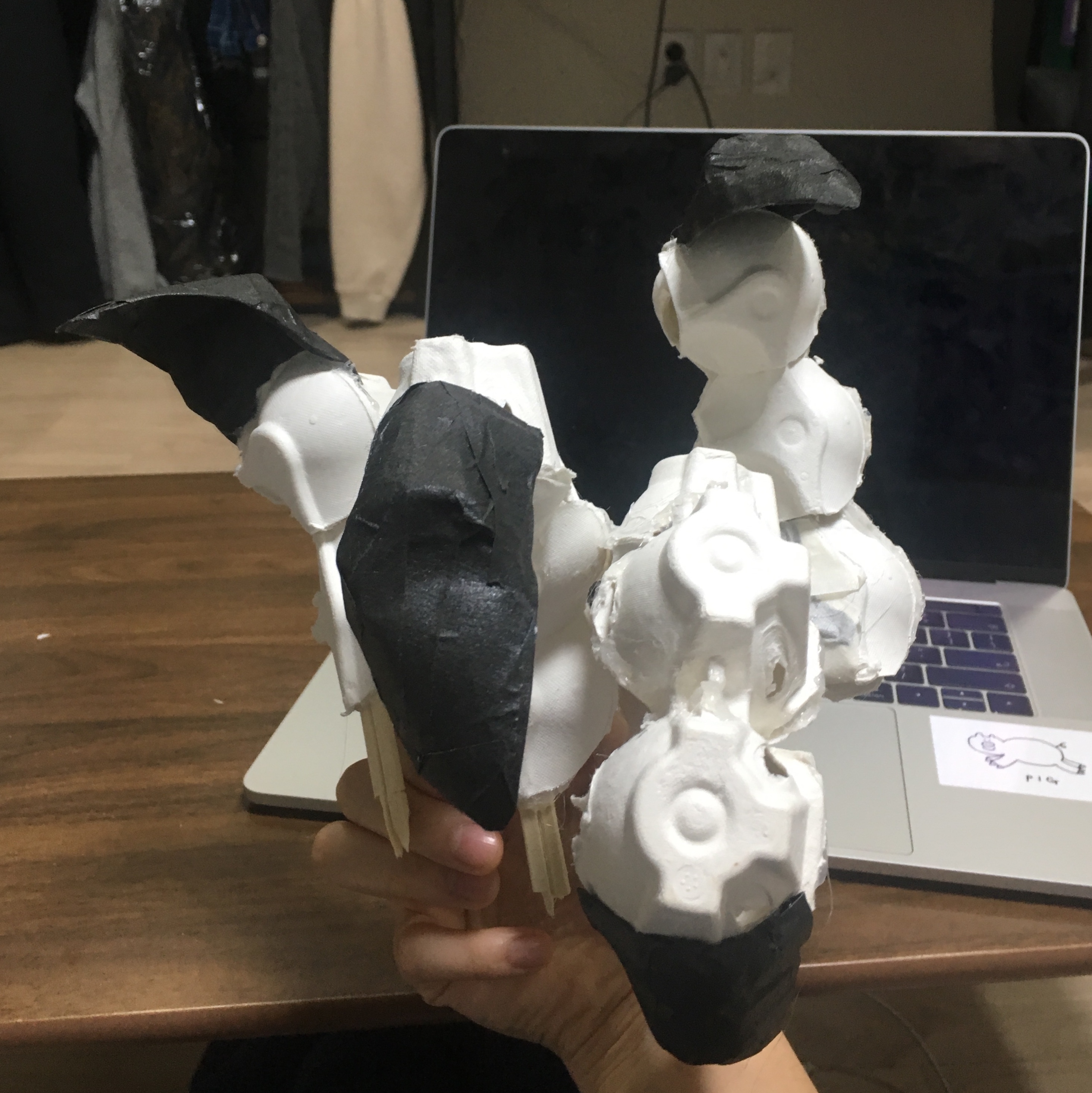나는 나의 손가락을 튀기려고 하는 바로 직전의 찰나를 사진으로 찍었다. 힘이 잔뜩 들어가있는 발가락을 원했다. 집에서 계란을 먹고 남은 텅 빈 계란판 2개를 가지고 발가락을 만들었다. 용의 발은 새와 비슷한 발가락에 매의 발톱, 호랑이의 주먹을 가지고 있다. 새의 발을 잘 흉내낼 수 있는 재활용품은 계란판이라고 생각됐다. 사실 전부터 계란판을 가지고 무언가를 만들고 싶어하긴 했다. 재활용품을 택한 건, 그저 새로운 무언가를 사서 만드는 것보단 집에 보이는 것들을 가지고 작업물을 만들어보는 게 더 재미있어서 선택했다. 이번에 그림말고 조형물로 만드는 것도 같은 이유다.