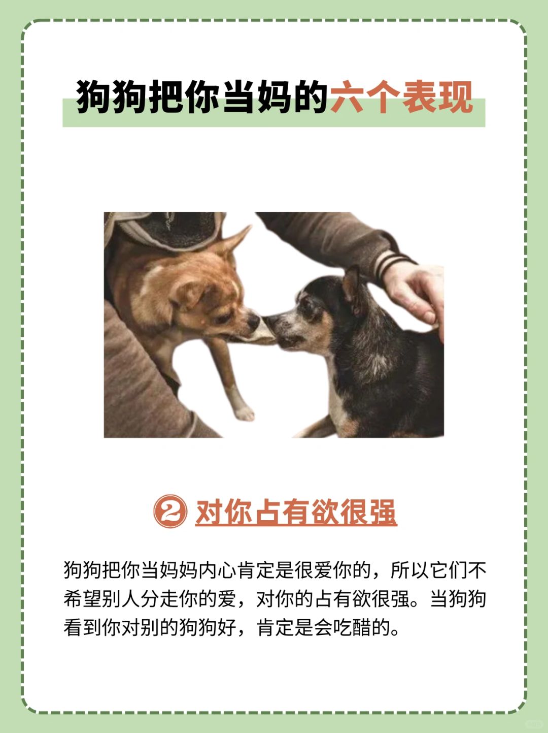 狗狗把你当妈妈内心肯定是很爱你的,所以它们不希望别人分走你的爱,对你的占有欲很强。当狗狗看到你对别的狗狗好,肯定是会吃醋的。