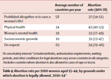 U prvom redu se nalazi stopa pobačaja kada je on u potpunosti zabranjen ili dopušten zbog spašavanja majčinog života, u zadnjem redu se nalazi stopa pobačaja u državama gdje je on dostupan na zahtjev.