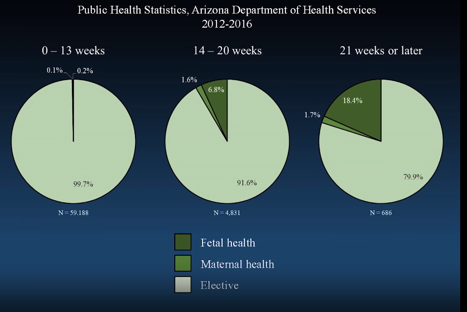 Iz tablice je jasno vidljivo da se samo 21% pobačaja nakon trinaestog tjedna vrši zbog zdravlja fetusa, dok se 10% pobačaja vrši zbog zdravlja majke. To znači da se 69% pobačaja obavlja elektivno, iz ne-zdravstvenih razloga. Ovo su brojevi iz istraživanja koje je proveo Guttmacher institut. Taj institut je sve do 2007. godine bio dio Planned Parenthood neprofitne organizacije koja je jedan od najvećih pružatelja pobačaja u SAD-u. Čak i ovakvi brojevi s kojima su oni izašli idu u prilog tezi da se većina abortusa u kasnijoj fazi ne obavljaju iz zdravstvenih razloga, ali čak i ti brojevi su dobiveni uz prilično široke definicije "osobnog zdravlja" i "zdravlja fetusa". Tako se naprimjer, zabrinutost majke da neće moći dobiti adekvatnu prenatalnu njegu svrstava pod "zdravlje fetusa" iako to nema nikakve veze sa stvarnim zdravstvenim stanjem fetusa. Ovakve podatke je inače teško pronaći, ali savezna država Arizona vodi statistiku o pobačajima i prema njihovim statistikama pobačaji od 14. do 20. tjedna se vrše u postotku od 1.6% zbog zdravlja majke i 6.8% zbog zdravlja fetusa. Nakon 21. tjedna brojka za pobačaje koji se vrše zbog zdravlja majke je gotovo ista (1.7%), dok su pobačaji zbog zdravlja fetusa tada na 18.4% što je očekivano jer kako trudnoća napreduje tako su zdravstveni problemi fetusa očitiji. Ako uzmemo statistiku koju nam daje država Arizona dobivamo da se čak 80% pobačaja, u razdoblju nakon 21. tjedna kada fetus ima 50% šansu za preživljavanje - ne vrši iz zdravstvenih razloga.