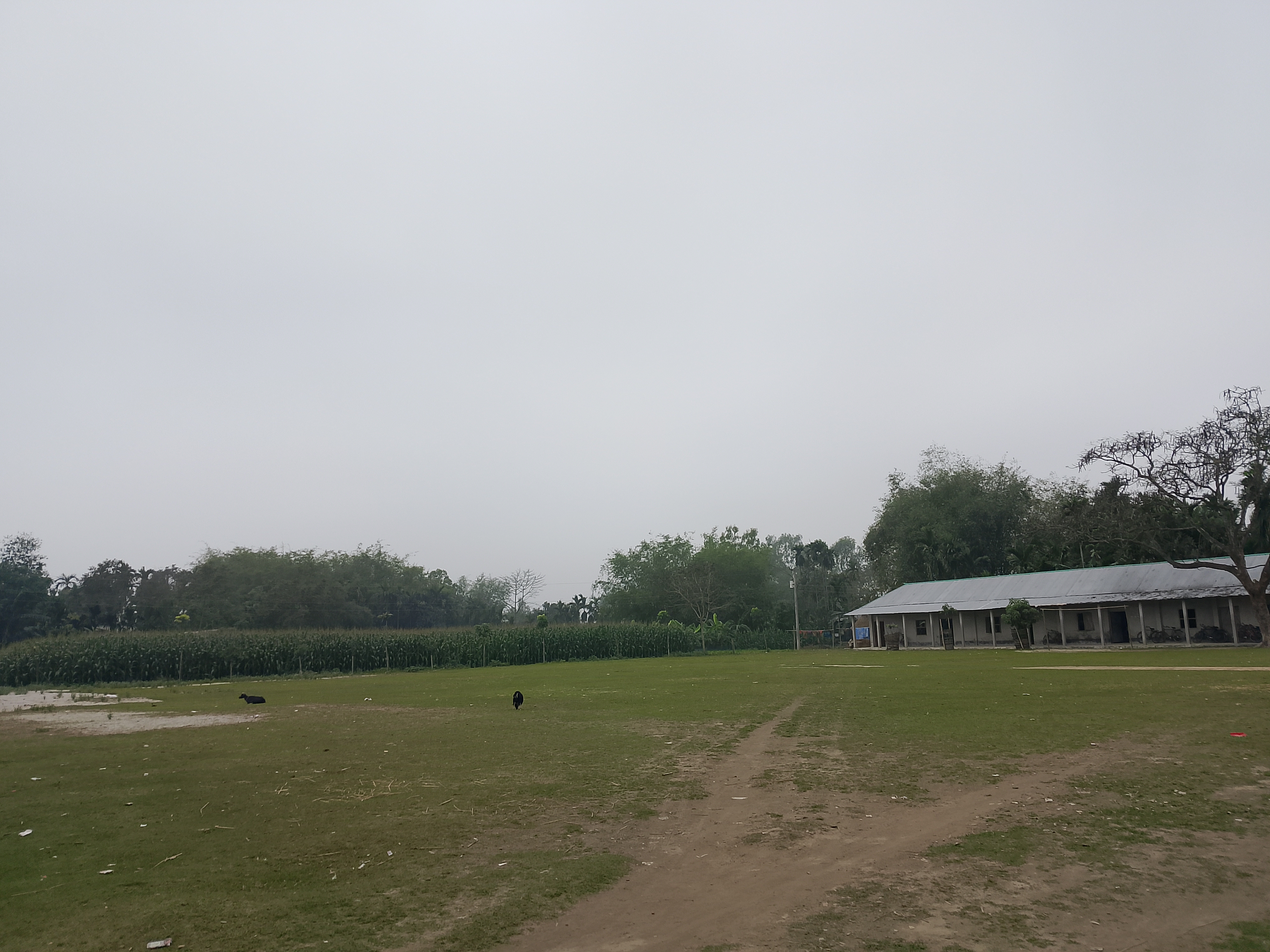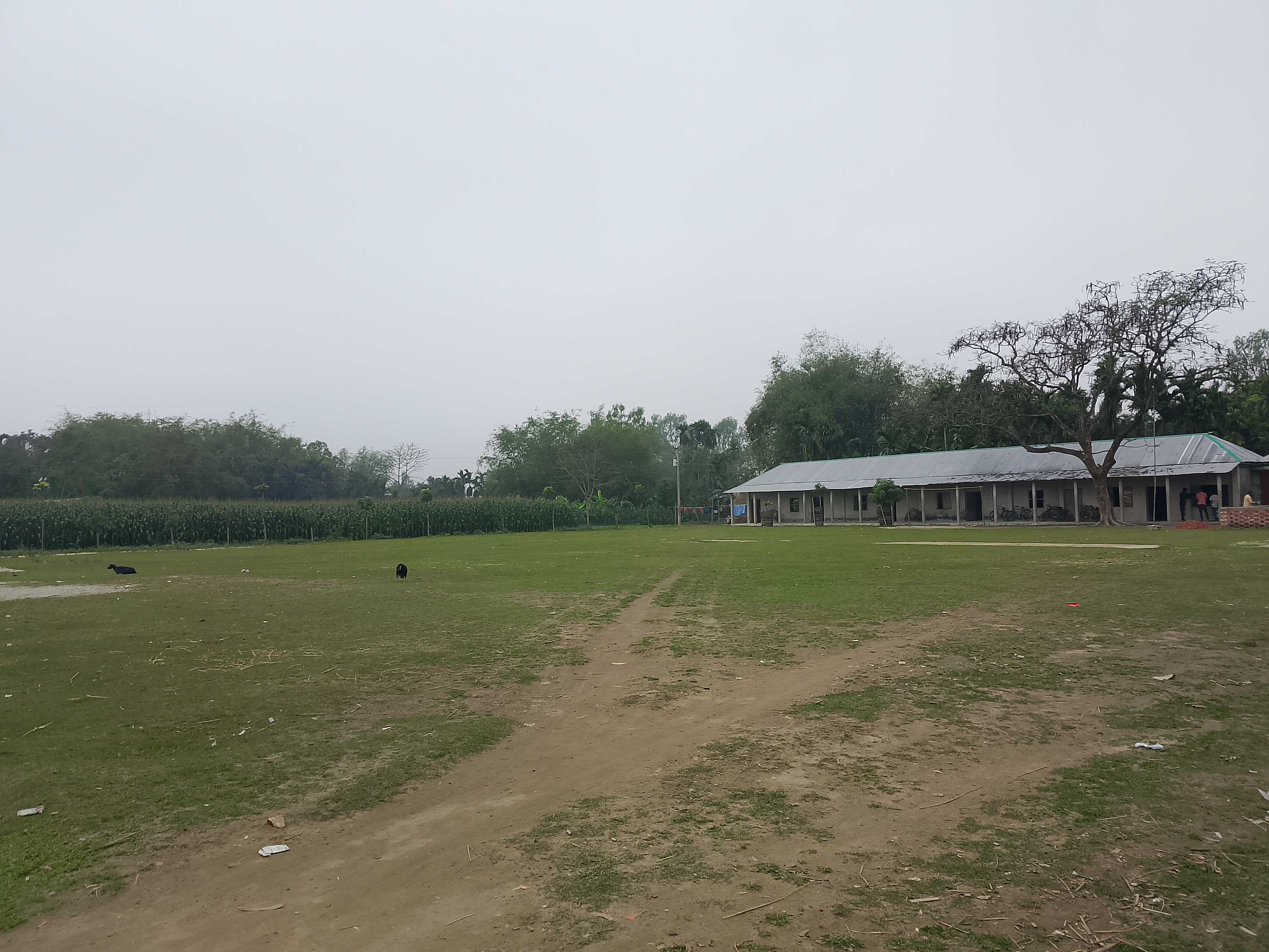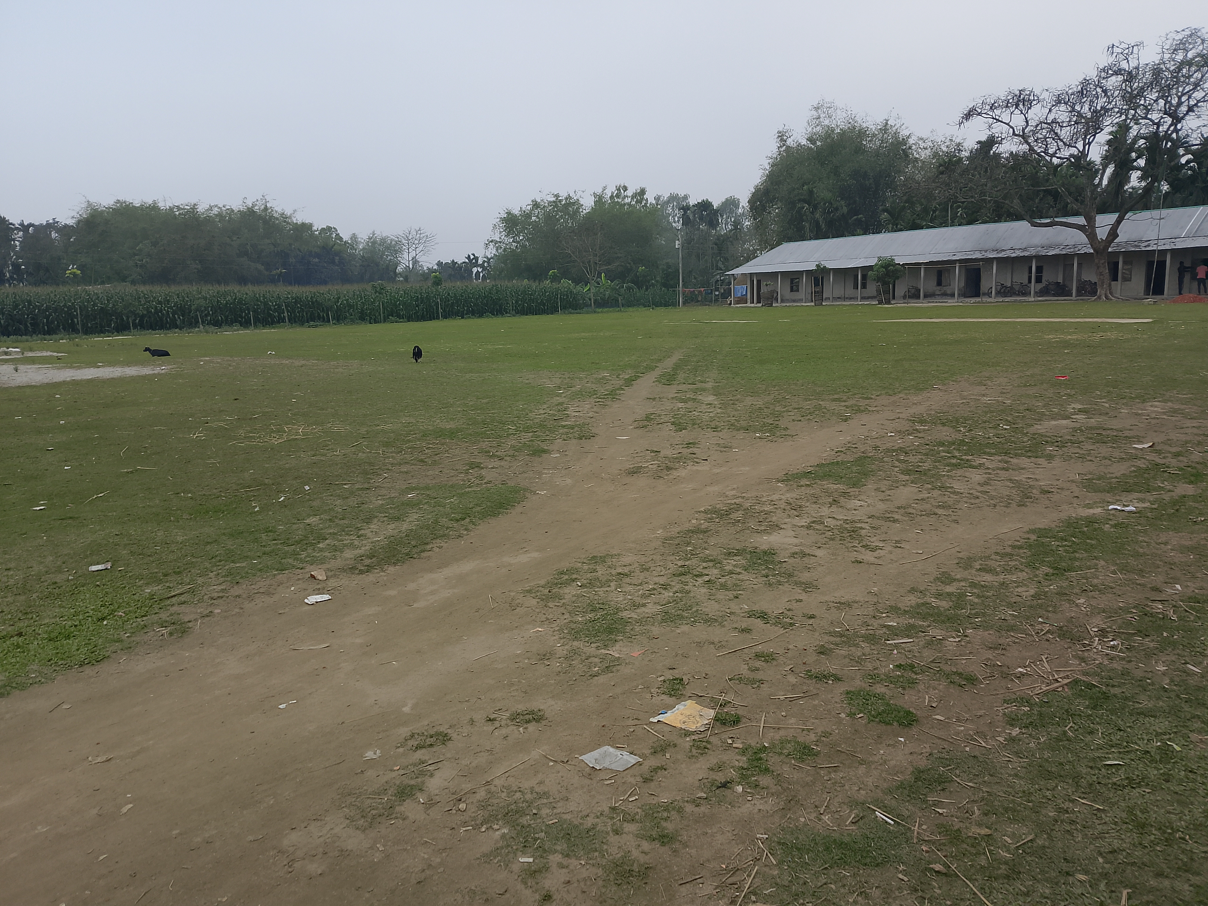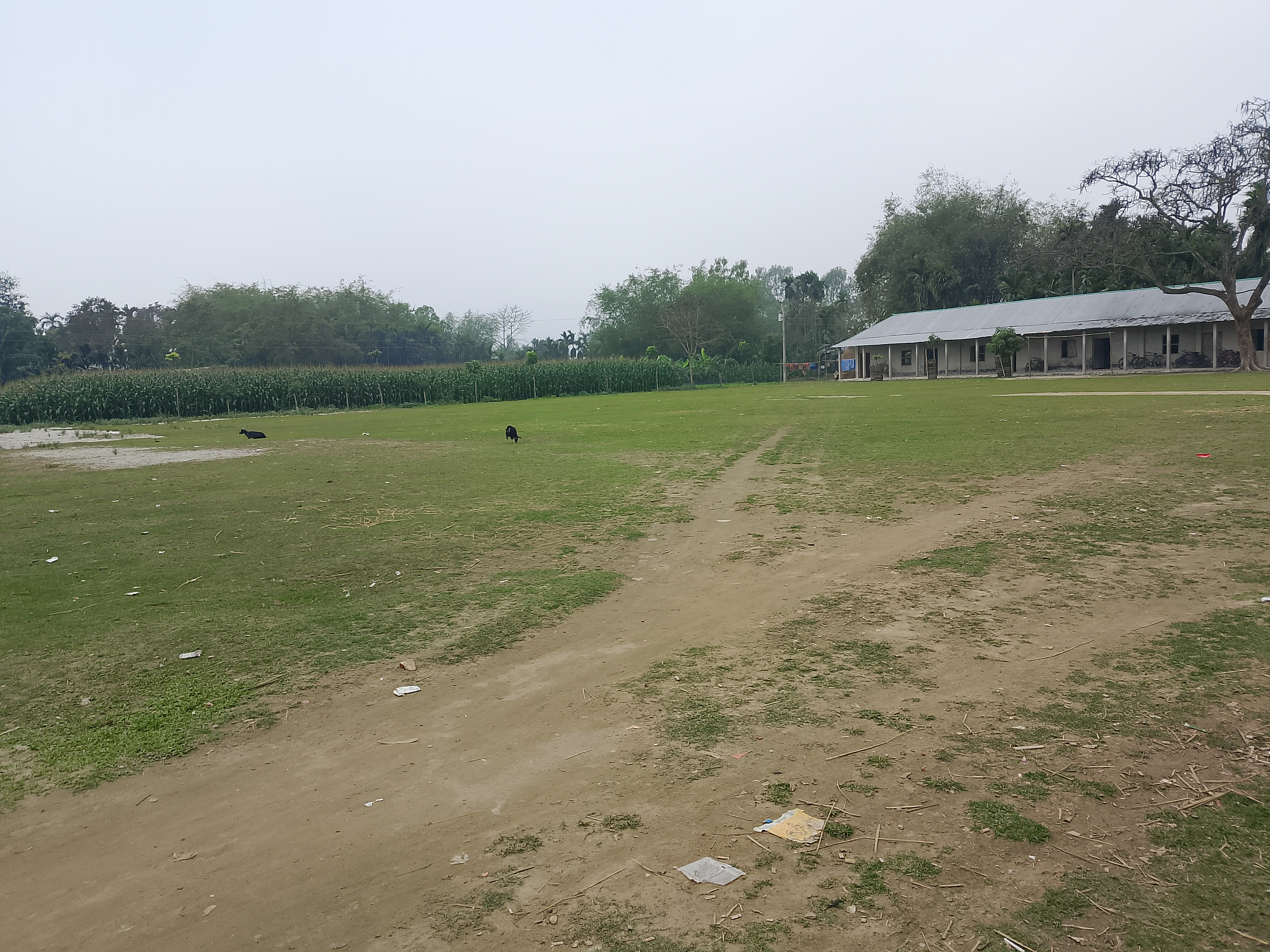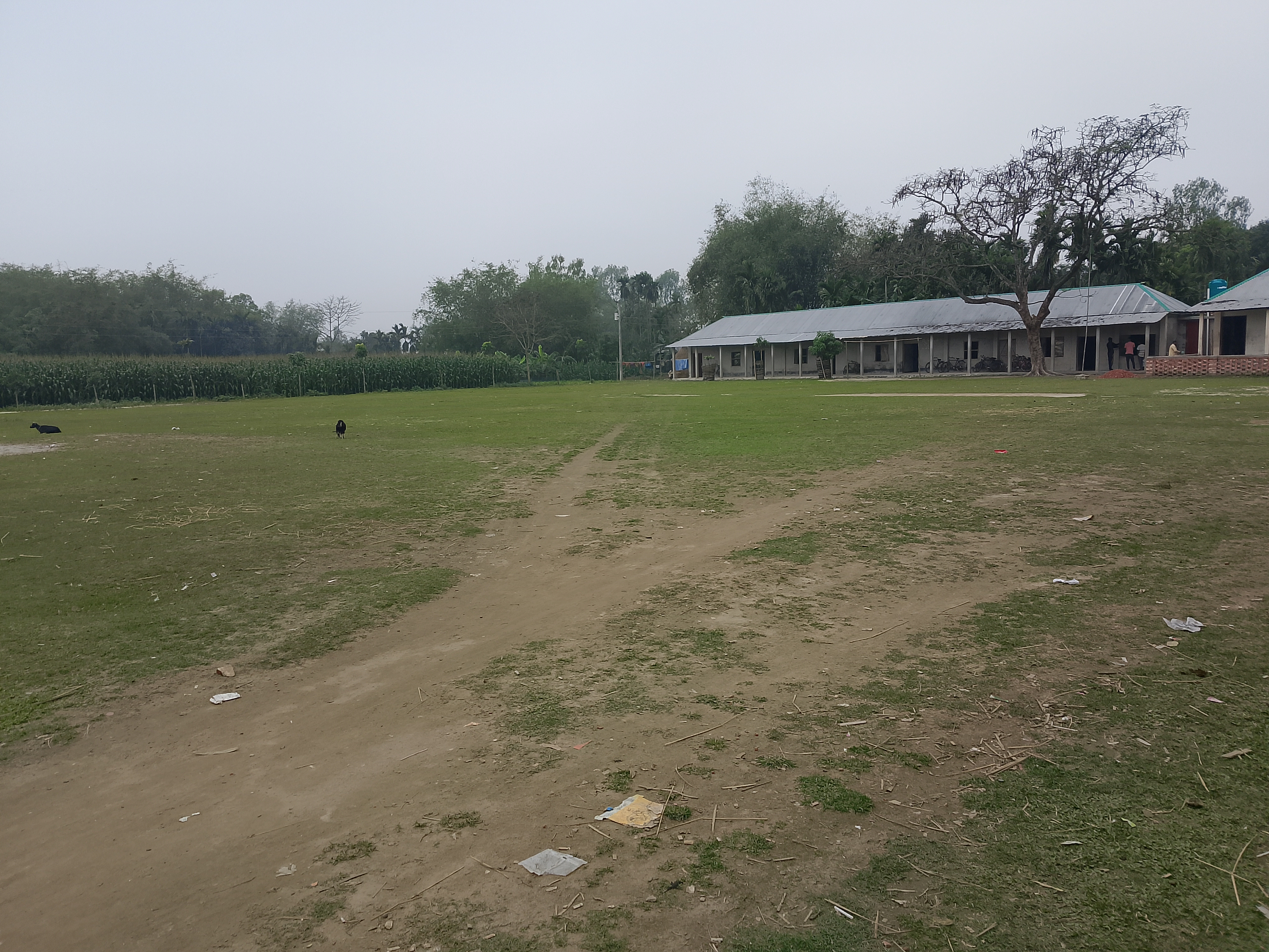 স্কুলটির একটি ভবন আছে এবং তার সামনে বেশ বড় একটি মাঠ রয়েছে। স্কুলটির চারপাশে কোনো সীমানা প্রাচীর নেই, কিন্তু এর কার্যক্রম সুষ্ঠুভাবে চলছে। এই যে বড় খোলা মাঠটি দেখতে পাচ্ছেন, তা খেলার জন্য খুবই ভালো। ছাত্রছাত্রীরা তাদের অবসর সময়ে সেখানে খেলে। একটি স্কুলের জন্য এত বড় একটি মাঠ থাকাটা গুরুত্বপূর্ণ। এটি ছাত্রছাত্রীদের ঠিকমতো খেলতে এবং আনন্দ করতে সাহায্য করে। সকালে আমি কিছু কাজের জন্য স্কুলের সেই মাঠে গিয়েছিলাম এবং তারপর ফিরে এলাম।