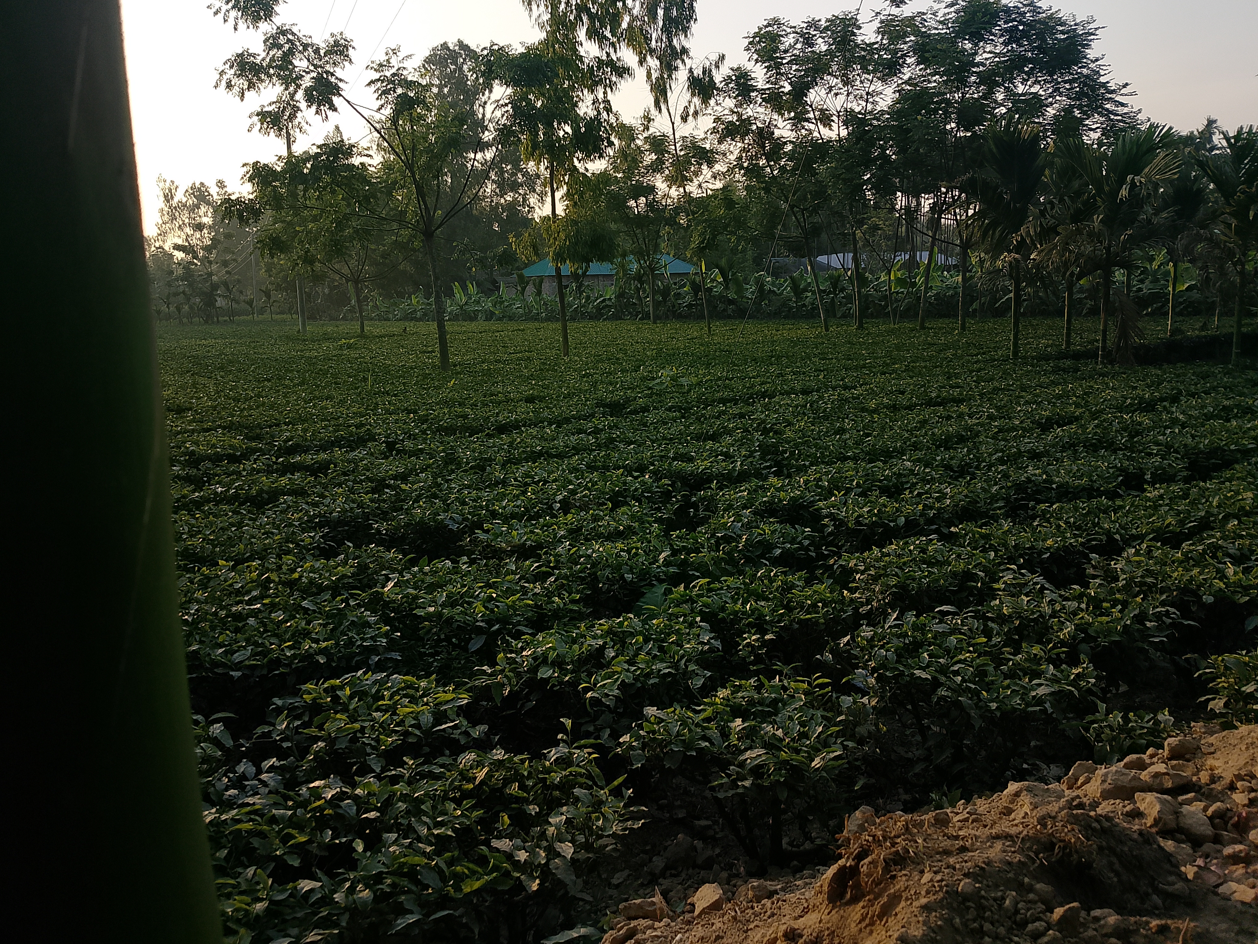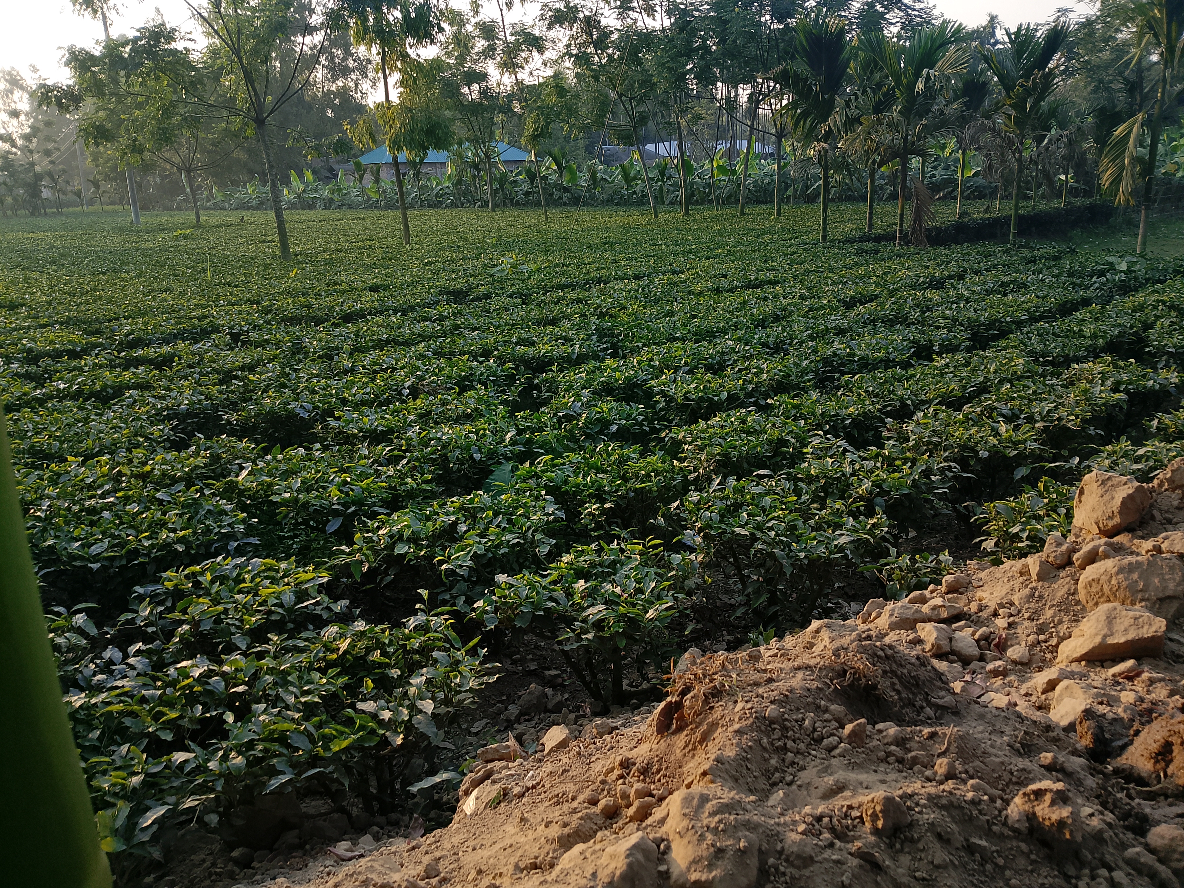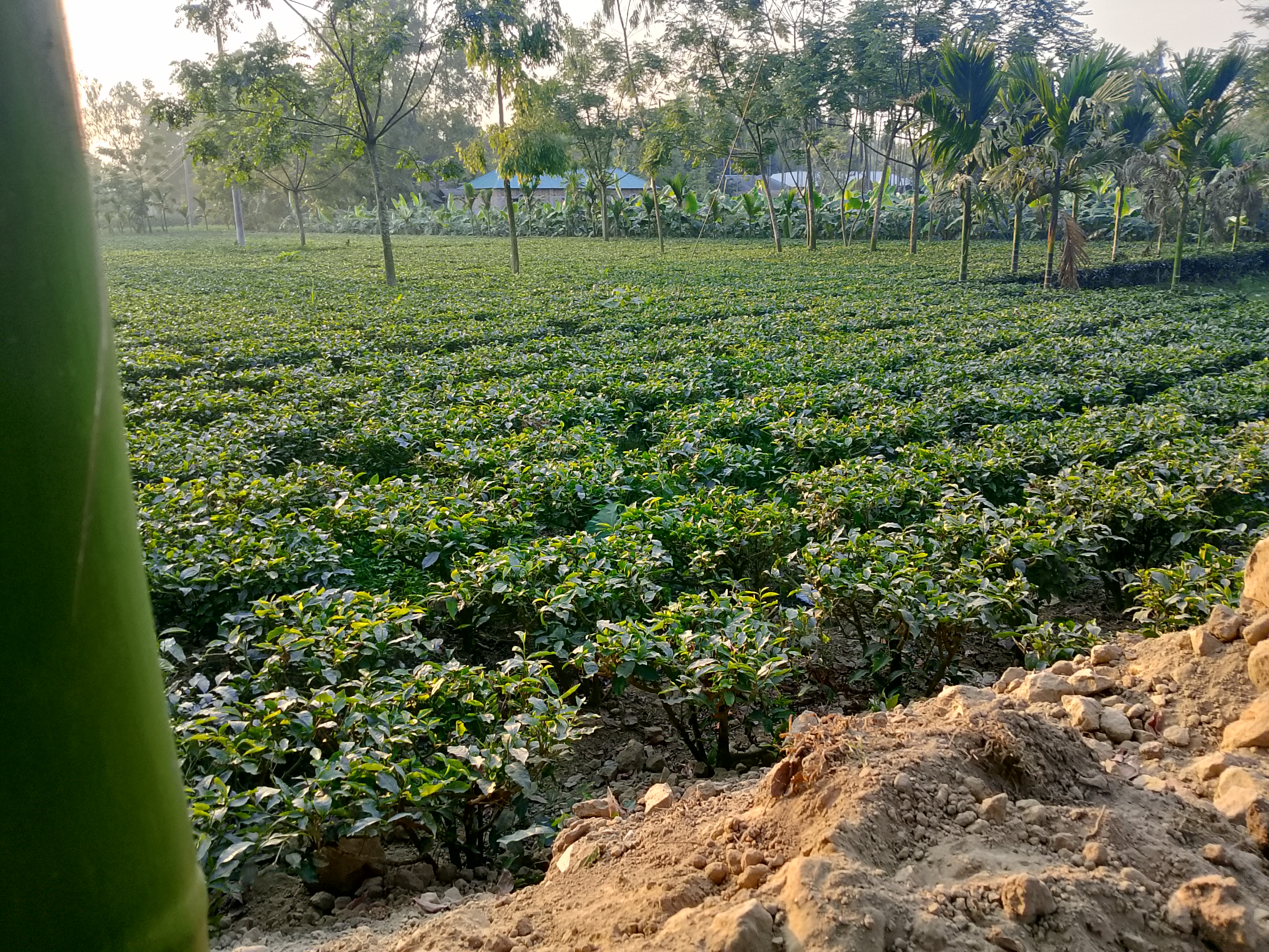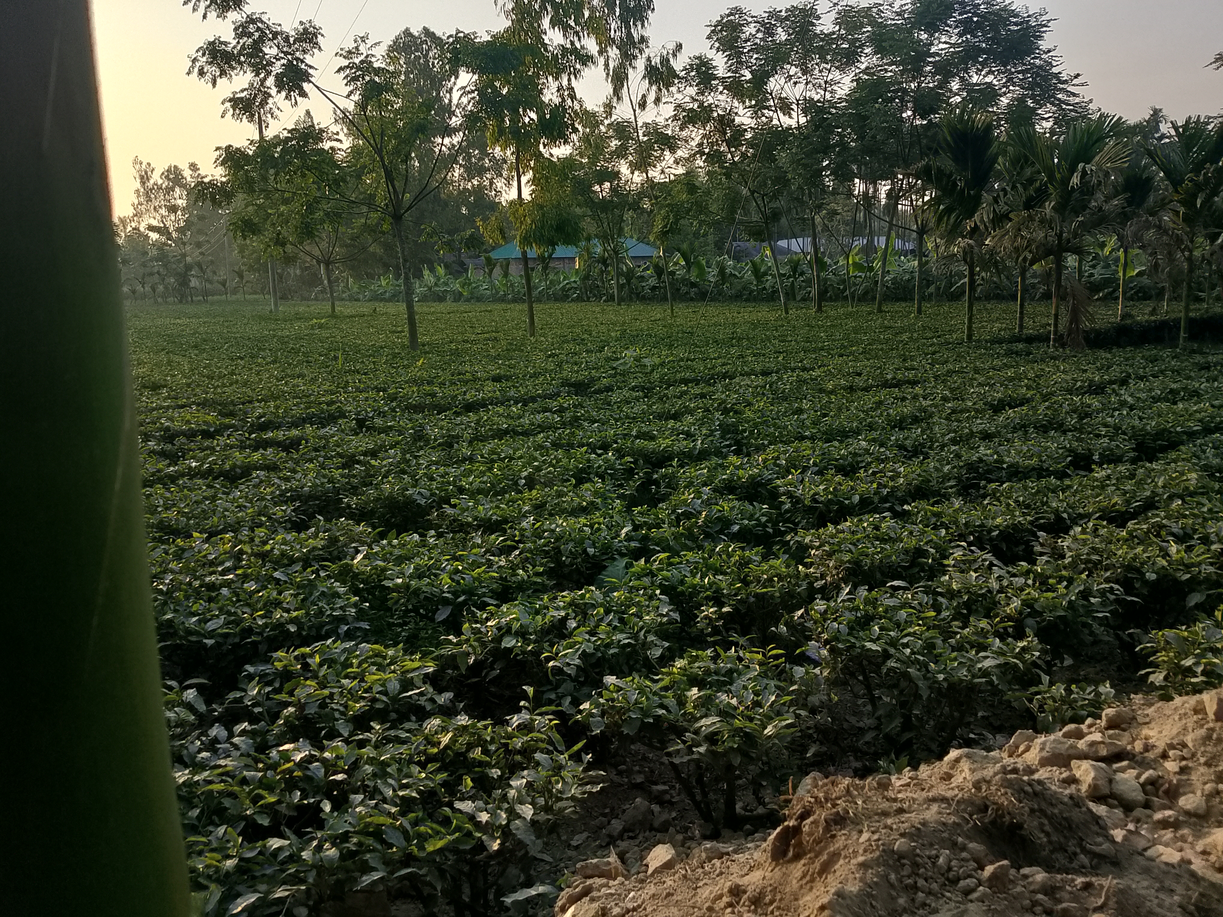 There is a small tea garden here, which covers a fairly large area. This tea garden is located some distance from our home, and there are many large trees around it. Today, we went to the tea garden for some work.