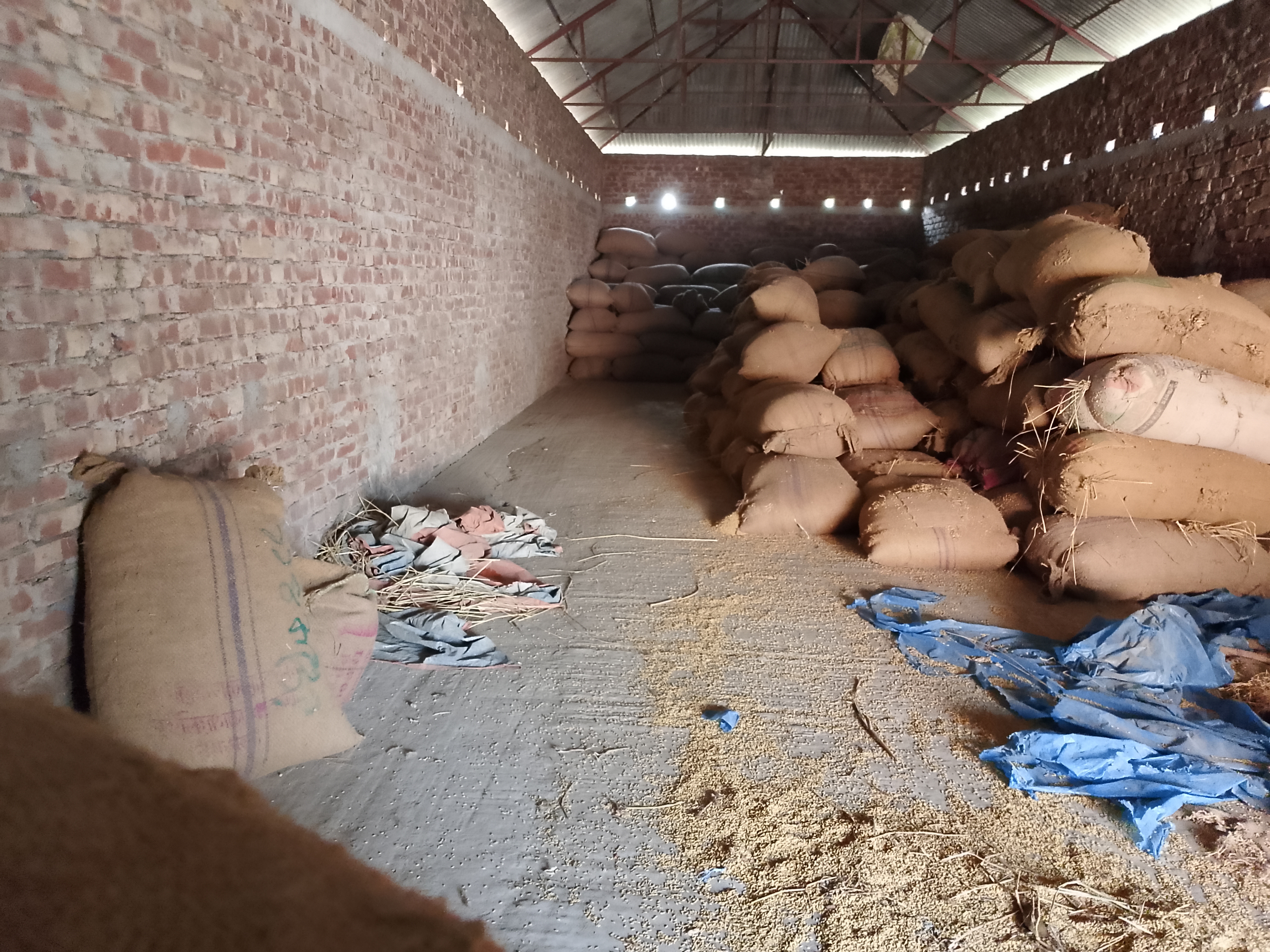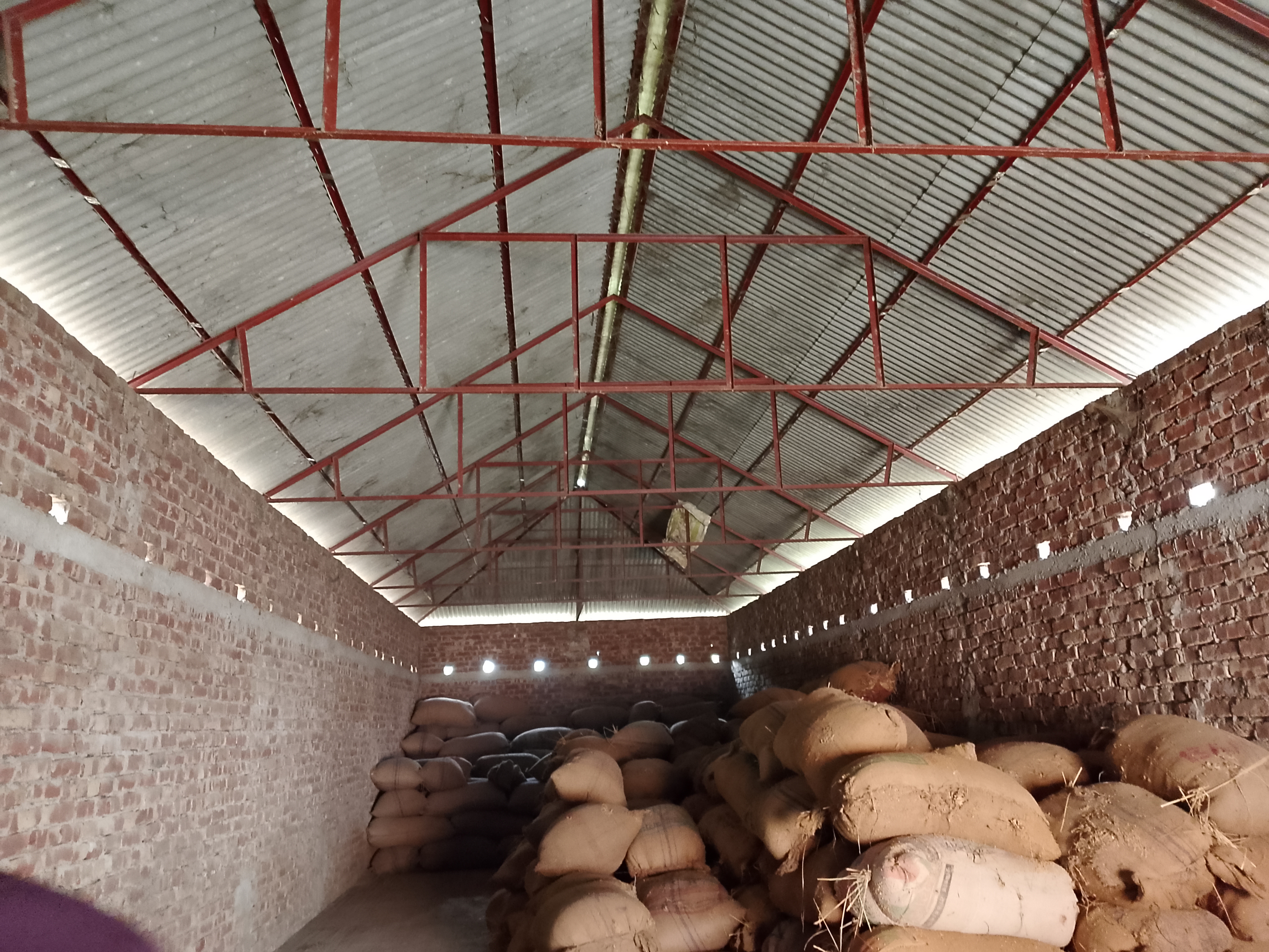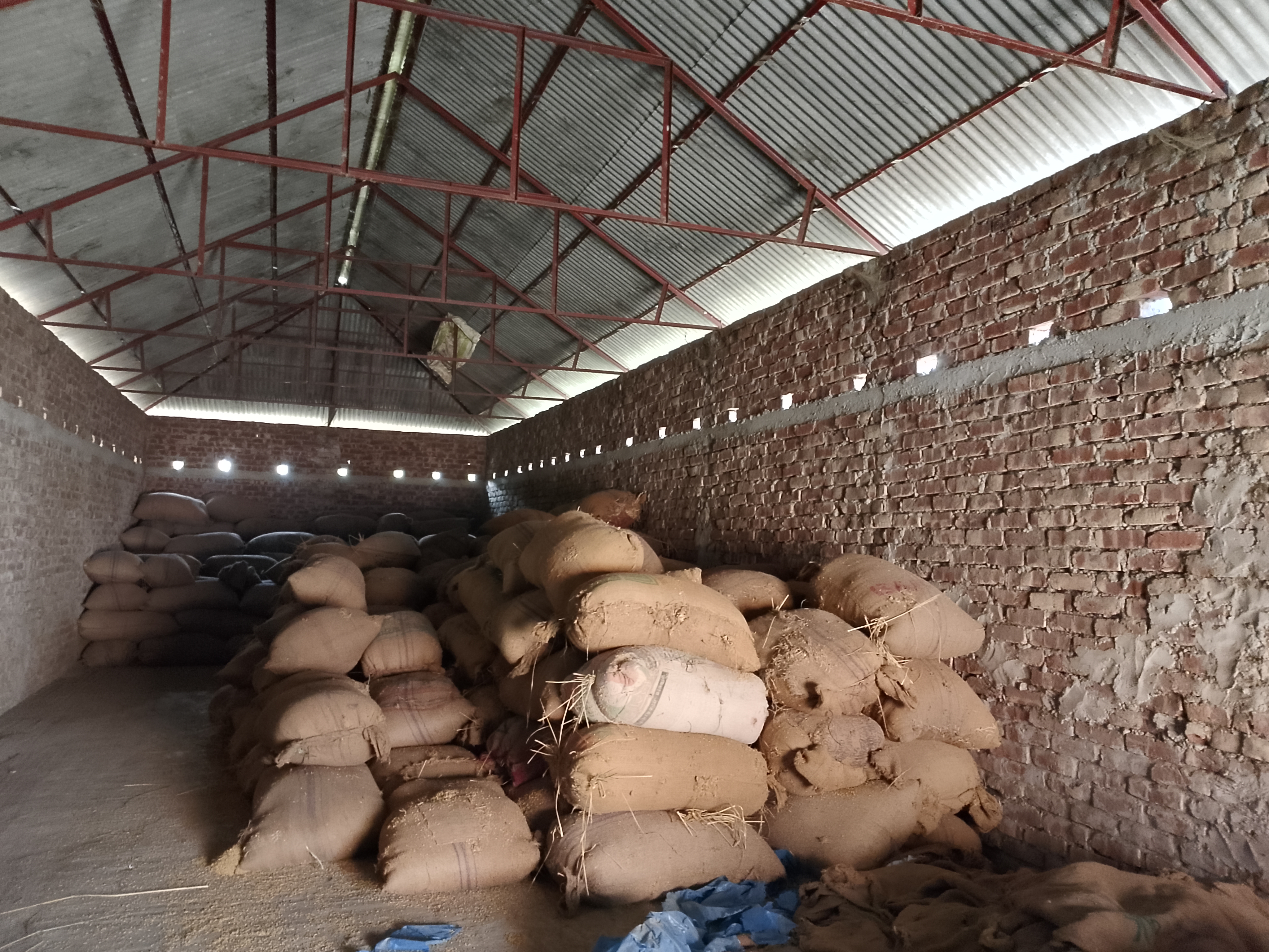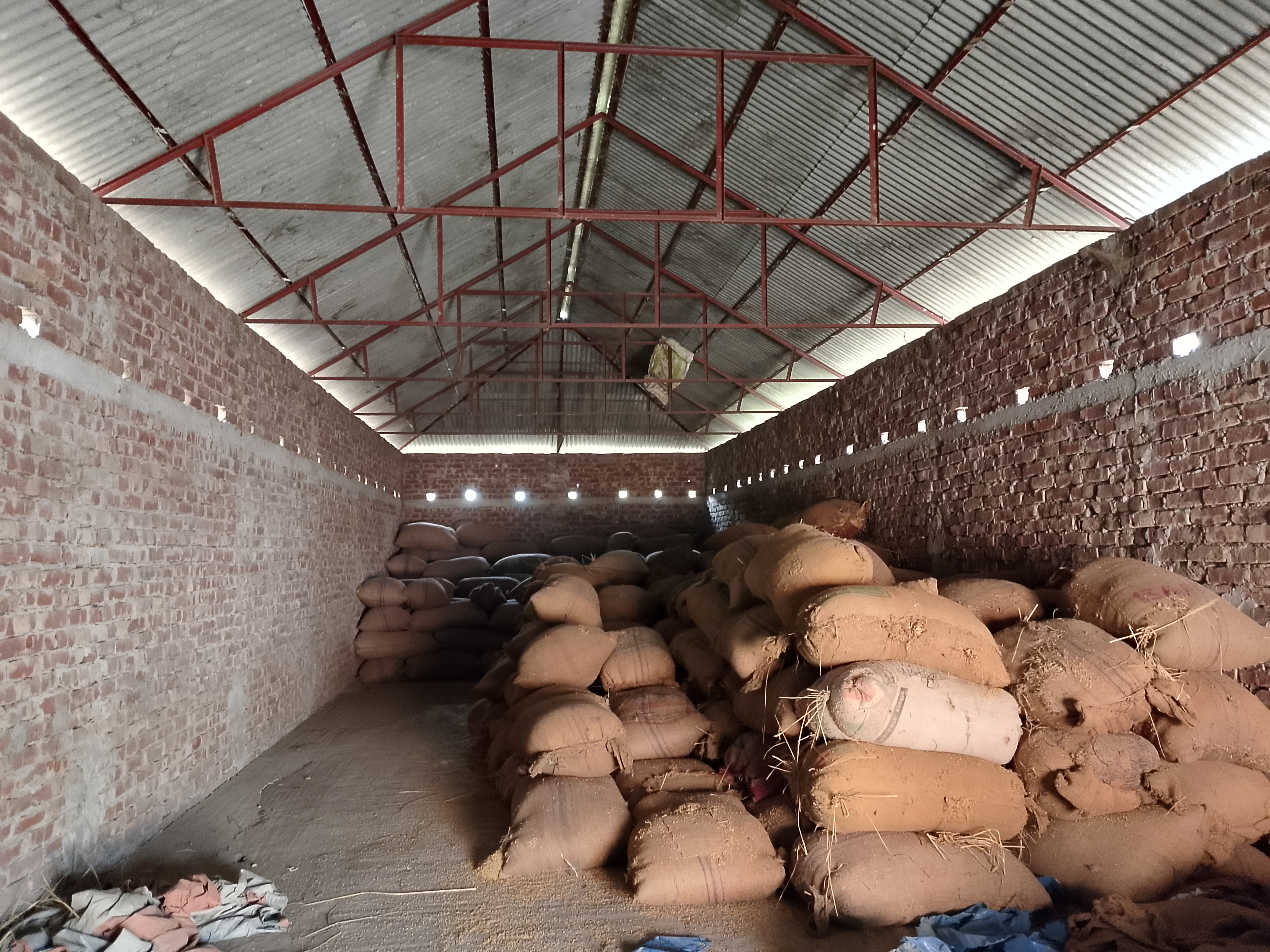 This is a storage house where sacks of paddy, peanuts, and potatoes are kept. The house has been built in a long shape and constructed with angle iron. The house here has been made very nicely, and the sacks have been neatly arranged, as if they have been properly stacked. On one side, there are sacks of paddy, and on the other side, there are sacks of peanuts.