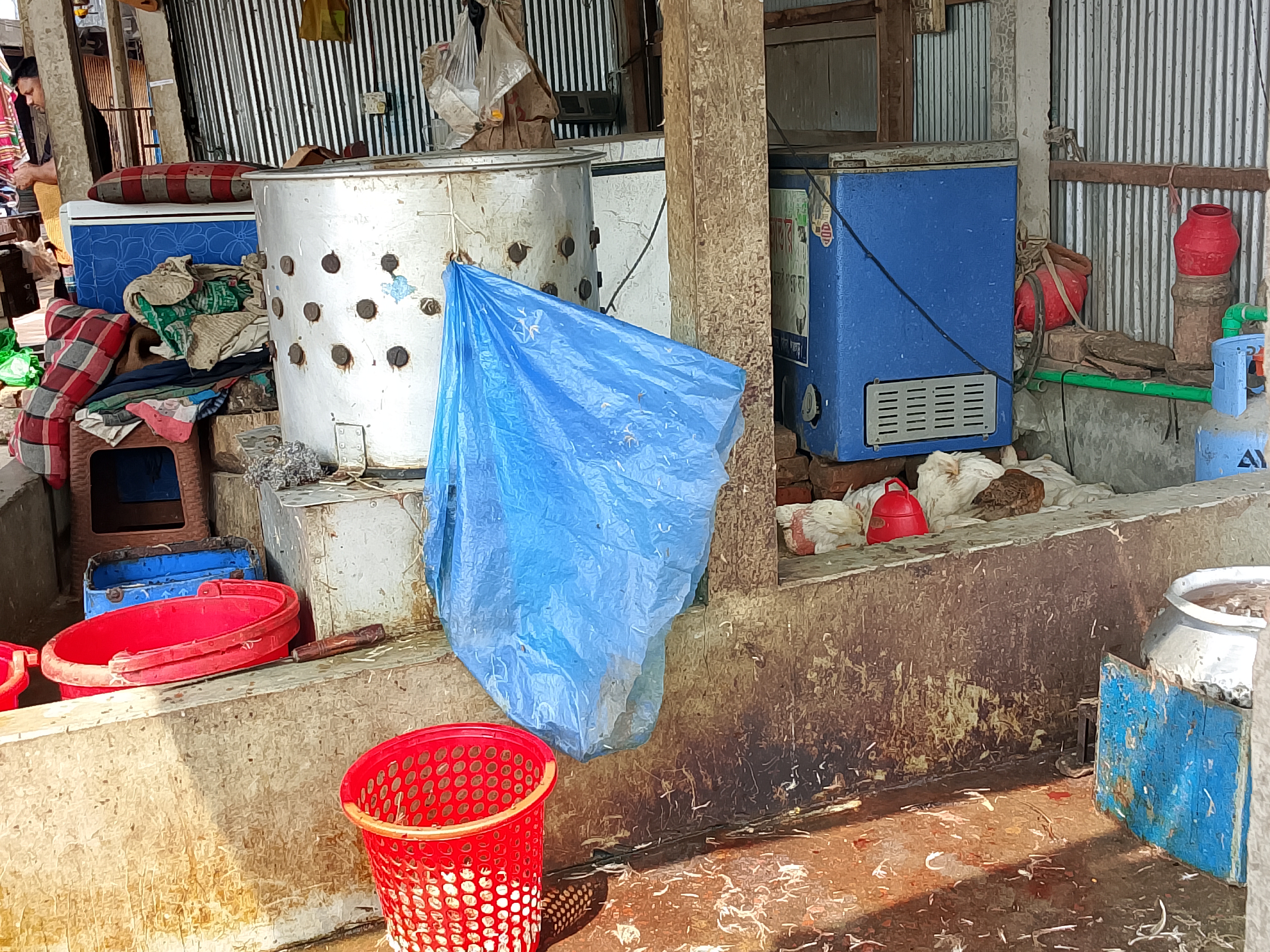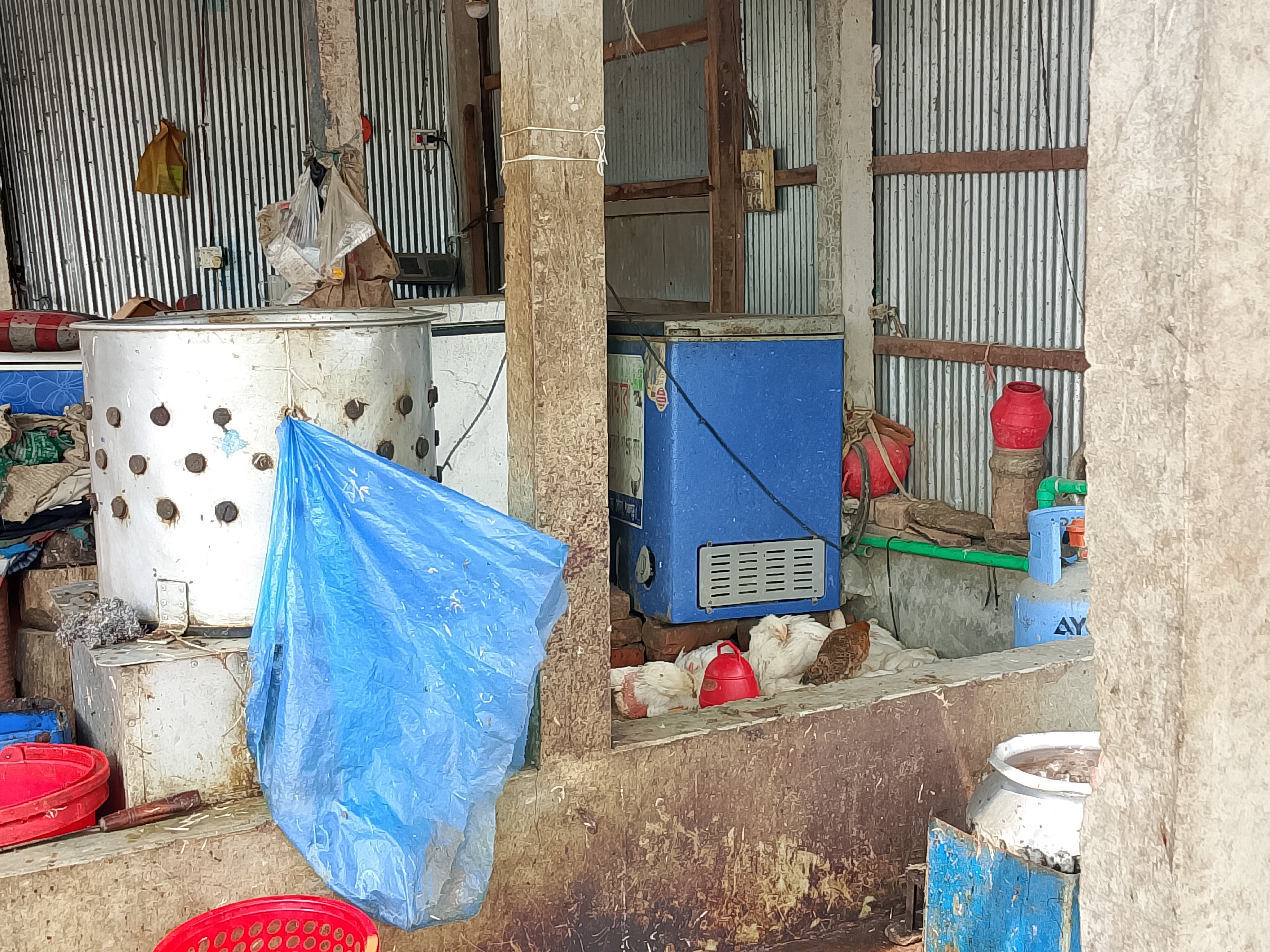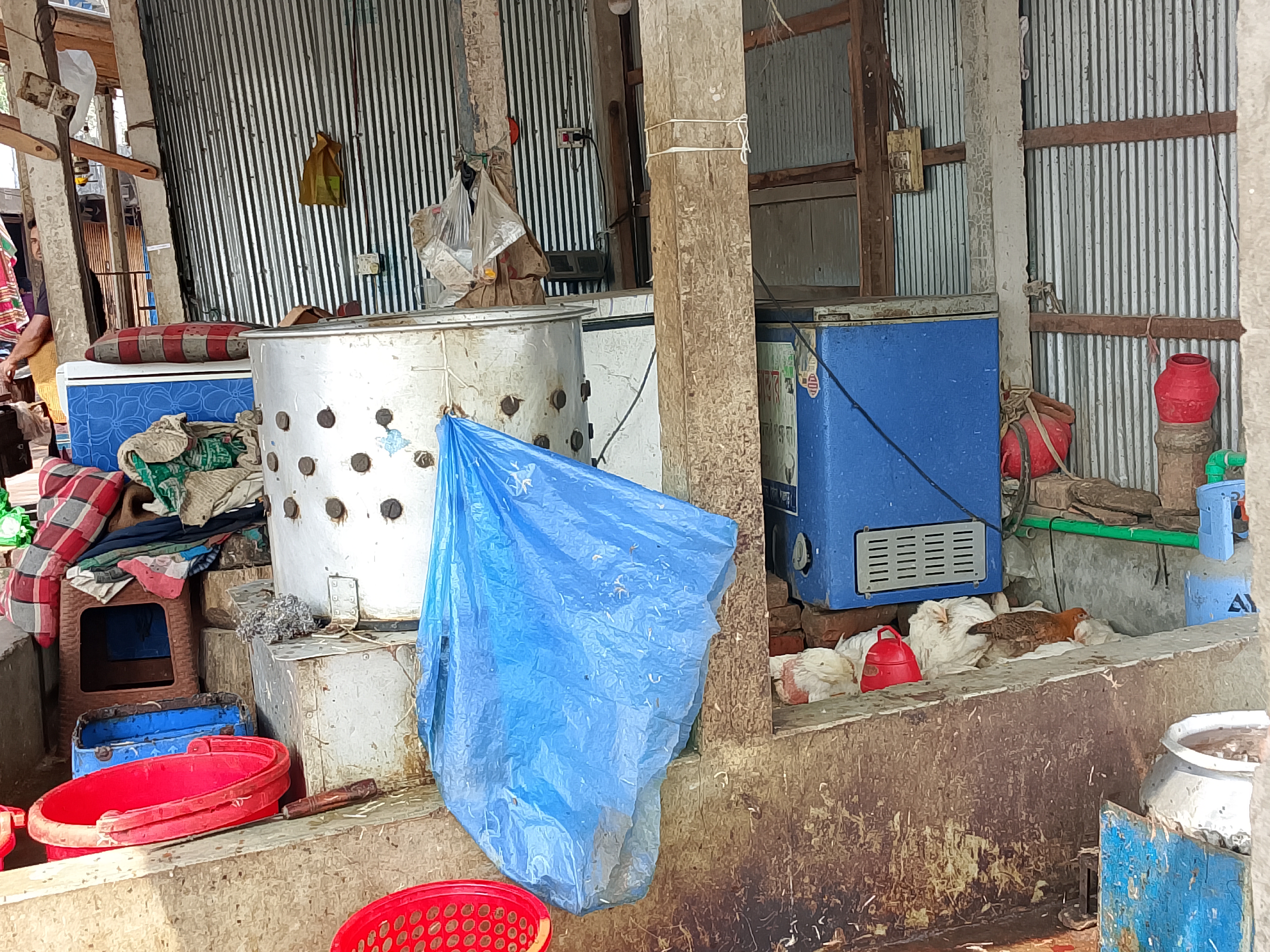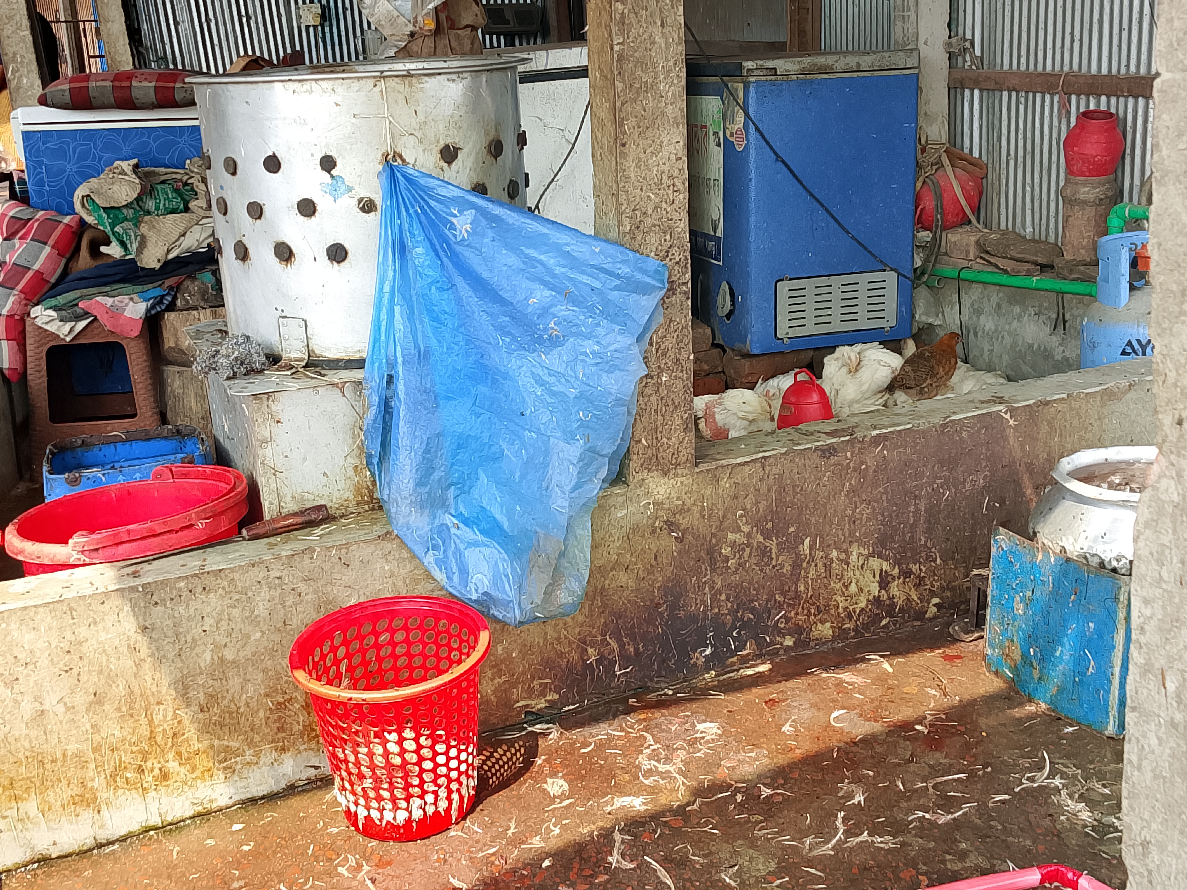 এখানে কিছু যন্ত্রপাতি রাখা হয়েছে, যার মধ্যে মুরগি কাটার বিভিন্ন সরঞ্জামও রয়েছে। এটি একটি মুরগি বিক্রির দোকান, এবং এখানে মাছও বিক্রি হয়, তাই এই জিনিসগুলো এখানে রাখা হয়েছে। এই দোকানটি আমার পরিচিত। এখানকার জিনিসগুলো দোকানের জন্য খুবই প্রয়োজনীয়। এই সরঞ্জামগুলোর কয়েকটি বিদ্যুৎচালিত, এবং সেগুলো বিভিন্ন সময়ে বিভিন্ন কাজে ব্যবহৃত হয়। সেই কারণেই এই জিনিসগুলো এনে এখানে পরিপাটি করে রাখা হয়েছে।