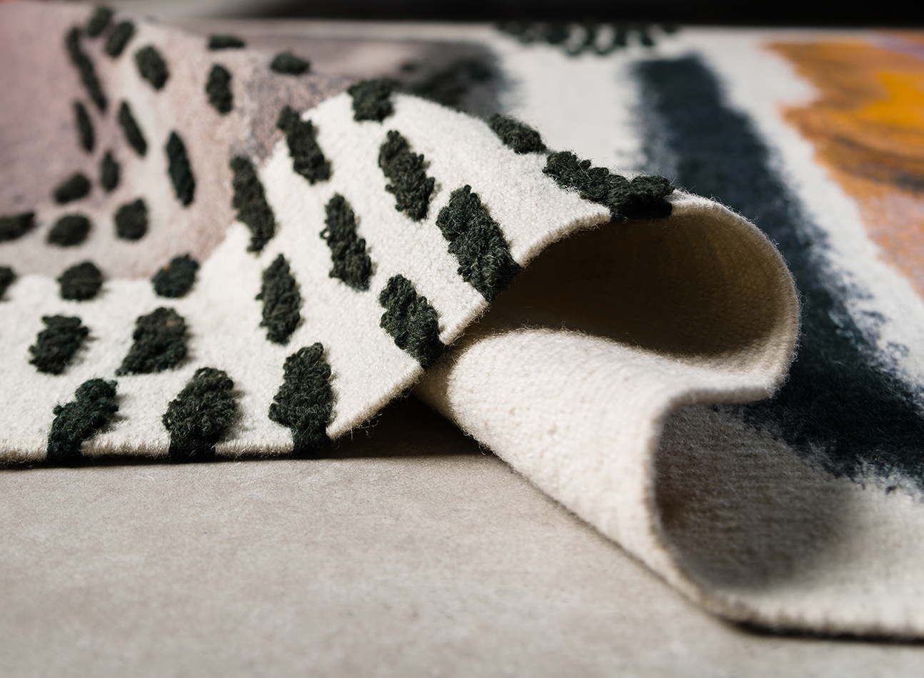 Nature passed through the prism of emotions is reflected in the picture of this carpet. Convex black spots are knots of wool, reminiscent of rain.