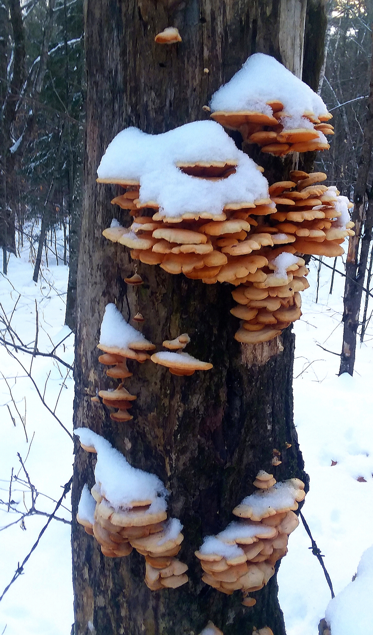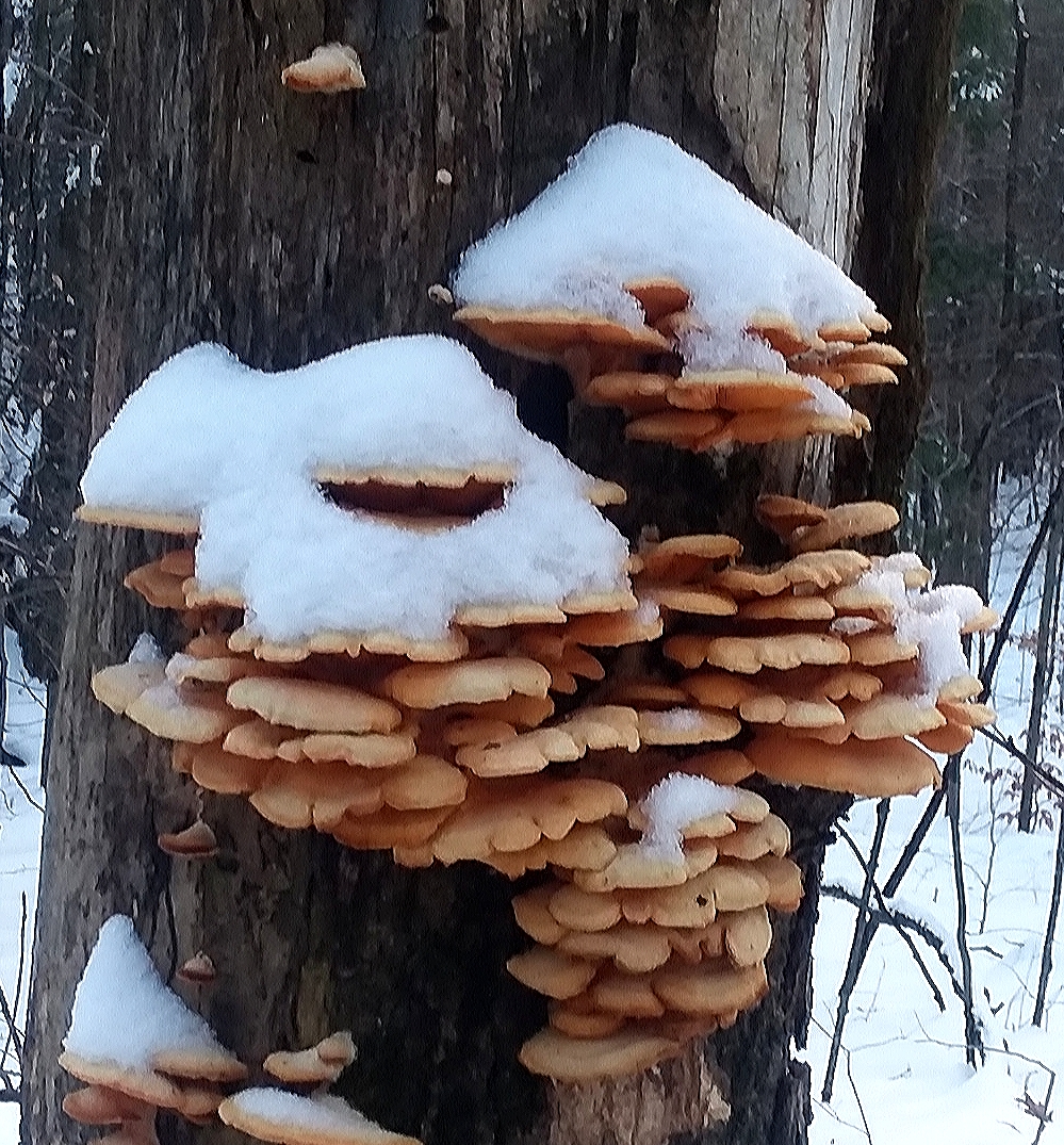 Howdy annephilbrick! haha, that is a very cool picture. The contrasting colors of the mushrooms against the tree trunk and then the white snow on top is a beautiful contrast.