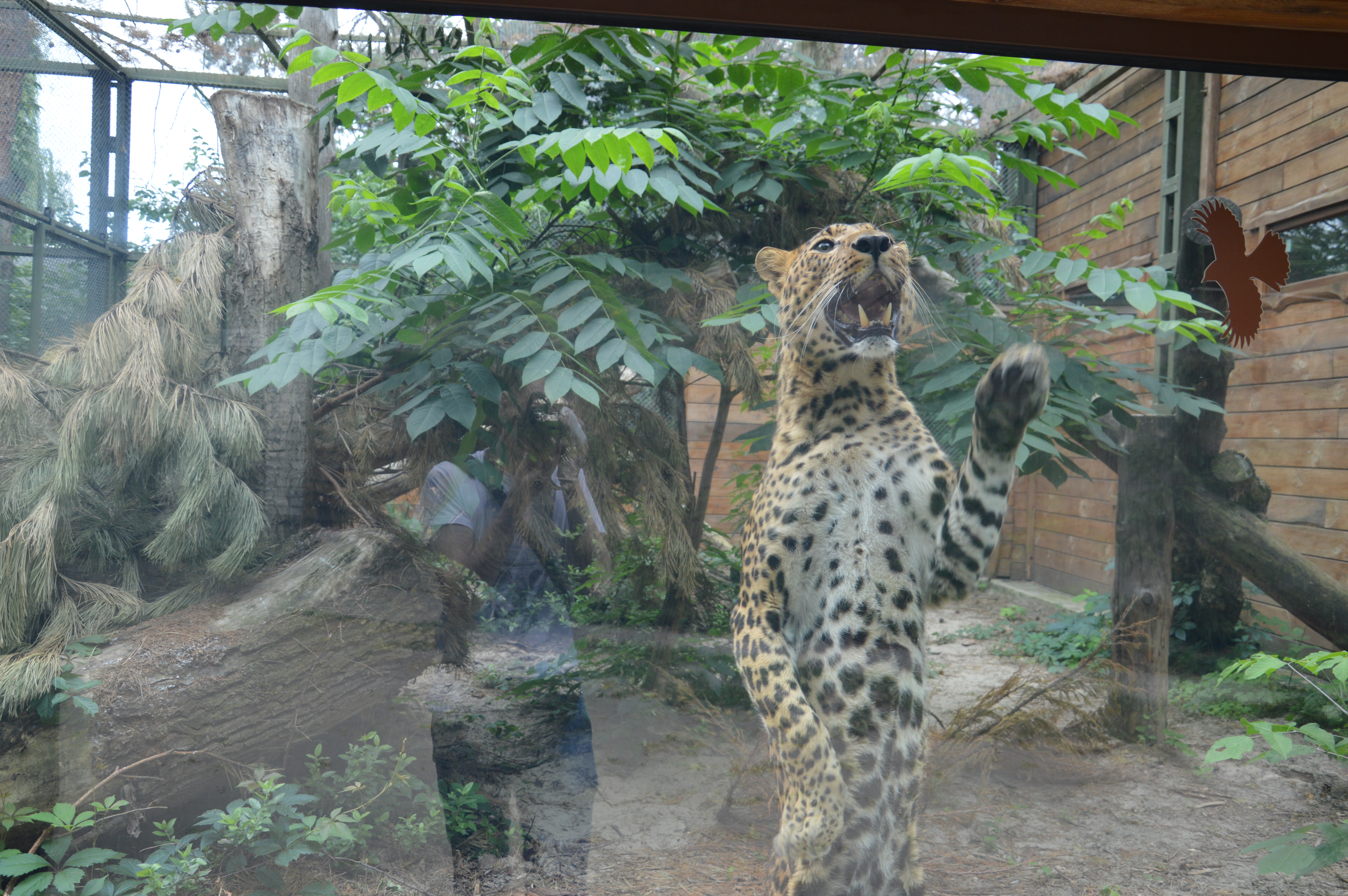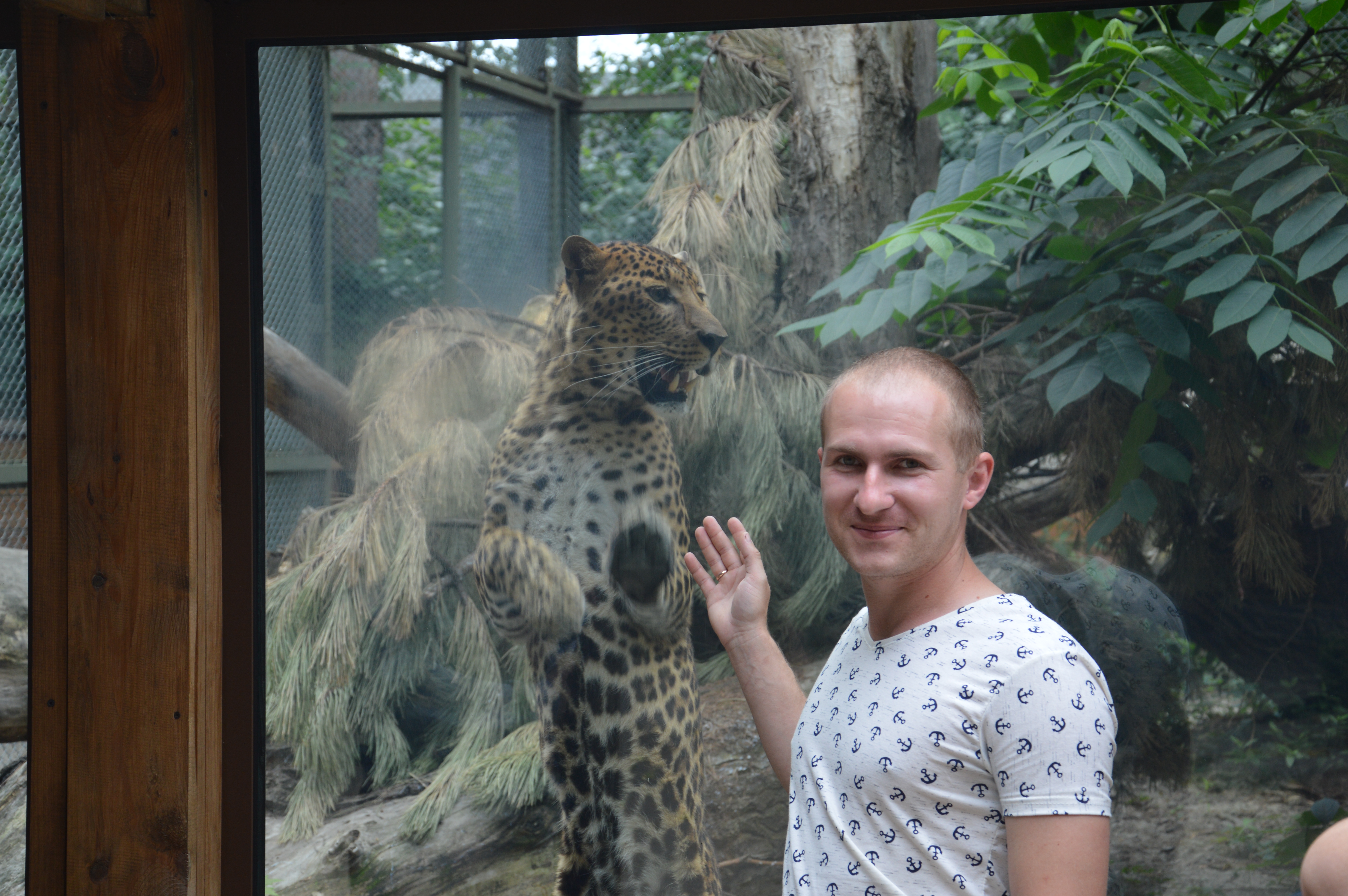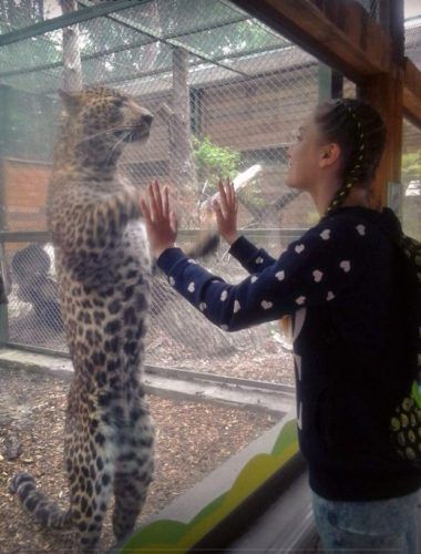 Так, радостно встречает гостей зоопарка леопард дальневосточный, который прижимает лапы к стеклу напротив их рук.