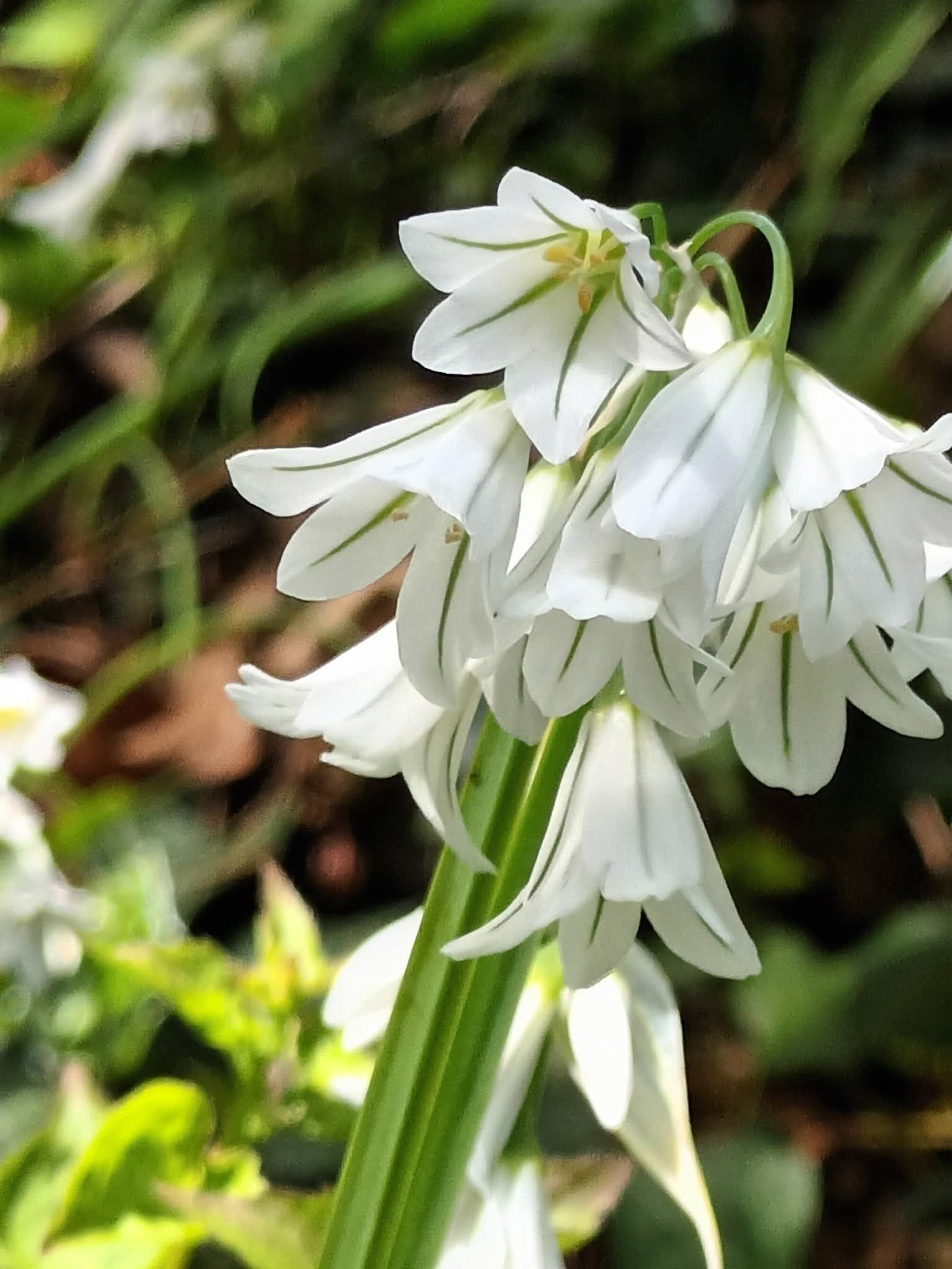 The Allium triquetrum blooms in gentle clusters of nodding, bell-shaped flowers, each petal a soft white touched with a faint green line. Hanging delicately from slender stems, the blossoms sway like tiny lanterns in a quiet breeze.