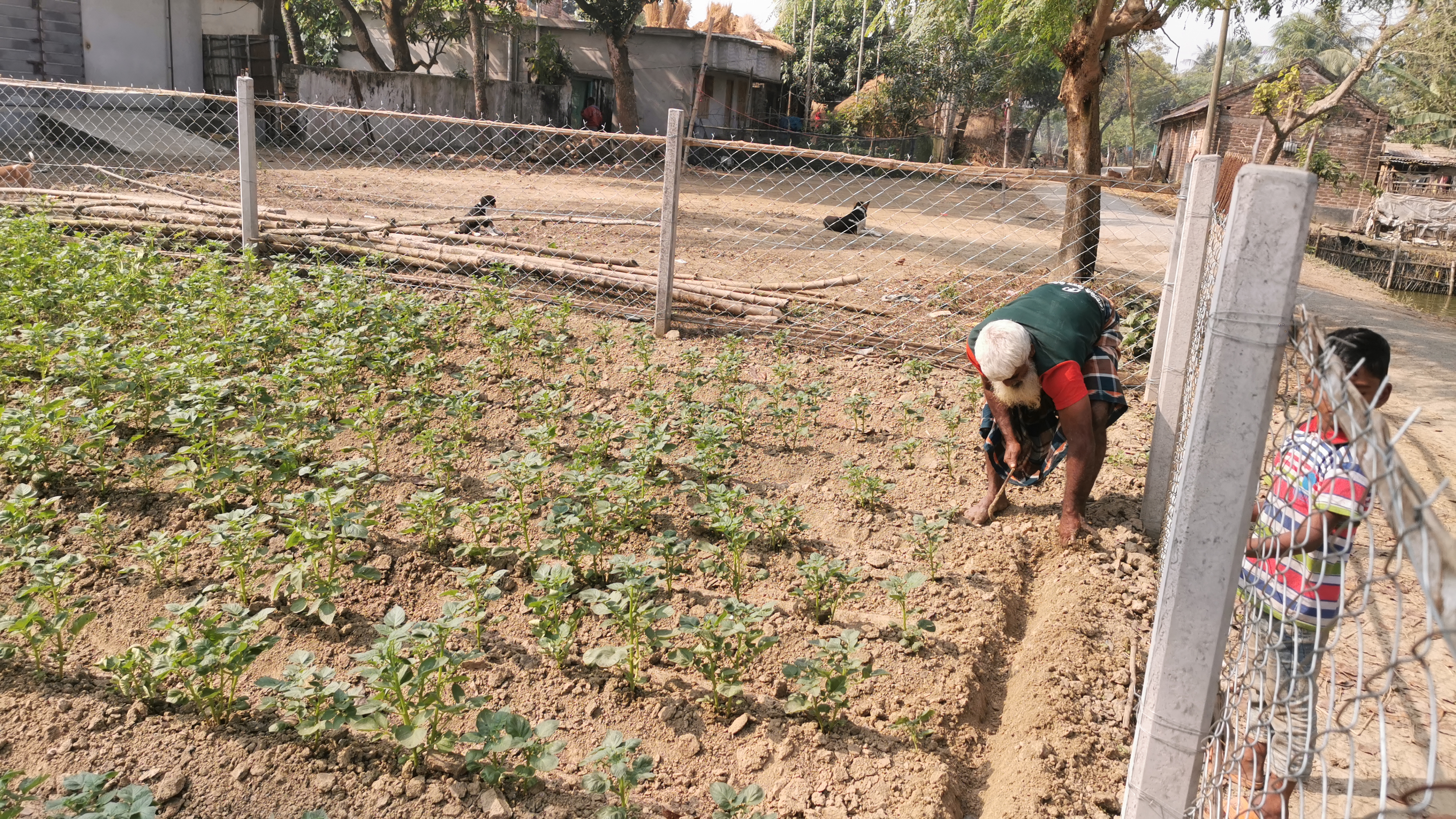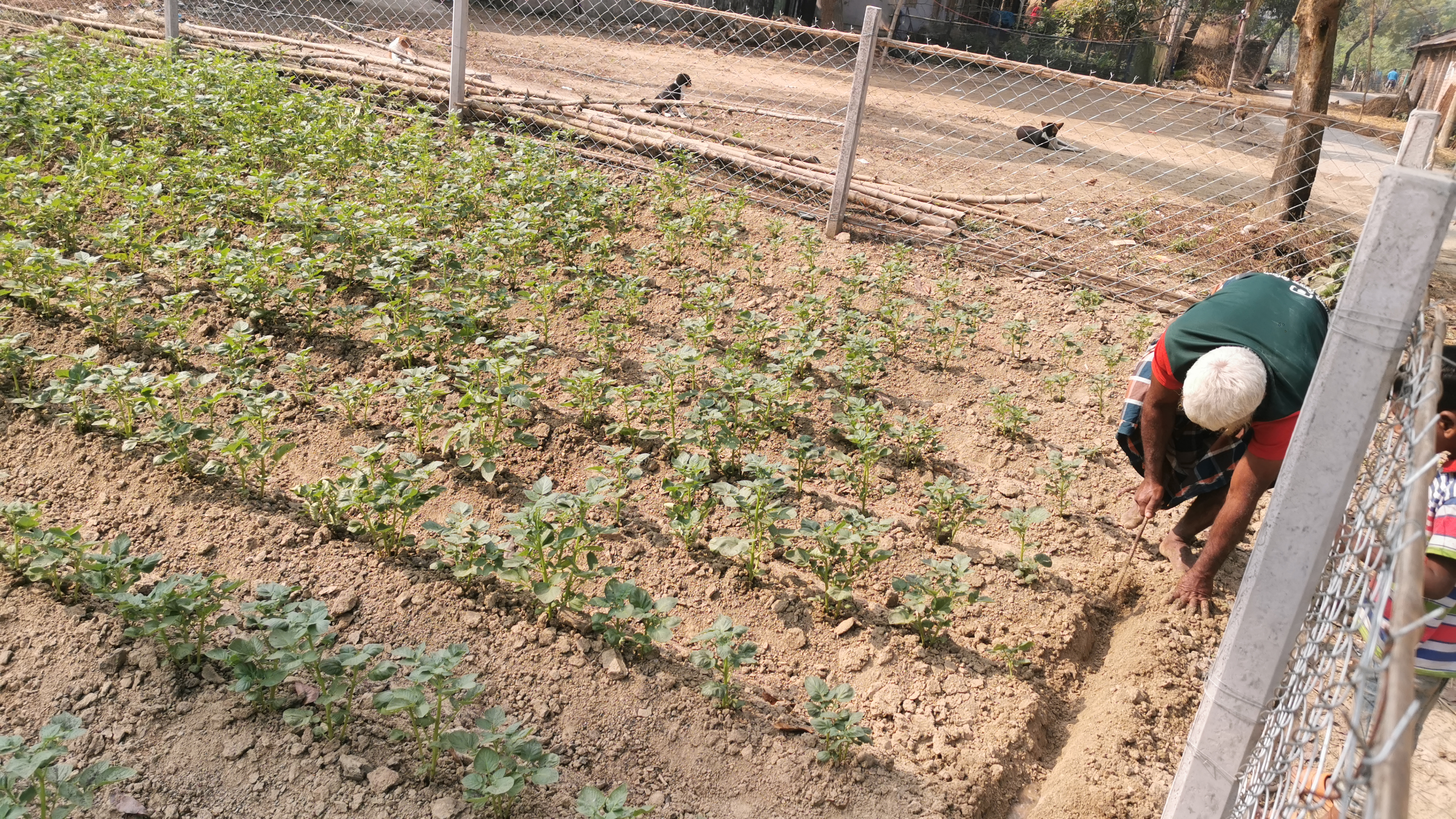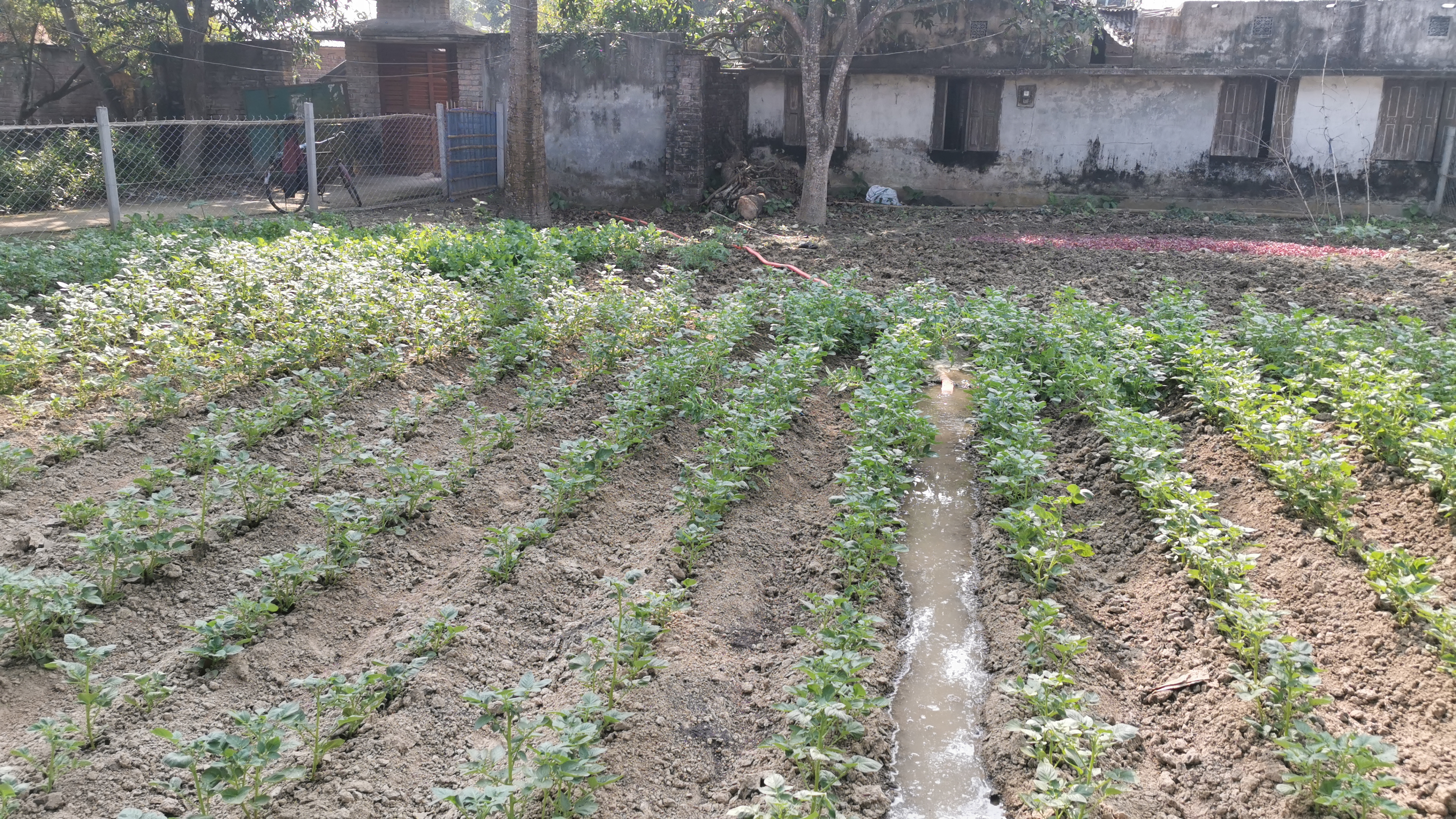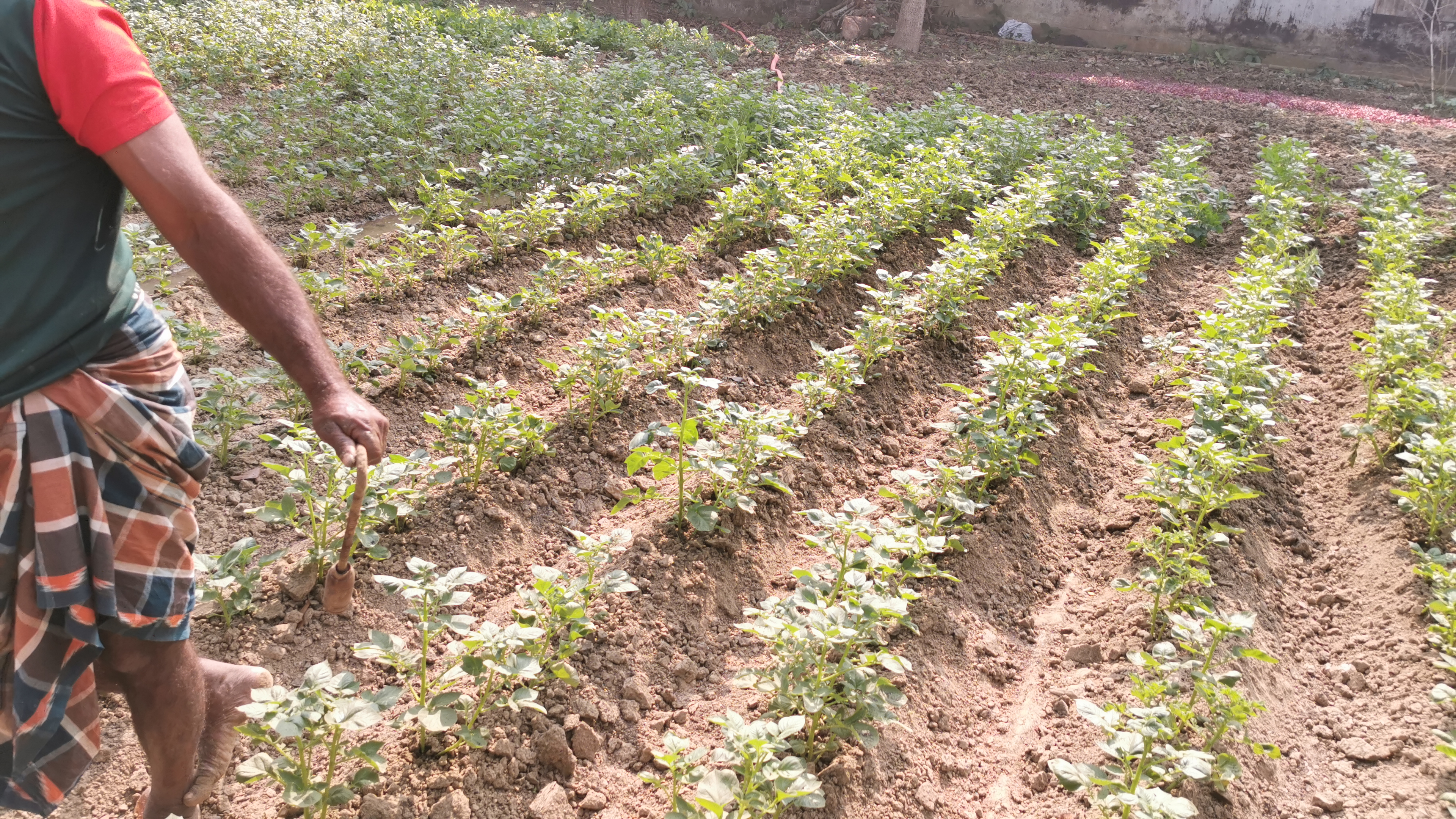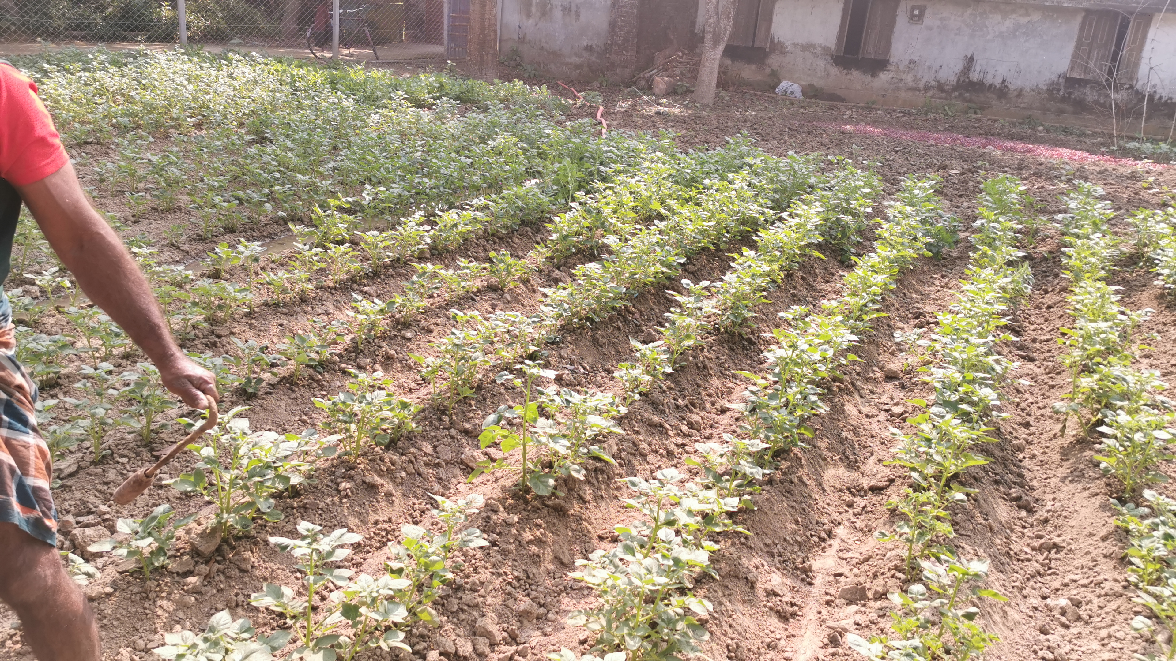 অনেকদিন ধরে লক্ষ্য করে দেখি ভাইয়া বেশ পরিশ্রম করে এই বাগানের মধ্যে। কিন্তু পাশে যেয়ে দেখা হয় না কখনো। একদিন কি মনে হল হঠাৎ করে ছেলে কোলে করে ওখানে গেলাম। আমাদের বাড়ির পরের বাড়িটাই অর্থাৎ আমাদের রাস্তার পাশে পুকুরের পরে এ বাগানটা। কিন্তু সেভাবে ভাইয়ার কাজ গুলো দেখা হয় না আমার। যাইহোক উপস্থিত হয়ে দেখলাম ভাইয়া একদিকে আলুর গাছগুলোর লাইনের মাঝখানের নিড়িয়ে দিচ্ছেন এবং খুব সুন্দর করে আলু গাছগুলো মাটি দিচ্ছেন। ওদিকে মোটরে লাইন থেকে পানি আসছে সেচ হওয়ার জন্য। আর এভাবেই ভাইয়া দীর্ঘক্ষণ রোদ গরমের মধ্যে কাজ করে চলছেন। উনি একনিষ্ঠা এভাবে মুখ বুজে নিজেদের কাজগুলো করতে থাকেন। লক্ষ্য করে দেখলাম সেখানে বাগানের মধ্যে আলু গাছ বেশ সুন্দরভাবে ফুটে উঠেছিল। আমি একটা বিষয় লক্ষ্য করে দেখেছি শীতের সময় আমাদের এই গ্রামে প্রায় মানুষ অনেক রকমের শাকসবজি উৎপাদন করা চেষ্টা করে থাকেন। তবে বাড়িতে এ বিষয়টা শুনতে পেরেছি যে আগে এখান কর মানুষগুলো গ্রামে তত বেশি শাকসবজি উৎপাদন করত না অর্থাৎ পাড়া গায়ে উৎপাদন করত না। তবে এখন খুব শাকসবজি উৎপাদনের জন্য ঝুকে পড়েছে এবং বেশ ভালই উৎপাদন করে থাকে। তবে এই ভাইয়া পুকুর পাড়ে বিভিন্ন জায়গাতে শাকসবজি উৎপাদন করেন। এবার প্রথম পাড়ার মধ্যে উদ্যোগ নিয়েছেন আলু চাষের জন্য।