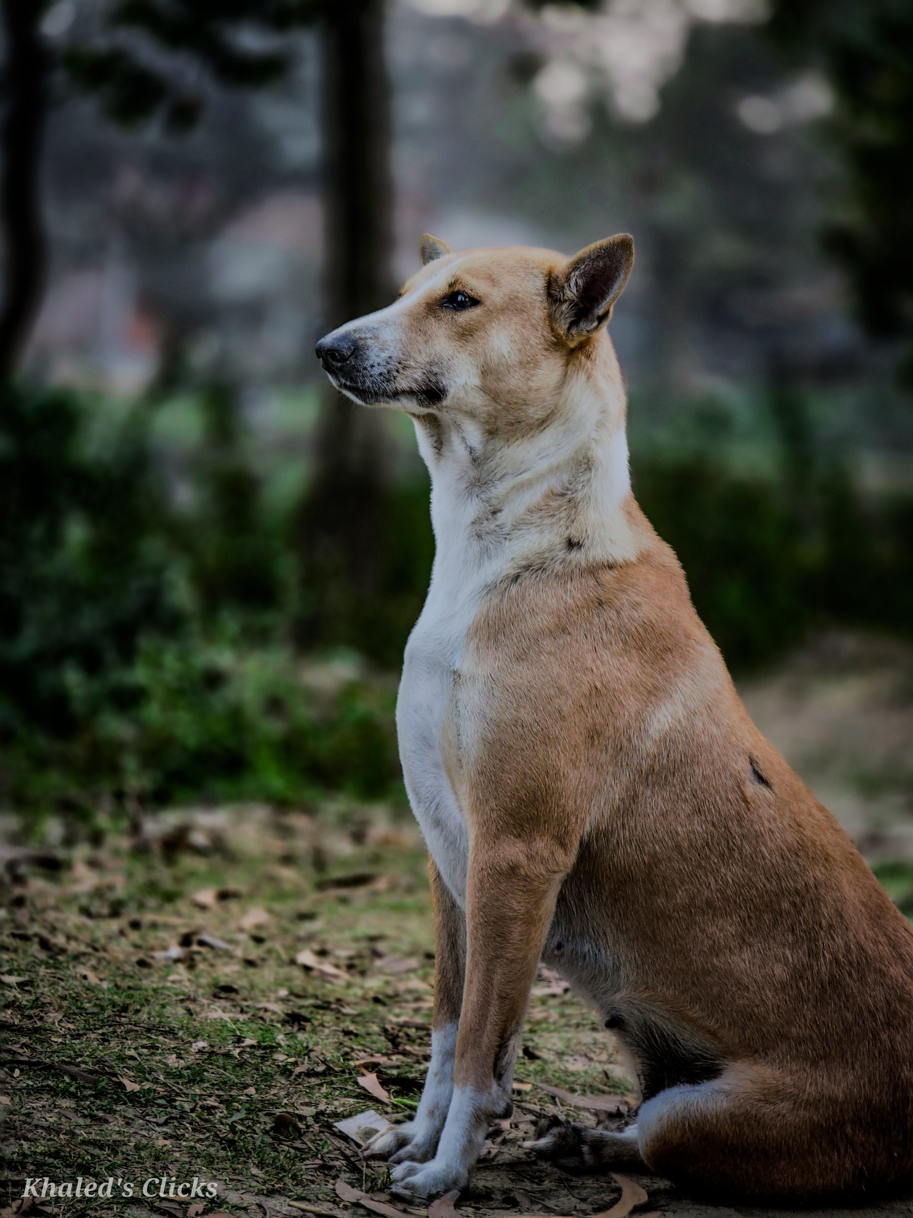 The dog sits proudly like the king of the forest, surveying his domain with quiet grace. His posture shows calmness but also alertness.