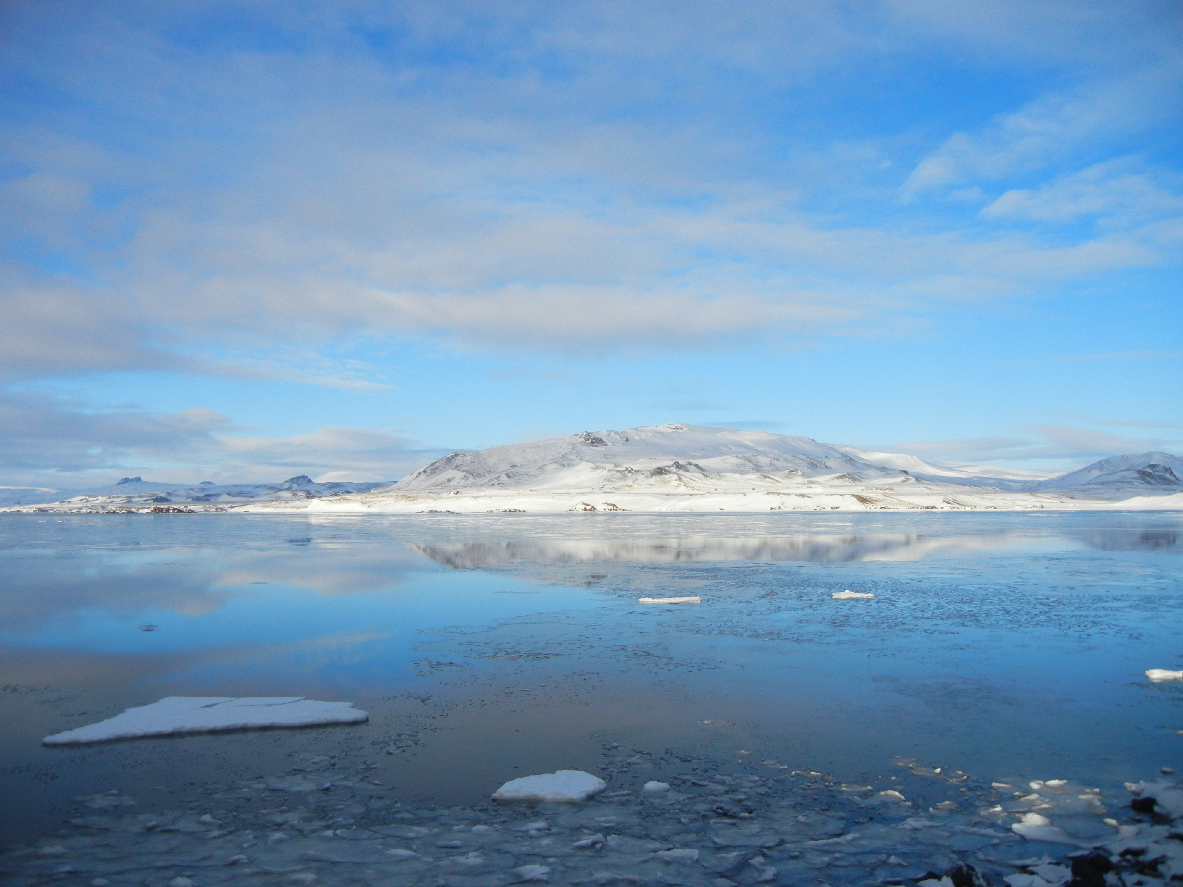 Iceland is a land of many colors. In the summer it's mostly green and black, now in early spring mostly yellow and during winter it was white, which, like in the picture, is beautiful in contrast with the bright blue sky. I really liked how the white mountain mirrors in the calm fjord :)
