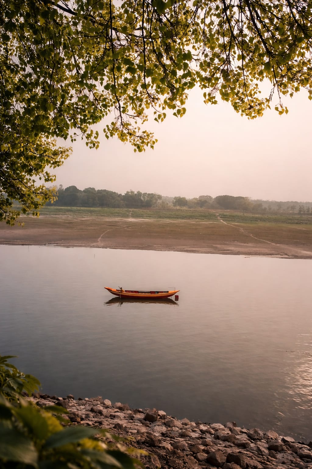 এই ছবিটিতে একটি শান্ত নদীর মাঝে একা একটি নৌকা ভেসে আছে। চারদিকে কোনো কোলাহল নেই, শুধু নিস্তব্ধতা আর প্রকৃতির সৌন্দর্য। উপরের সবুজ পাতাগুলো যেন এই দৃশ্যটিকে আরও জীবন্ত করে তুলেছে।