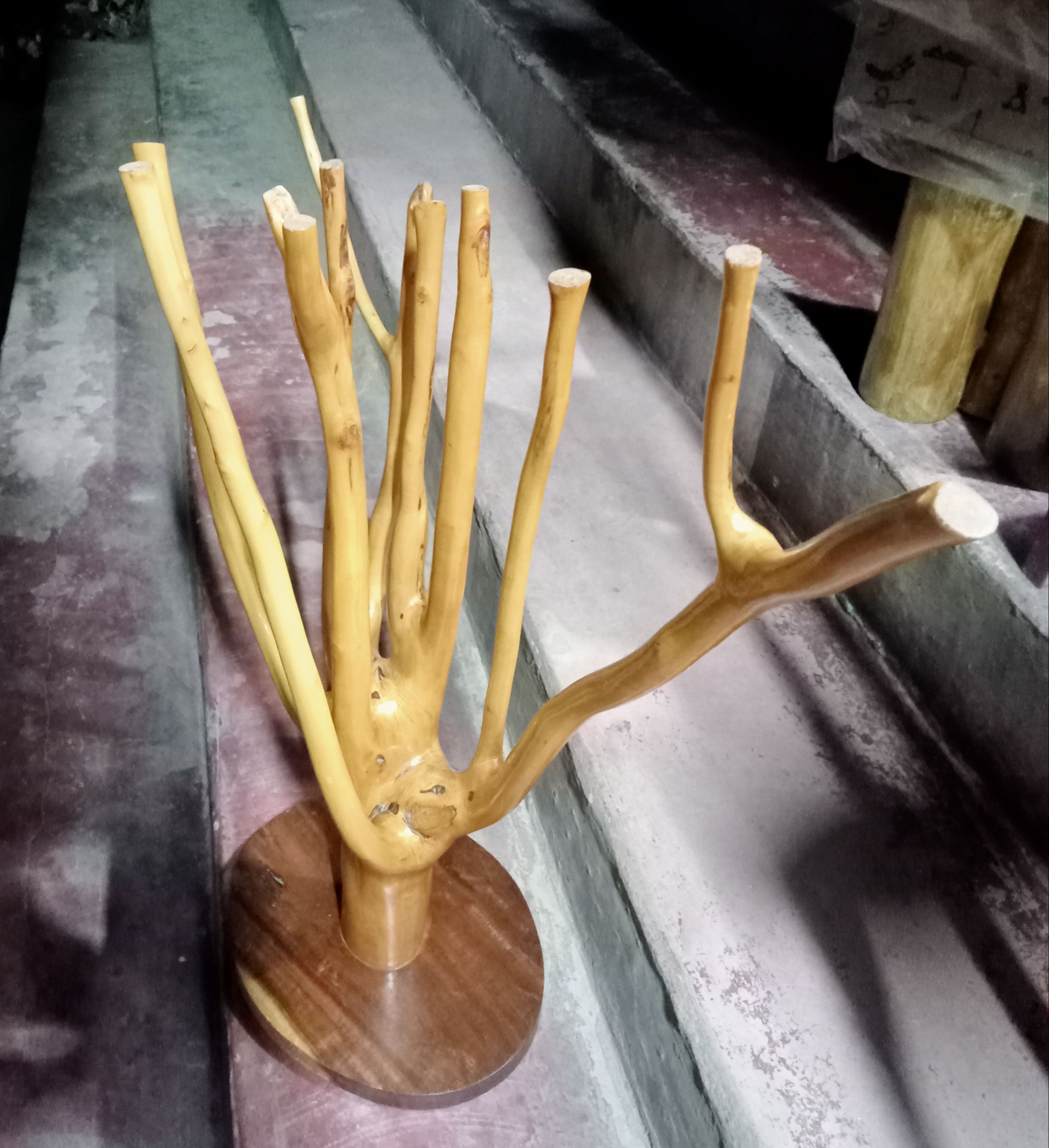 এটি একটি টেবিল স্ট্যান্ড এবং অনেকেই এটির সাথে পরিচিত। আগে দেখতাম মানুষের চা গাছ দিয়ে তৈরী এই ধরনের স্ট্যান্ড অনেক দাম দিয়ে কিনে নিয়ে আসত। দেখতে কিন্তু খুব সুন্দর লাগে। চা গাছগুলোতে বেশিরভাগ এইরকম এলোমেলো ডালপালা থাকে। এগুলোর উপরের অংশ সমানভাবে কেটে গ্লাস সেট করার মত করে তৈরী করে।