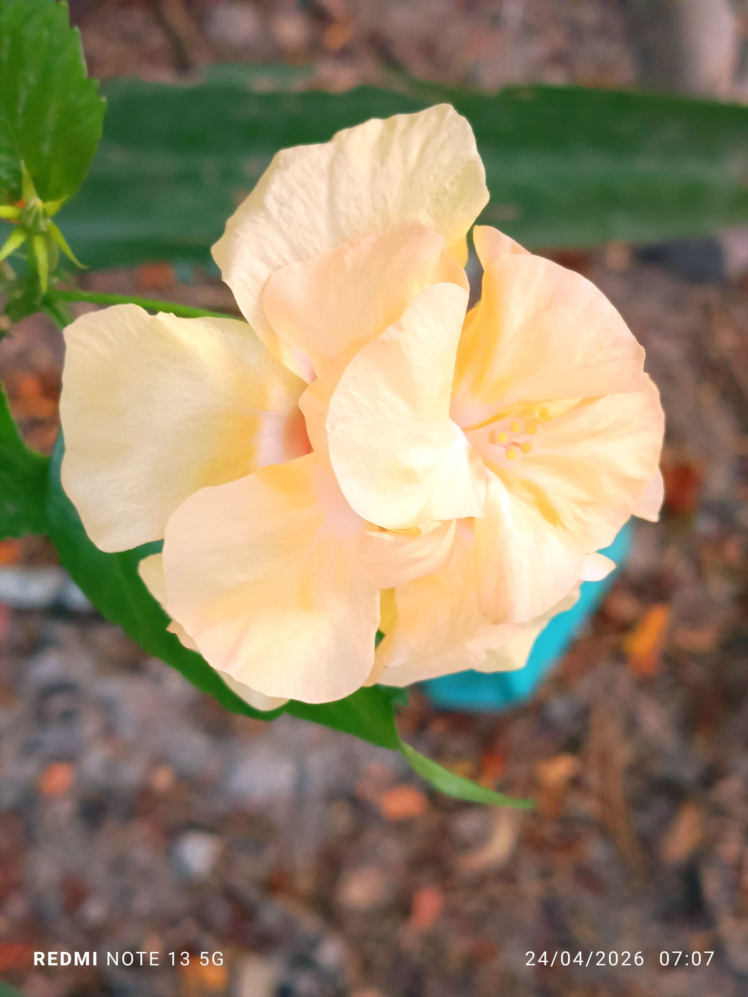 Surrounded by glossy green leaves, the bloom sways quietly in the breeze, carrying a calm, sunlit presence. There is a gentle warmth in its beauty. The peach hibiscus symbolizes affection, gratitude, and the quiet sweetness of heartfelt connection.