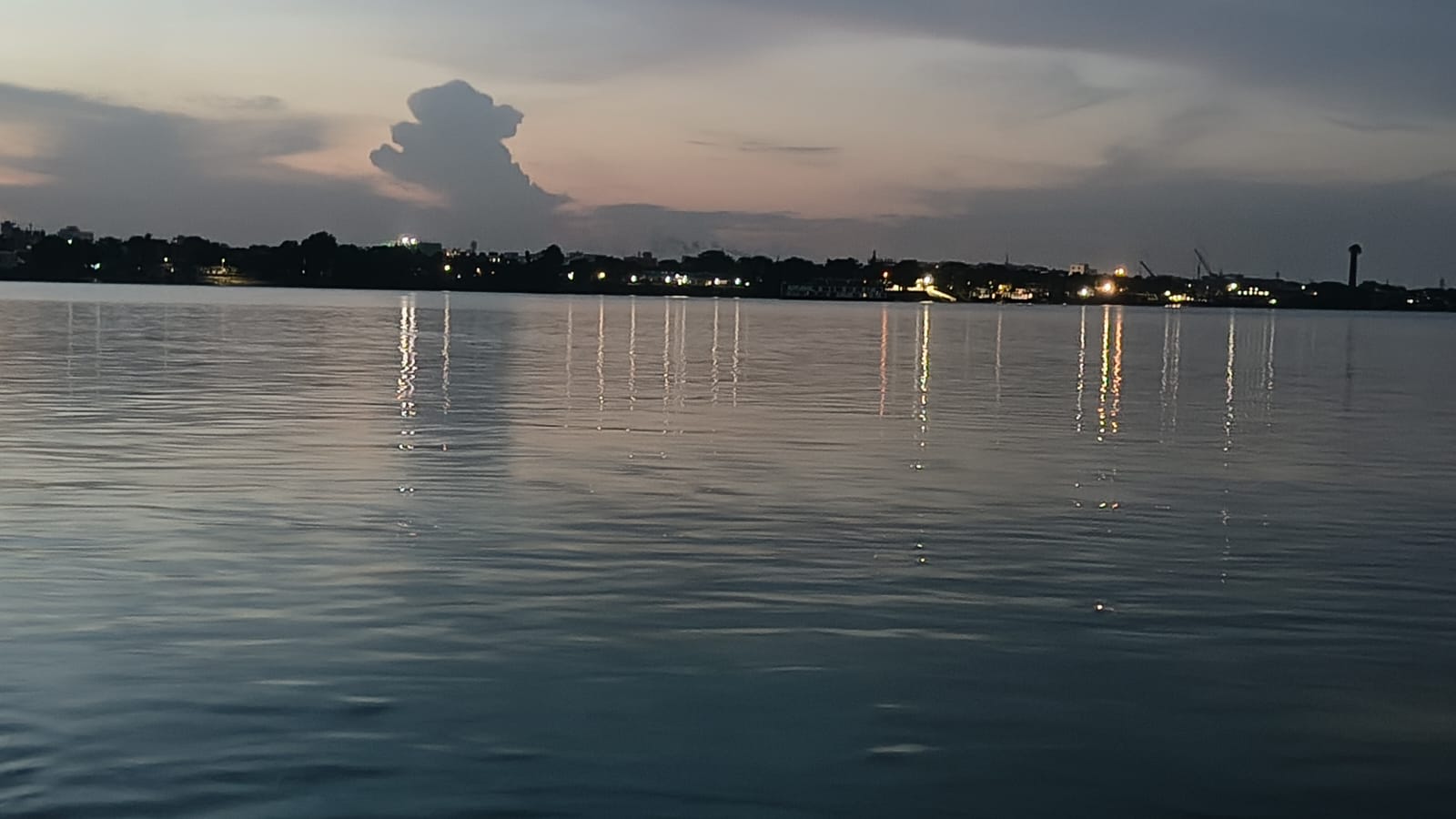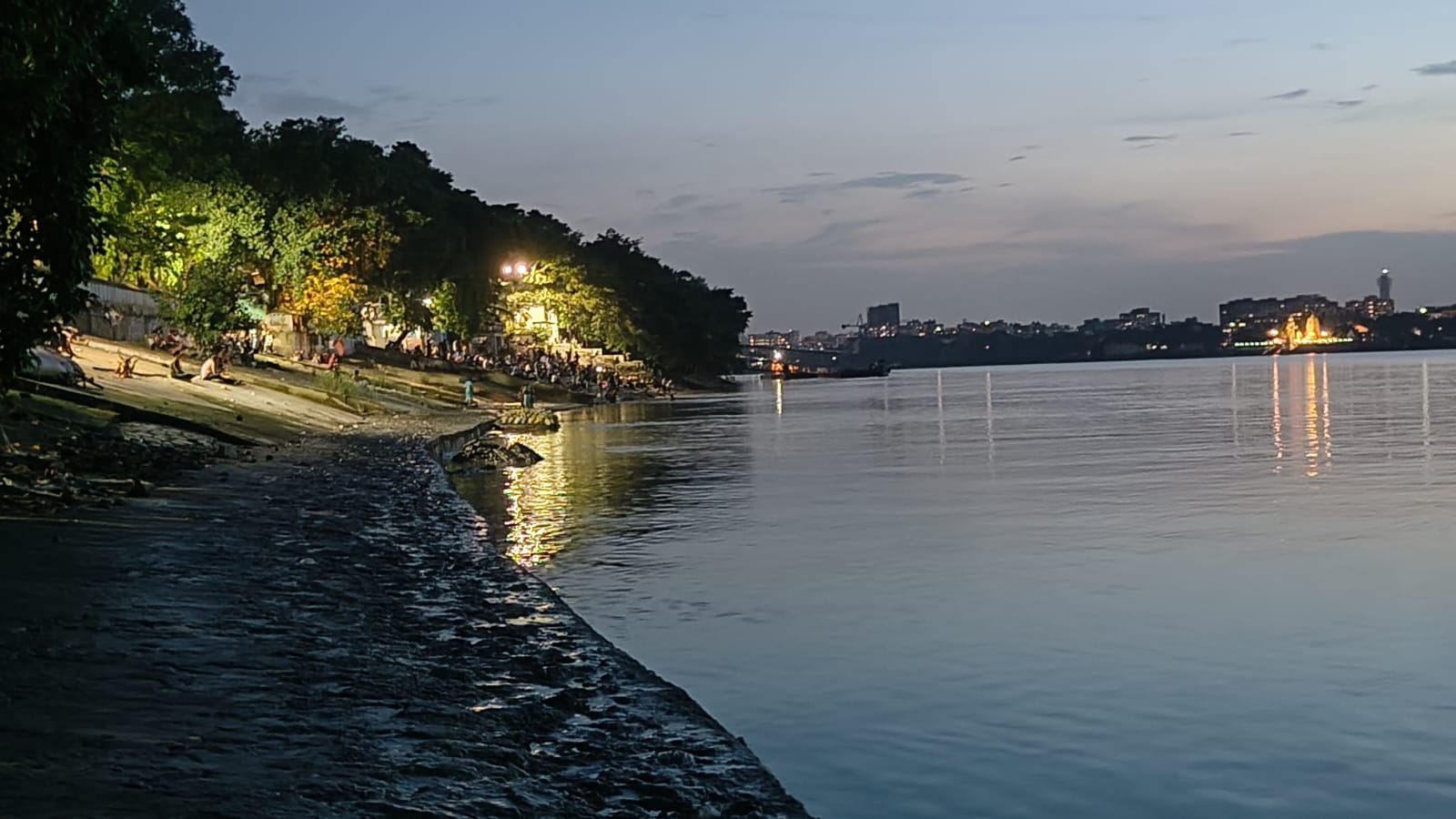 গঙ্গাবক্ষ থেকে গঙ্গার ওপর তীরের শোভা অবলোকন করছি । সন্ধ্যা ঘনিয়ে আসছে । শহরের বুকে তাই হাজার আলোকবর্তিকা ঝিলিমিলি রূপে সেজে উঠেছে । তারই ছায়া পড়েছে গঙ্গার জলে ।