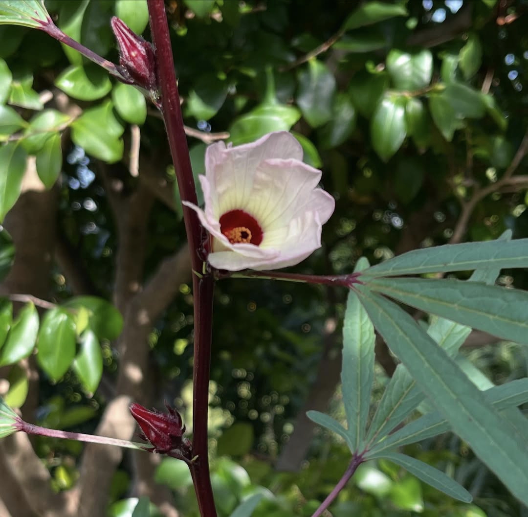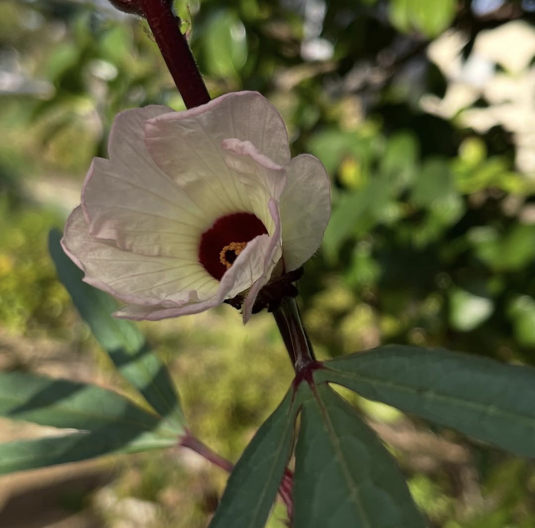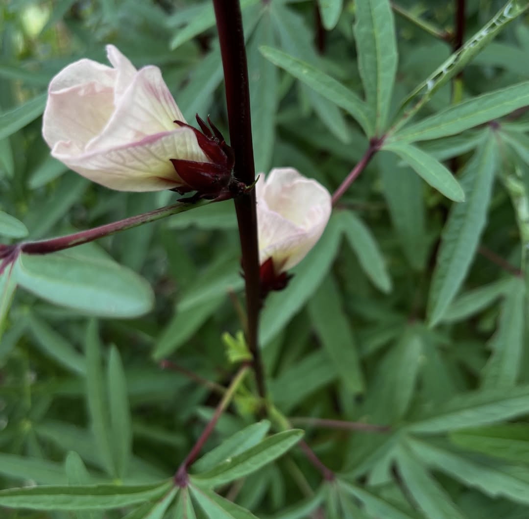 Roselle flower is native to West Africa though it is now cultivated widely in tropical and subtropical regions around the world including Asia the Caribbean and Central America the plant can grow up to 2.5 meters tall and is easily recognized by its striking red stems deeply lobed green leaves and bright calyxes that surround the seed pods the flowers themselves are typically pale yellow or white with a dark red or maroon center blooming during the warm months and lasting only a short time before the fleshy red calyces begin to develop these calyces are the most valued part of the plant harvested after the flowers fade and used extensively for food beverages and traditional medicine.