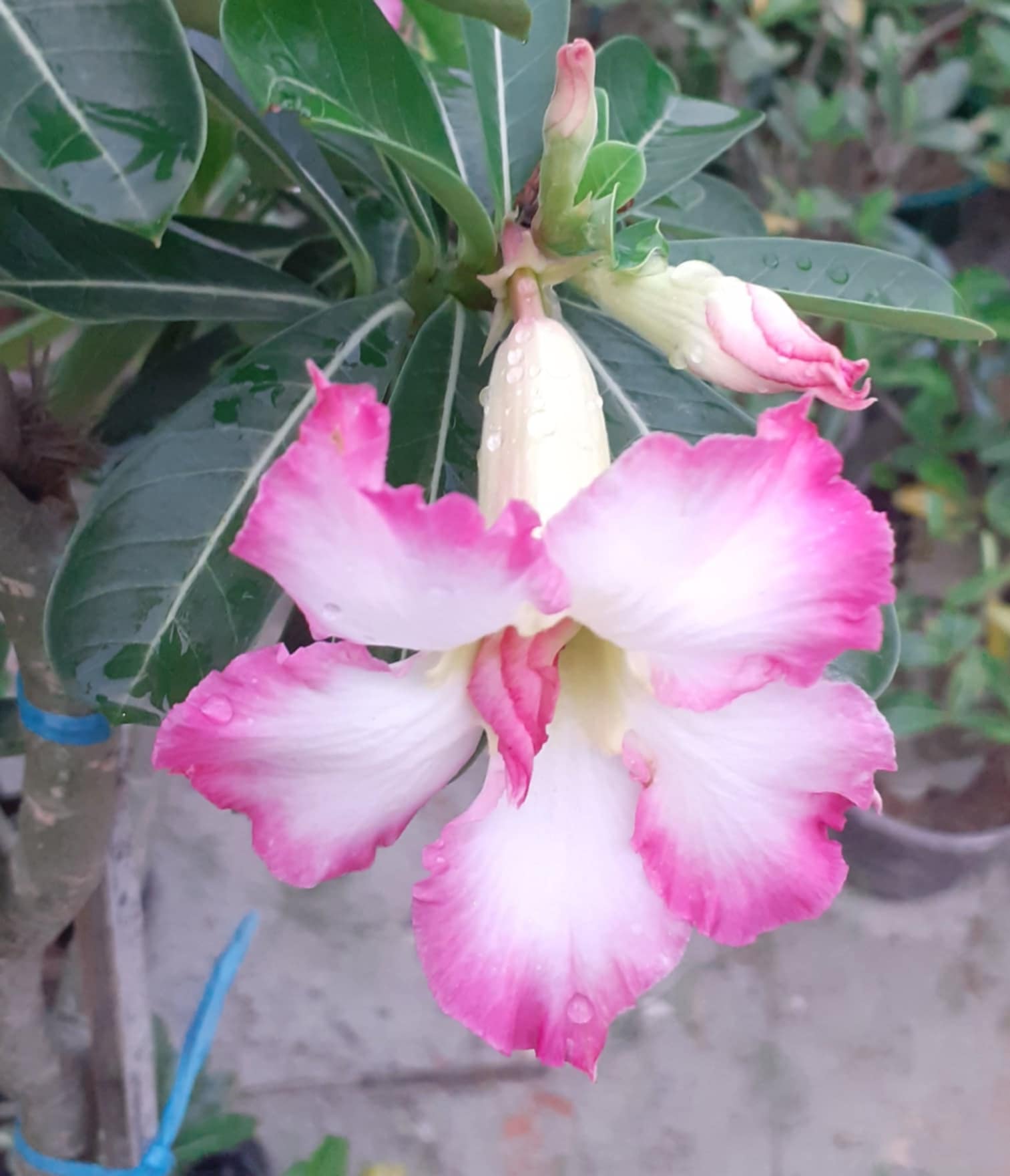 ফুলটি হলো এডিনিয়াম।এডিনিয়াম ফুল লাল,মেরুন, গোলাপী,ঘিয়ে,সাদা,হলদে,নীলাভ সহ বিভিন্ন রং এর দেখতে পাওয়া যায়। এই ফুলকে মরুভুমির গোলাপও বলা হয়।ম্রুভূমির মতো পরিবেশে টিকে থাকতে পারে বলে একে মরুভূমির গোলাপ বলা হয়। এর ইংরেজি নাম ডেজার্ট রোস।বর্ষাকালে এই ফুল বেশি ফোটে তবে সারা বছরই এই ফুল ফুটতে দেখা যায়।আজকাল বানিজ্যিকভাবে এ ফুলের গাছ বেশ চাষ চোখে পরে।
