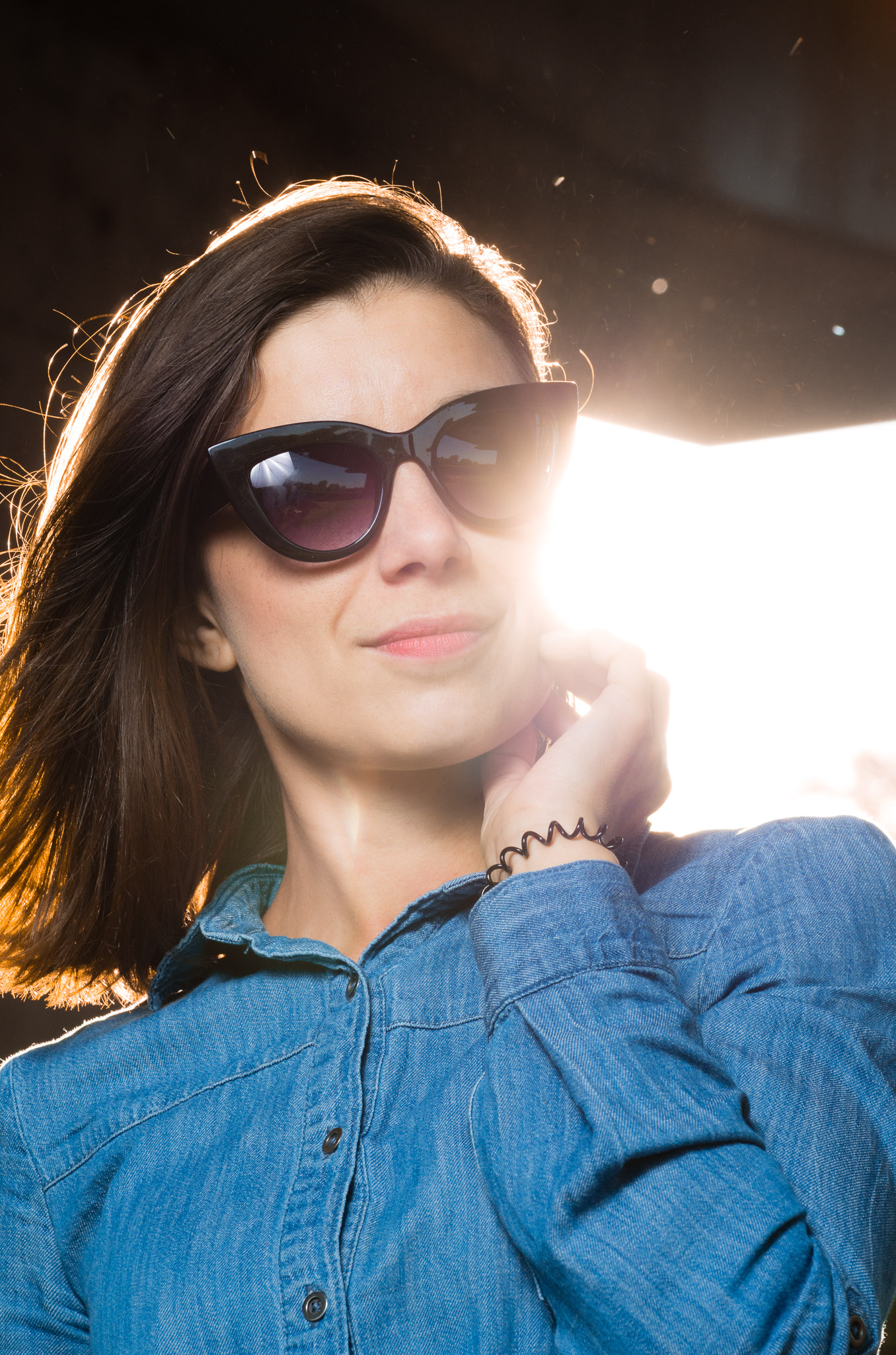 Sunlight as rimlight and one umbrella with a speedlite as main light.