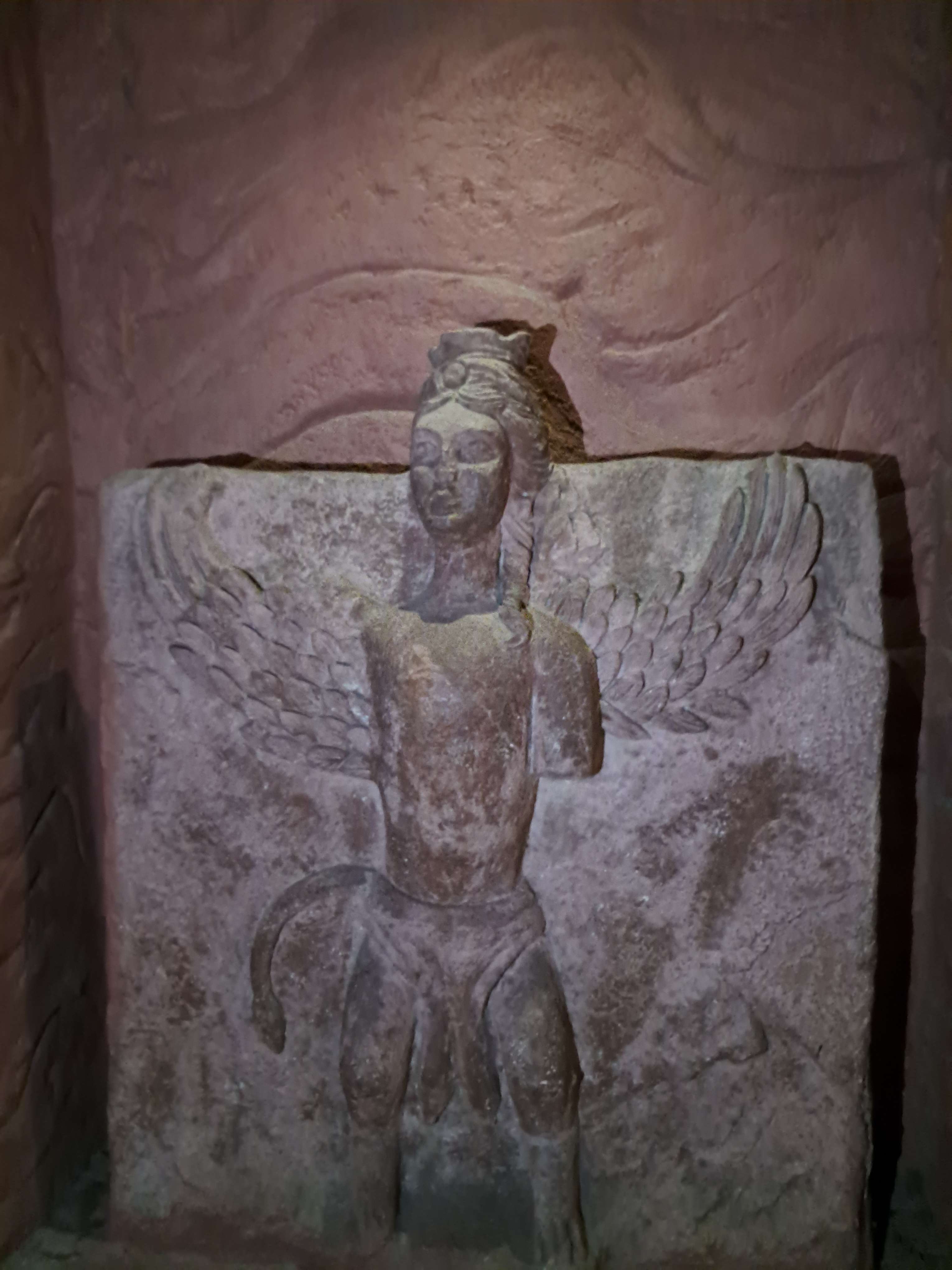 এমন এমন কিছু শিল্পকর্ম থাকে, যেগুলো নীরবতার মধ্যে থাকে আর এই নীরবতার মাঝেই যেনো লুকিয়ে থাকে এক শতাব্দীর গল্প। এখানে এই পাথরের মূর্তিটি খোদাই করে একটি মানবমূর্তির মতো তৈরী করেছে। মানুষের মতো দেখতে তৈরী করলেও যেনো আসলে তার থেকেও অনেক কিছু আছে এই মানব মূর্তির মধ্যে। এই মানব মূর্তির মতো দেখতে দৃশ্যে আবার একটা ডানার প্রয়োগ করা হয়েছে। এছাড়া এখানে মূর্তির চেহারায় যেনো অদ্ভূত কিছু দৃশ্য ফুটিয়ে তোলা হয়েছিলো। যেমন এখানে মুখের দিকে লক্ষ্য করলে একটা অদ্ভূত প্রশান্তির মতো লাগবে আবার তার চোখ দুটি বন্ধ করে ফুটিয়ে তোলা হয়েছে।