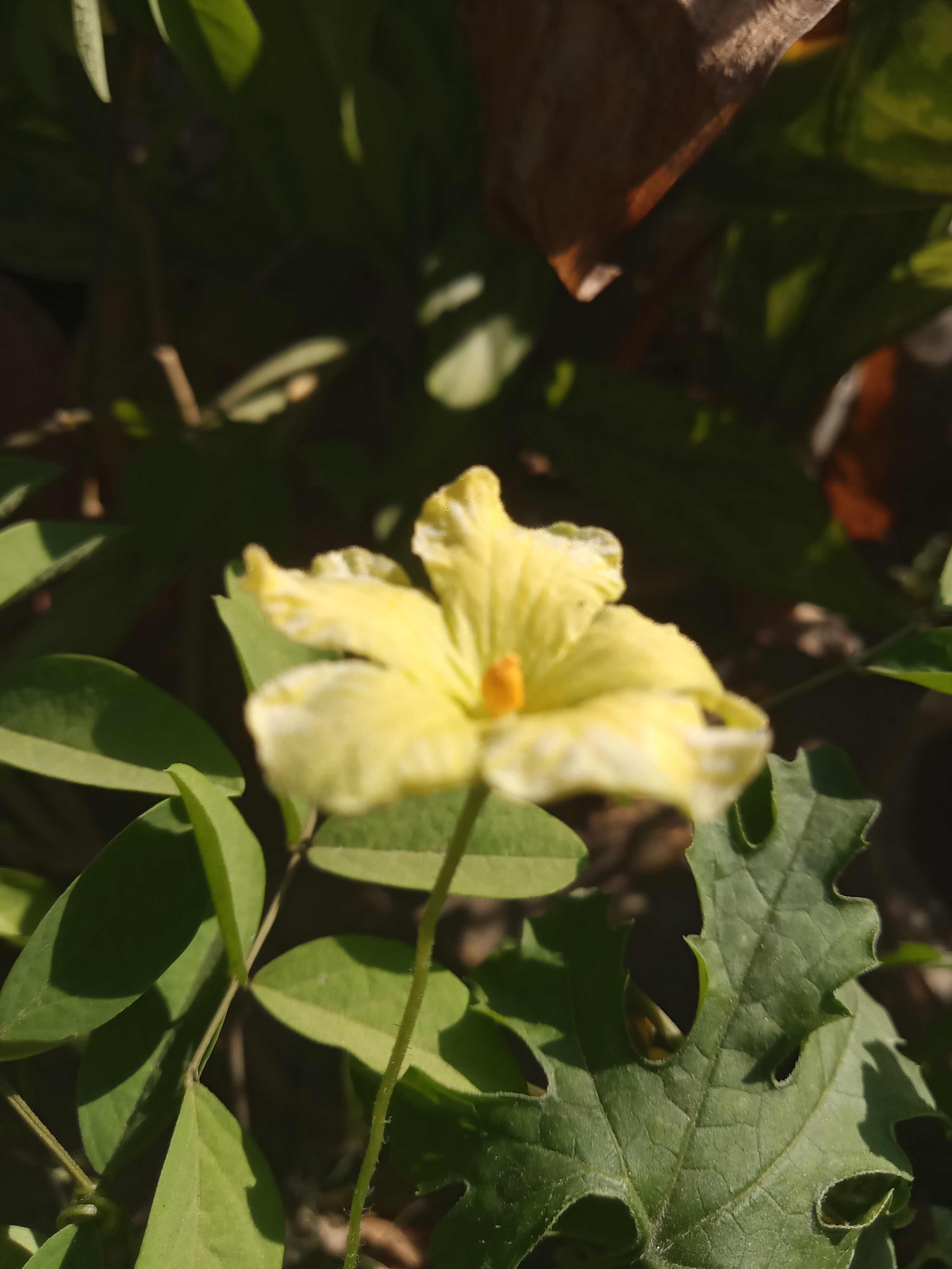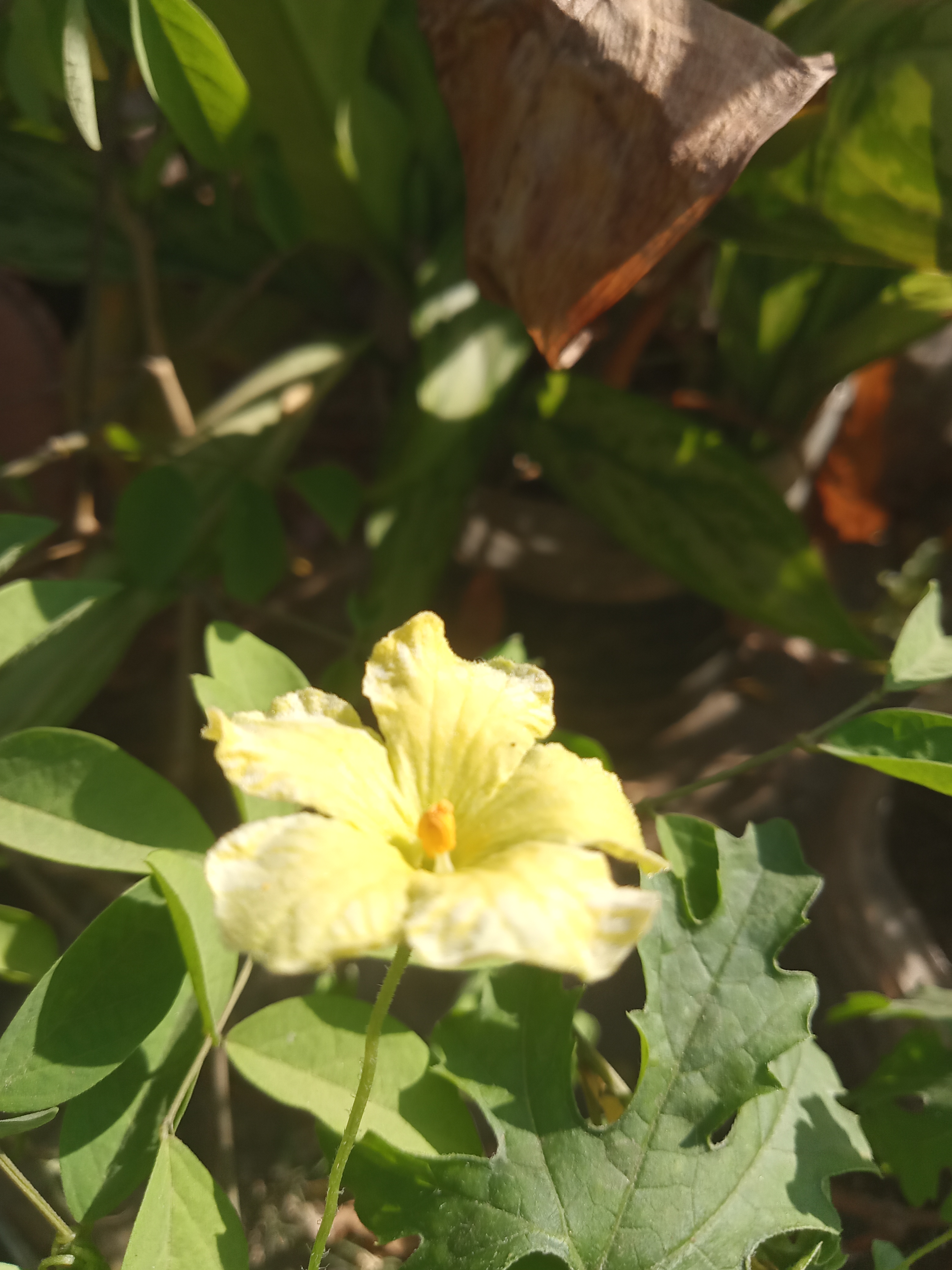 This beautiful flower is the bitter gourd plant's flower. Orange in the middle of this flower with yellow petals. The flower looks very